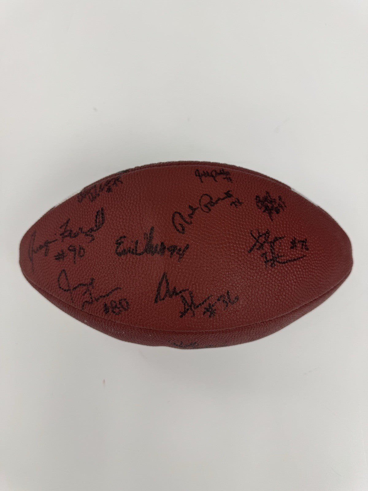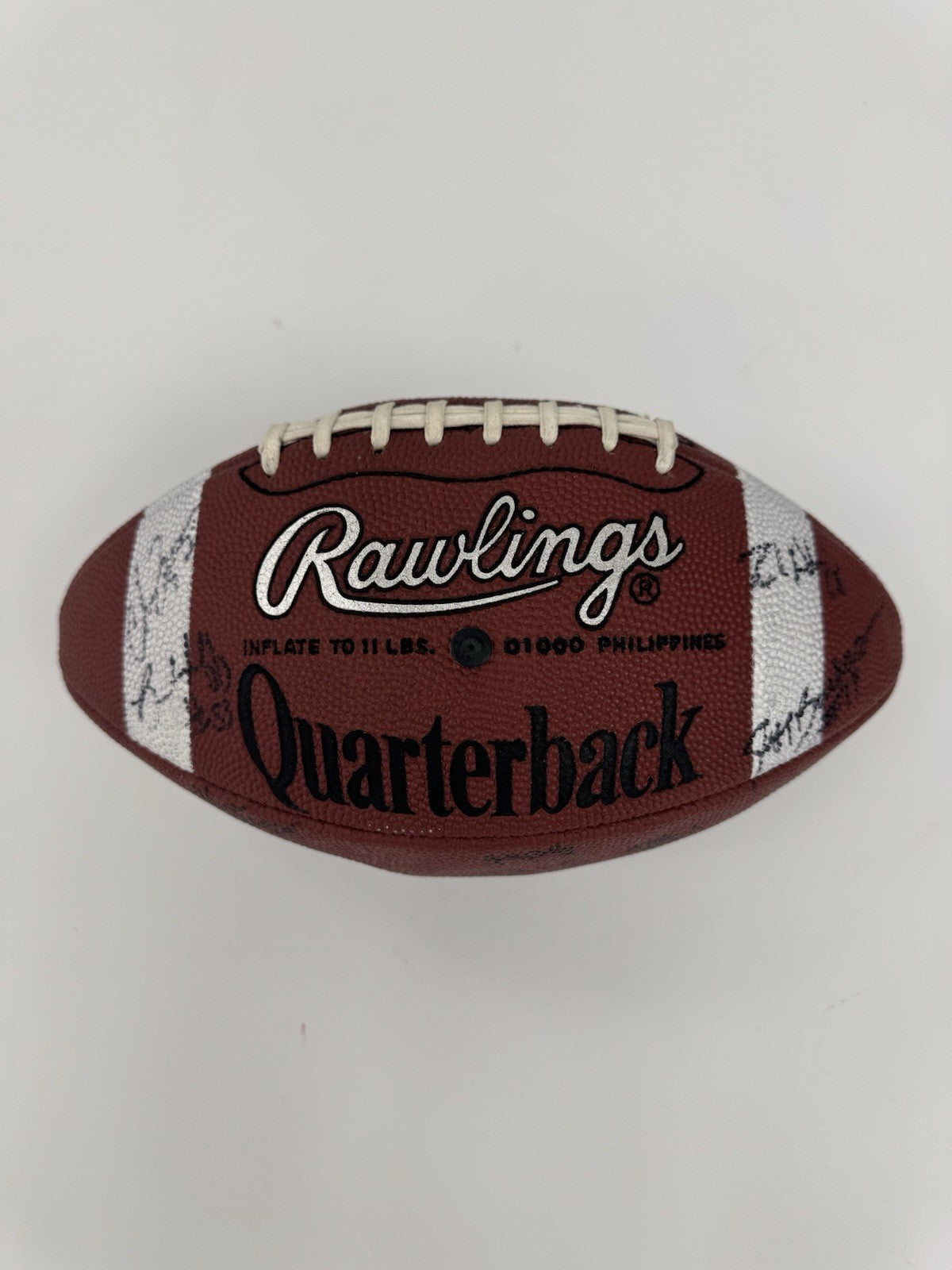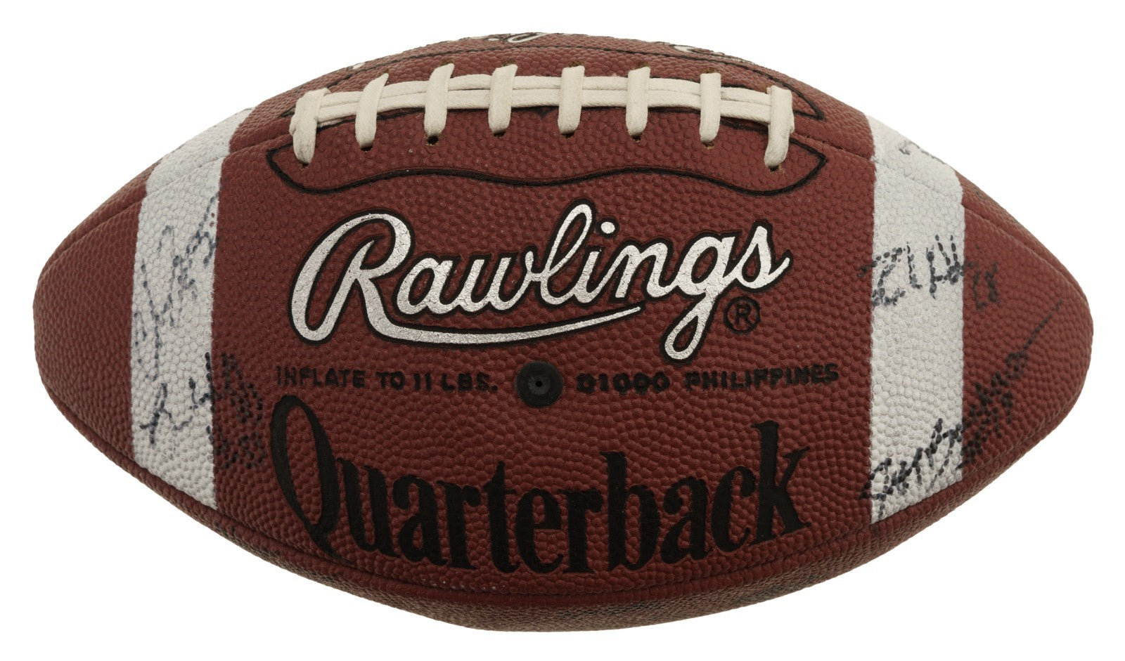 Official Rawlings C5 NCAA College Quarterback Football signed in black marker by 25 members of the 1997 Michigan Wolverines National Champion team. Notable signatures include Charles Woodson, Tom Brady, Jermane Tuman, Chris Howard, Steve Hutchinson, Aaron Shea, Juaquin Feazell, Jon Jansen, Nate Miller, Josh Williams, Terrence Quinn, Rob Renes, and Ryan Parini. Full LOA from James Spence/JSA.