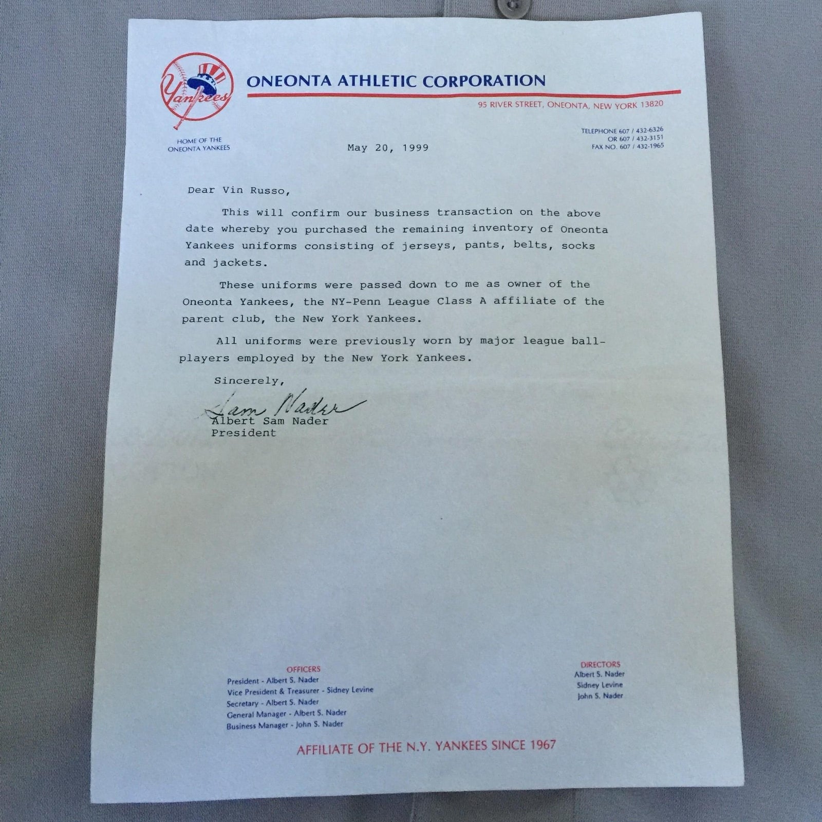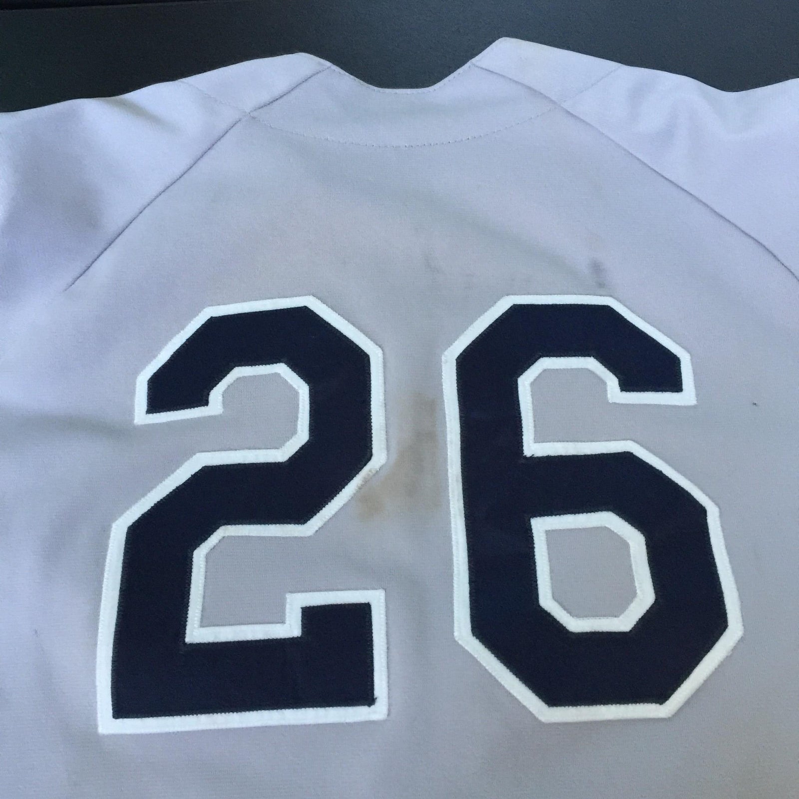 This gray button-up jersey reads "New York" on the front in blue letters with white trim and has "26" on the back in the same colors, and is attributed to Orlando Hernandez, who played minor league ball with the Oneonta Yankees affiliate during the 1999 season. The jersey arrives with a letter from the Oneonta Yankees dated May 20, 1999 and signed by team president Sam Nader. The LOA reads in part, "These uniforms were passed down to me as owner of the Oneonta Yankees, the NY-Penn League Class A affiliate of the parent club, the New York Yankees. All uniforms were previously worn by major league ball-players employed by the New York Yankees." The jersey shows nice game use in the form of scattered stains and light pilling.
