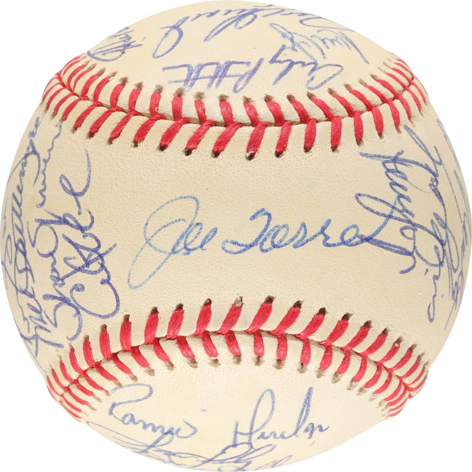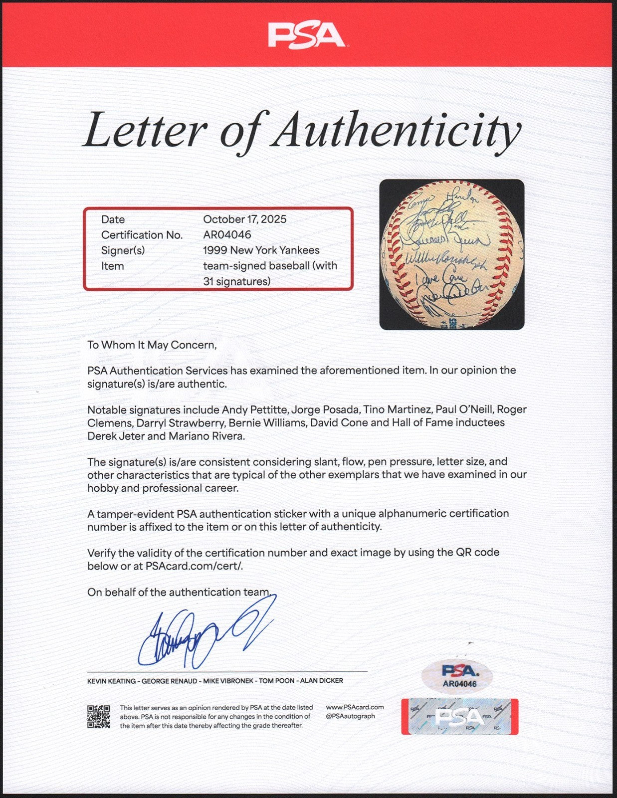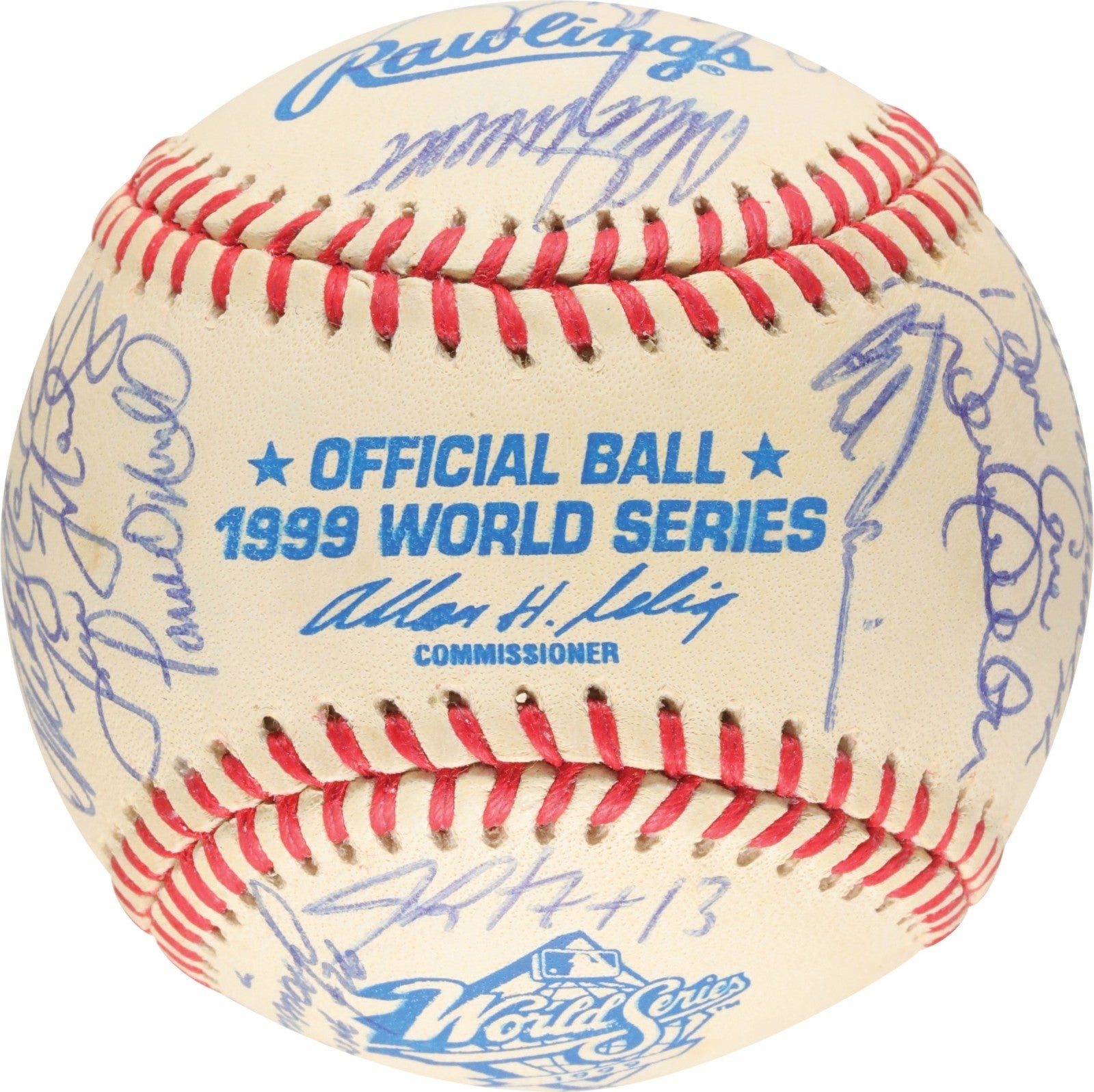 Official 1999 World Series baseball signed in blue ink by thirty-one members of the 1999 World Champion New York Yankees, including Jeter, Torre (Mgr., sweet spot), Rivera, Cone, O'Neill, Martinez, Stanton, Nelson, Girardi, Pettitte, Hernandez, Clemens, Brosius, Knoblauch, Spencer, Strawberry, Williams, Pettitte, Zimmer (coach), Randolph (coach), Stottlemyre (coach), Chambliss (coach), and Leyritz. Near Mint to Mint condition. Full LOA from PSA.