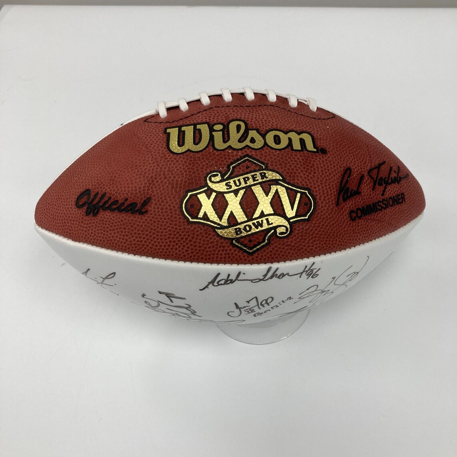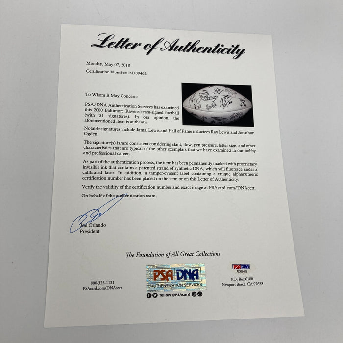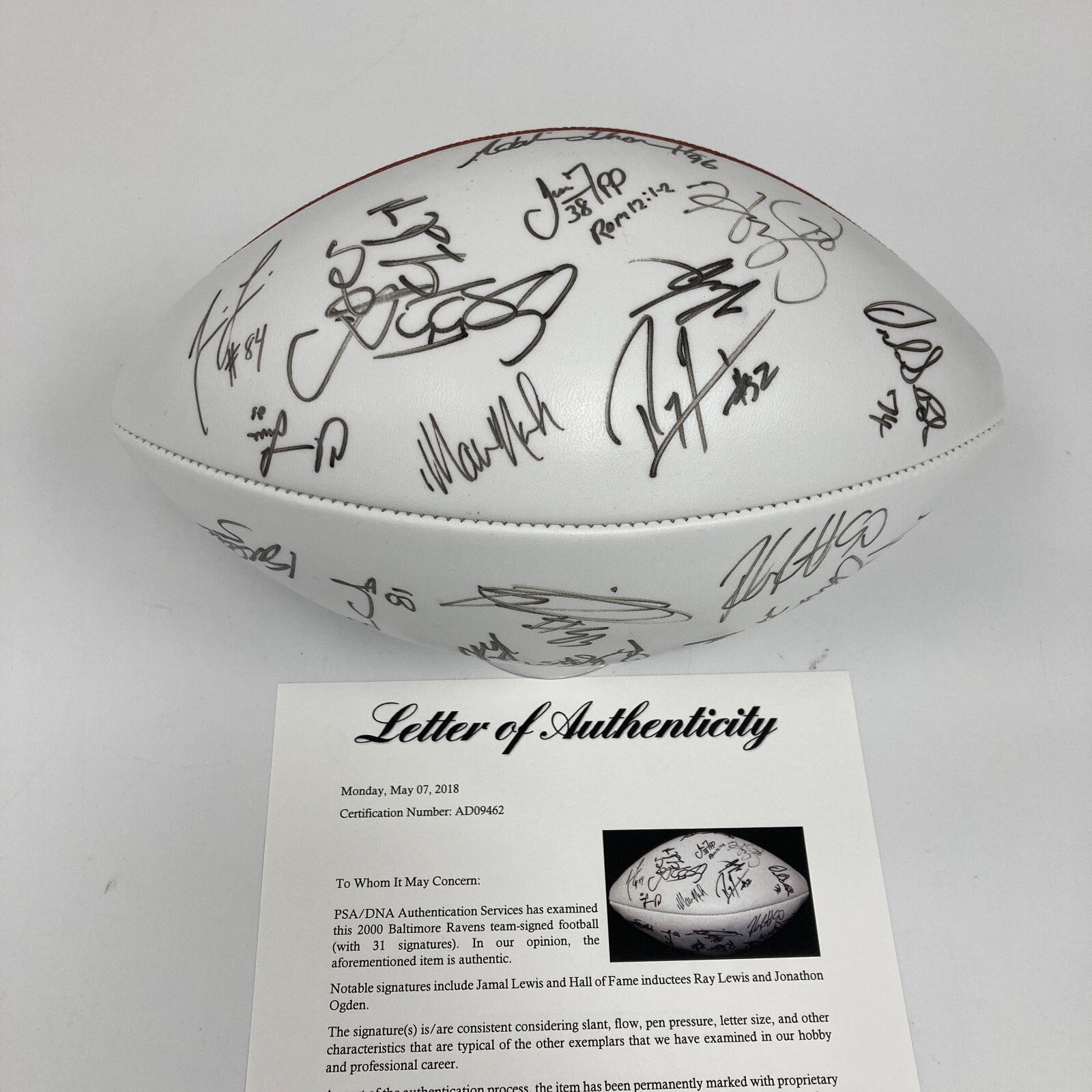 2000 Balt Ravens Team-Signed SB XXXV White Panel Football. PSA/DNA AD09462. Item has 31 signatures including Jamal Lewis, Ray Lewis, and Jonathan Ogden. Item comes with matching certificate. Item is certified by PSA/DNA with full letter COA. Football is fully inflated and holds air.