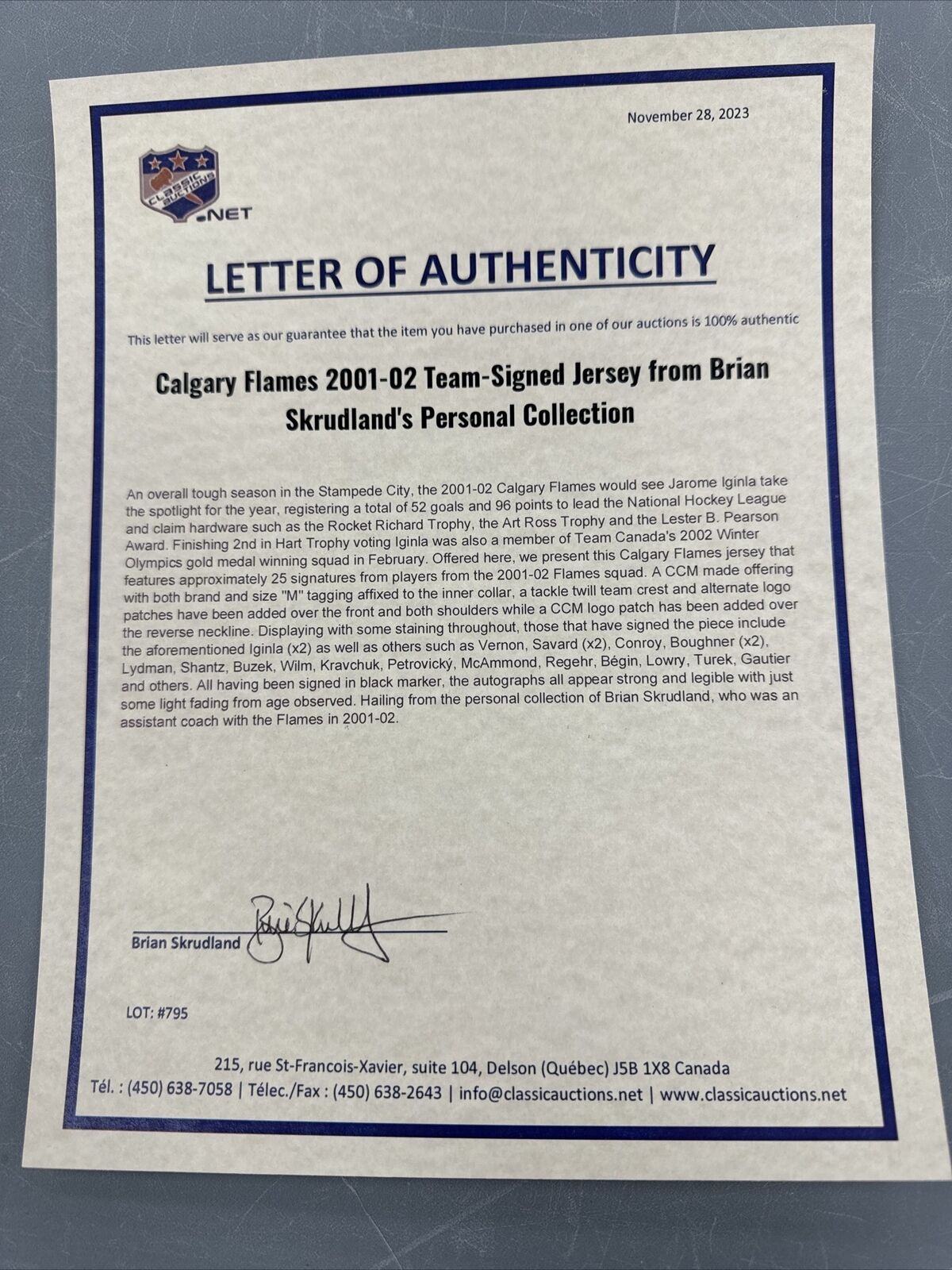 An overall tough season in the Stampede City, the 2001-02 Calgary Flames would see Jarome Iginla take the spotlight for the year, registering a total of 52 goals and 96 points to lead the National Hockey League and claim hardware such as the Rocket Richard Trophy, the Art Ross Trophy and the Lester B. Pearson Award. Finishing 2nd in Hart Trophy voting Iginla was also a member of Team Canada's 2002 Winter Olympics gold medal winning squad in February. Offered here, we present this Calgary Flames jersey that features approximately 25 signatures from players from the 2001-02 Flames squad. A CCM made offering with both brand and size "M" tagging affixed to the inner collar, a tackle twill team crest and alternate logo patches have been added over the front and both shoulders while a CCM logo patch has been added over the reverse neckline. Displaying with some staining throughout, those that have signed the piece include the aforementioned Iginla (x2) as well as others such as Vernon, Savard (x2), Conroy, Boughner (x2), Lydman, Shantz, Buzek, Wilm, Kravchuk, Petrovický, McAmmond, Regehr, Bégin, Lowry, Turek, Gautier and others. Hailing from the personal collection of Brian Skrudland, who was an assistant coach with the Flames in 2001-02, an LOA signed by him will accompany the piece.