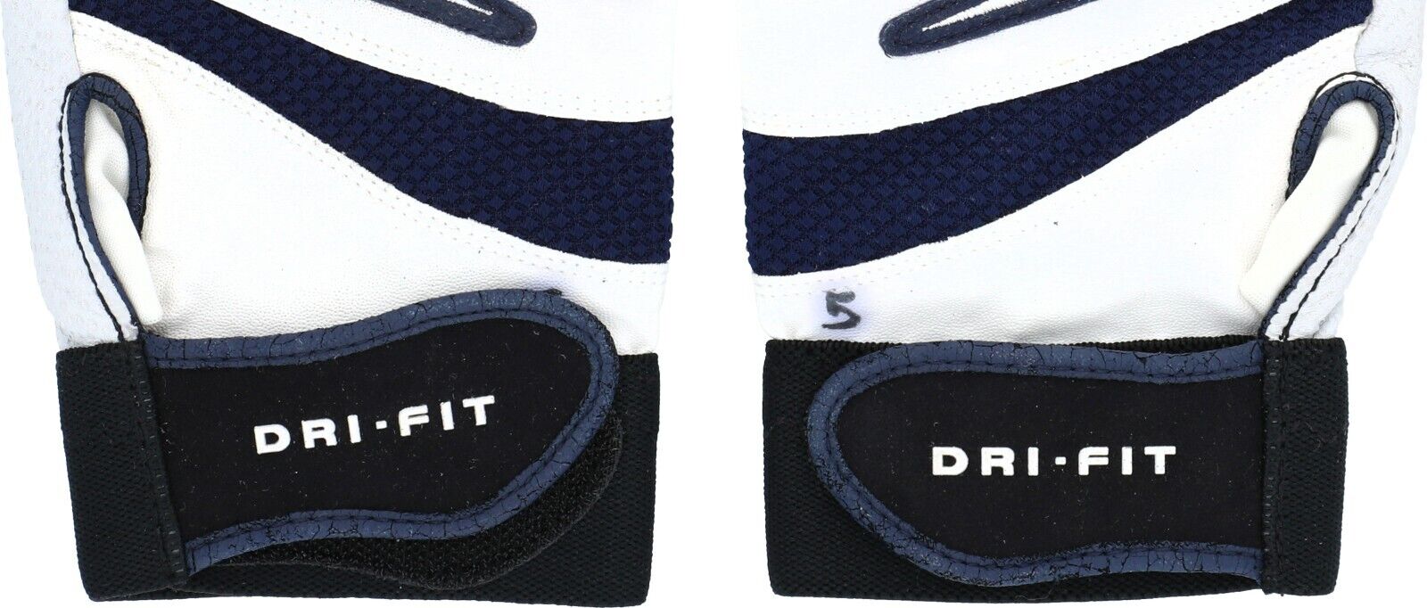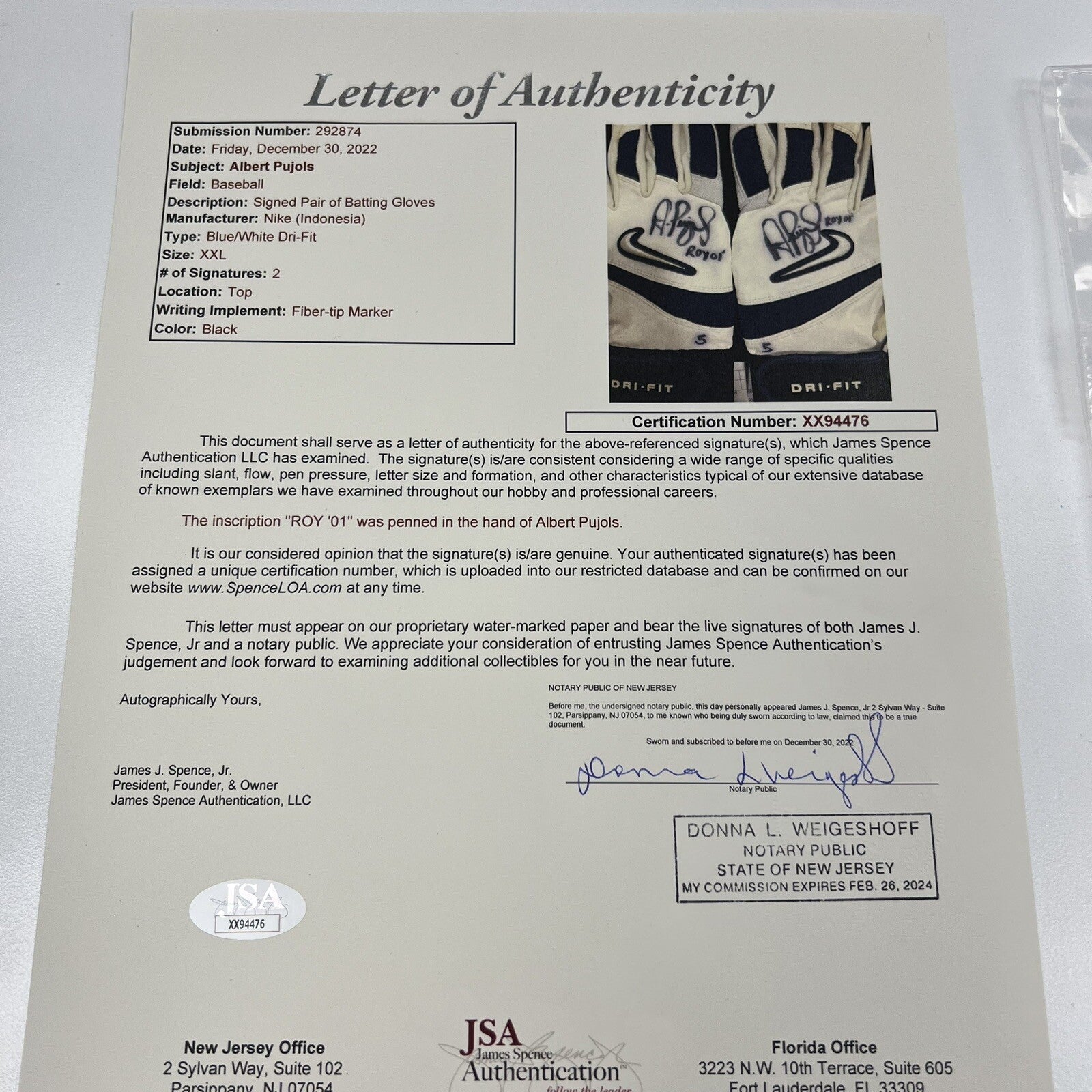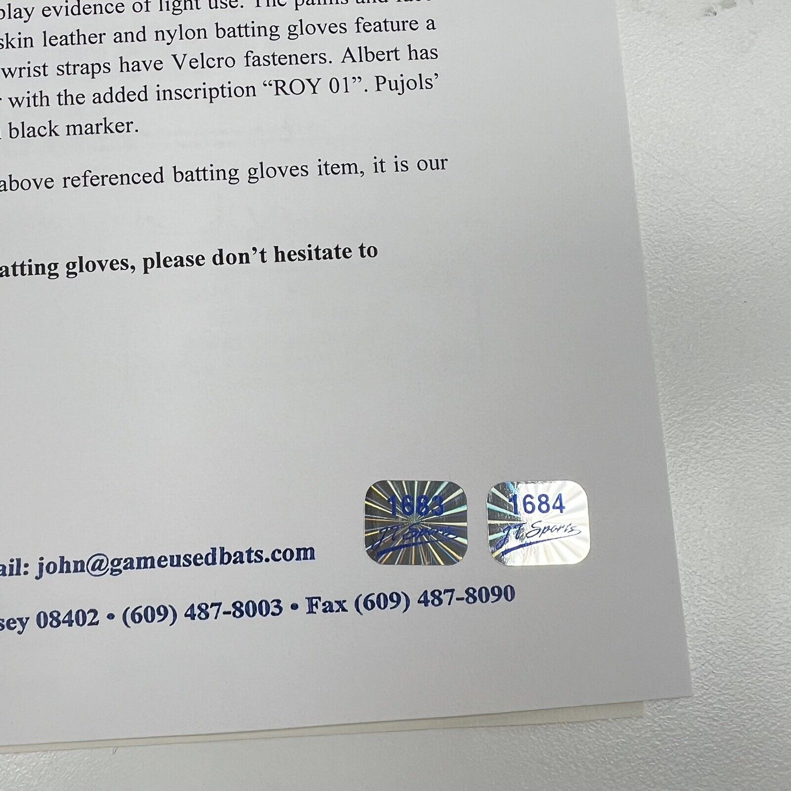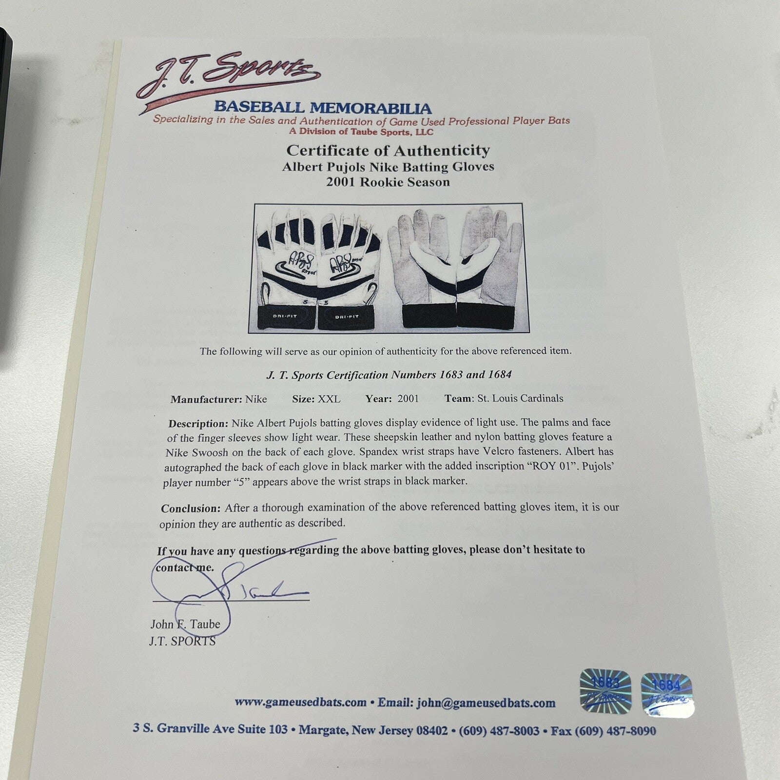 Presented is a pair of Nike size XXL white batting gloves used by Pujols during his NL Rookie of the Year season in 2001. These gloves display nice game use, with the palms and face of the fingers displaying light wear. The gloves are made of sheepskin leather and nylon and feature a Nike "swoosh" on the back of each glove in silver and dark blue. The Spandex wrist straps have Velcro fasteners and Pujols has signed each of these gloves in black marker on the top hands, inscribing "ROY 01." These gloves come with an LOA from J.T. Sports (1683, 1684) for the game use, along with an LOA from JSA for the signature.
