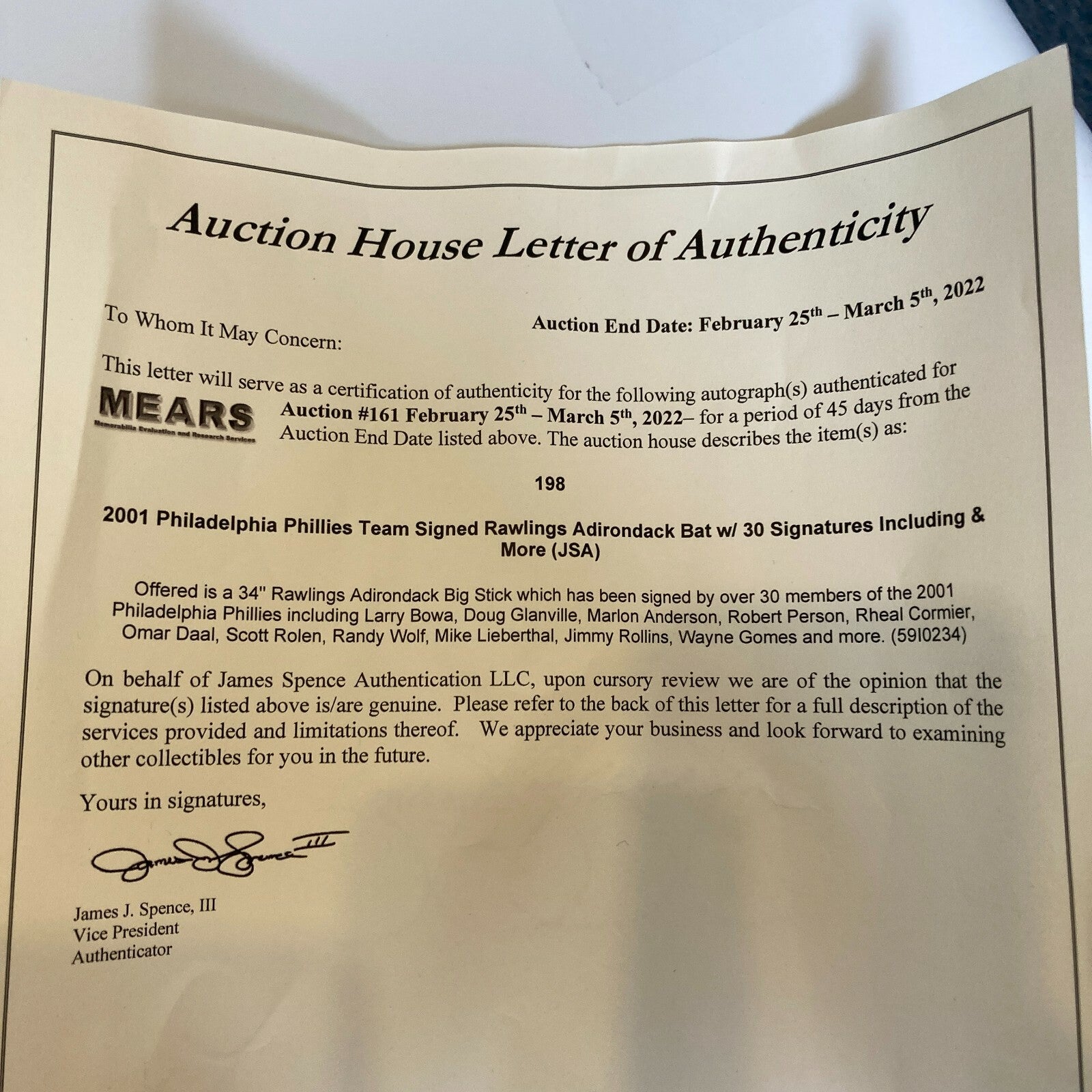 Offered is a 34" Rawlings Adirondack Big Stick which has been signed by over 30 members of the 2001 Philadelphia Phillies including Larry Bowa, Doug Glanville, Marlon Anderson, Robert Person, Rheal Cormier, Omar Daal, Scott Rolen, Randy Wolf, Mike Lieberthal, Jimmy Rollins, Wayne Gomes and more.