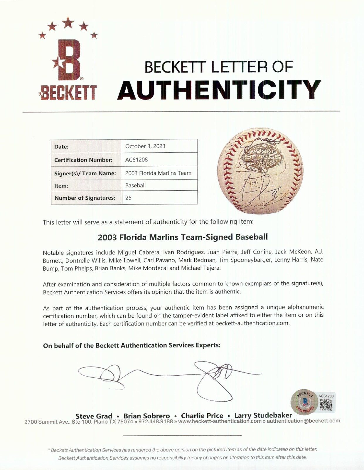 This 2003 World Series logo baseball is signed by 25 members of the World Champion Florida Marlins team. Signatures include: signed by Miguel Cabrera, Ivan Rodriguez, Juan Pierre, Jeff Conine, Jack McKeon, AJ Burnett, Dontrelle Willis, Mike Lowell, Carl Pavano, Mark Redman, Tim Spooneybarger, Lenny Harris, Nate Bump, Tom Phelps, Brian Banks, Mike Mordecai, Michael Tejera and more. Full LOA from Beckett.