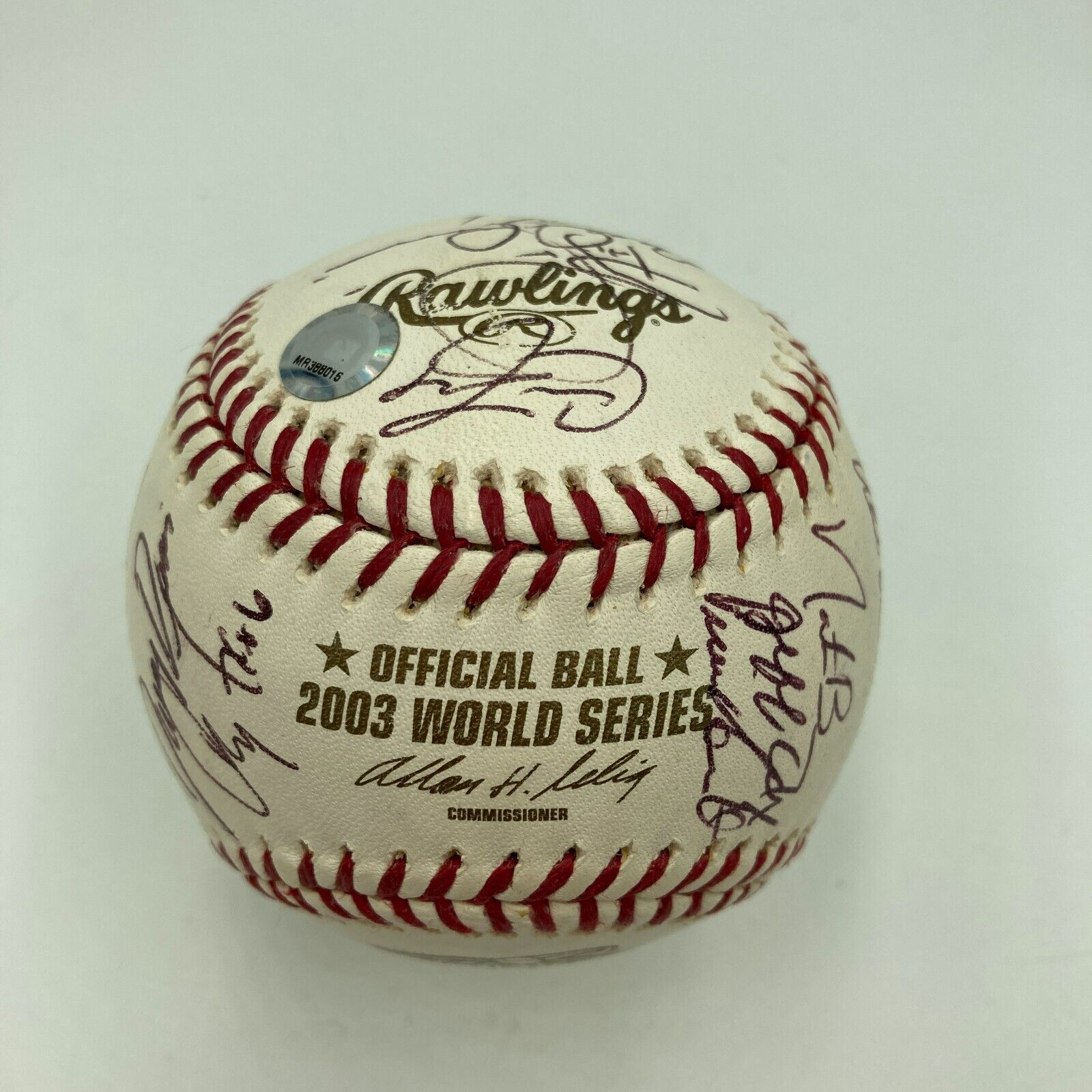 2003 Florida Marlins team signed World Series baseball. Rawlings official World Series ball signed by (23) members of the champion Marlins including Jack McKeon, Mike Lowell, Jeff Conine, Mark Redman, Carl Pavano, Braden Looper, Chad Fox, Mike Mordecai, Rick Helling, Lenny Harris, Nate Bump, and others.