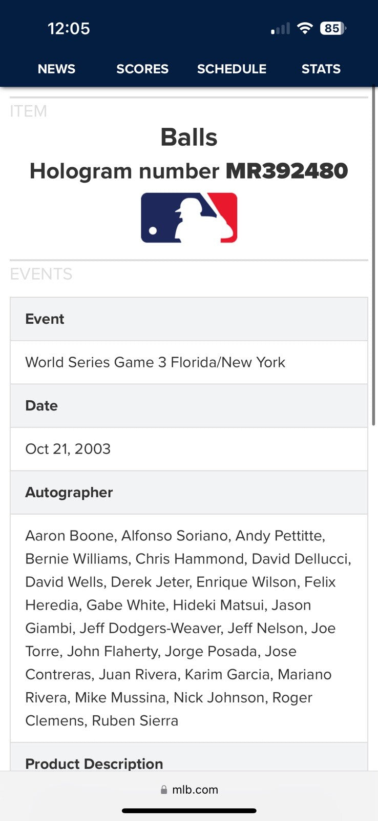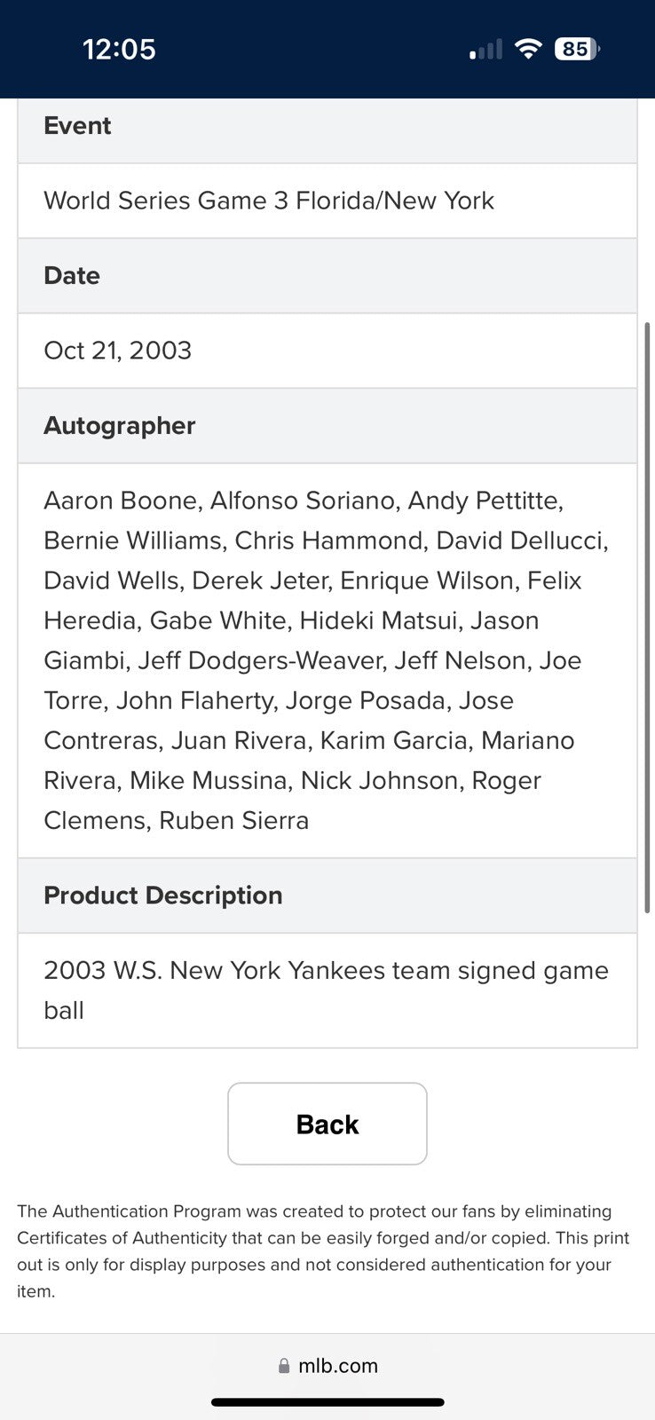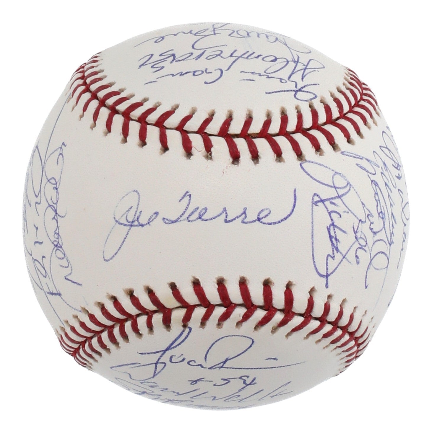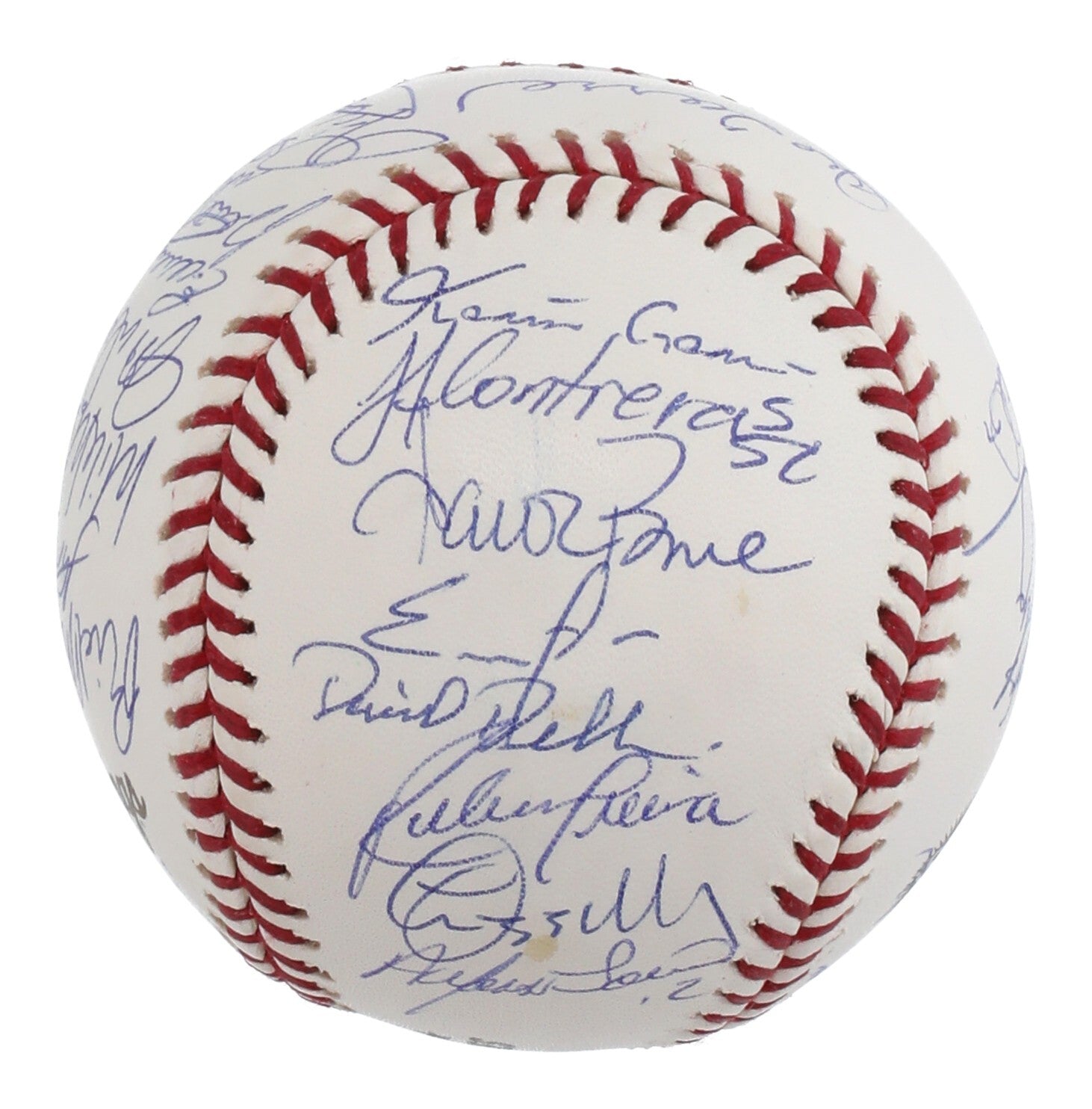 Offered is an Official 2003 World Series Allan H. Selig Game 3 baseball signed by 30 members of the 2003 American League champion New York Yankees. Game 3, held at Pro Player Stadium between the Yankees and Miami Marlins, resulting in a 6-1 Yankee victory. The ball features signatures from Hall of Famers Derek Jeter, Mariano Rivera, Mike Mussina, and Joe Torre, with additional signatures from Aaron Boone, Alfonso Soriano, Andy Pettitte, Bernie Williams, Chris Hammond, David Dellucci, David Wells, Enrique Wilson, Felix Heredia, Jorge Posada, Gabe White, Hideki Matsui, Jason Giambi, Jeff Dodgers-Weaver, Jeff Nelson, John Flaherty, Jose Contreras, Juan Rivera, Karim Garcia, Nick Johnson, Ruben Sierra, and Roger Clemens. The ball is accompanied by an MLB Authenticated hologram (MR392480) for the signatures.