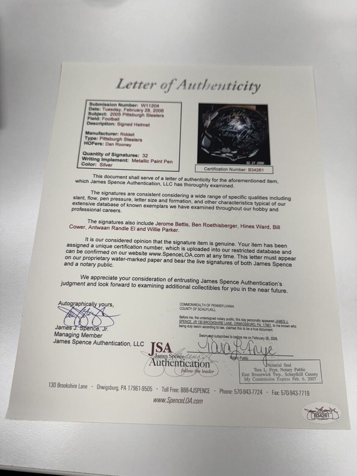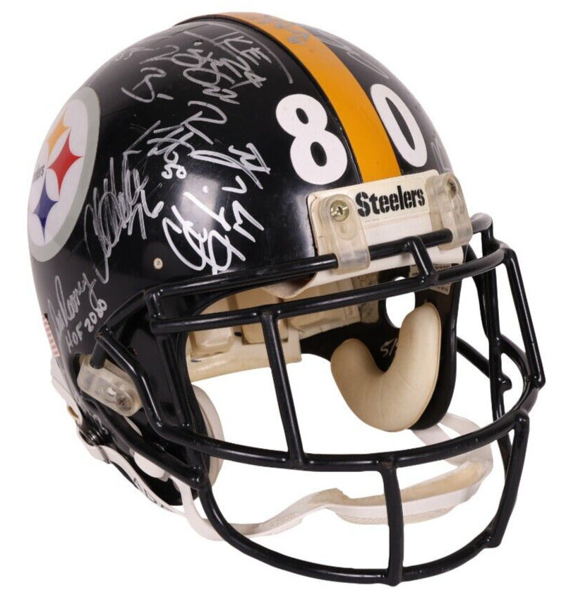 Offered is a full-sized Pittsburgh Steelers helmet that is signed by members of its 2005 squad that won Super Bowl XL. 32 signatures with Jerome Bettis, Hines Ward (Super Bowl XL MVP), Bill Cowher, Ben Roethlisberger, Joey Porter, Heath Miller, Antwaan Randle El, Brett Keisel, Willie Parker and Larry Foote, among others, signed the headwear. The #80 helmet shows wear from use from presumed game action. The signatures, in silver Sharpie, display really well. Accompanied by a full LOA from JSA.