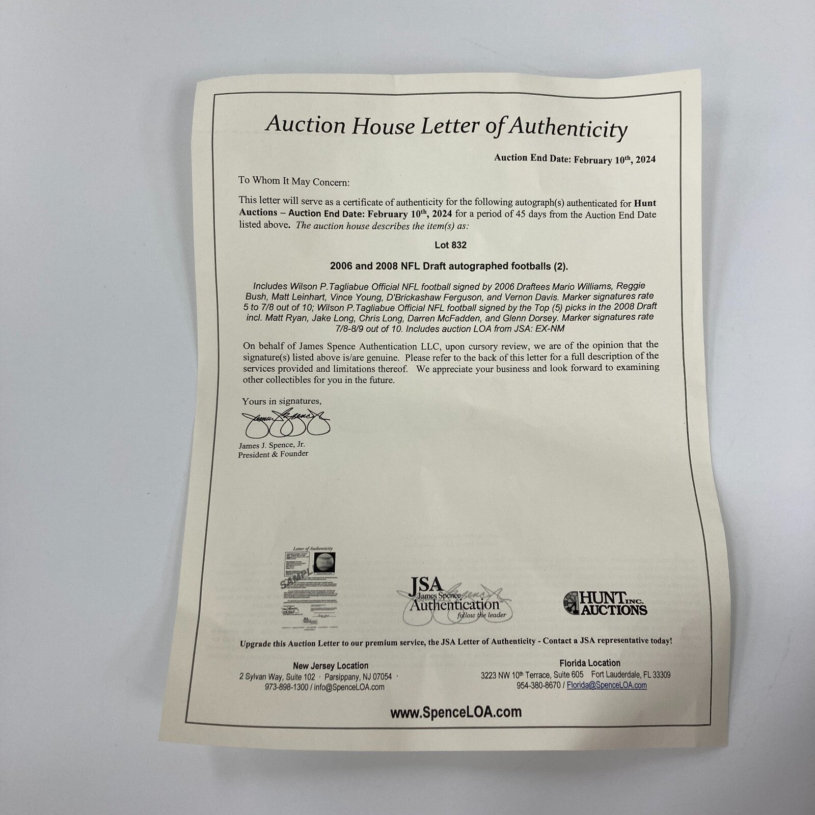Wilson official NFL football signed by (6) 2006 draft picks: Mario Williams, Reggie Bush, D'Brickashaw Ferguson, Vernon Davis, Vince Young, Matt Leinart. Comes with JSA COA.