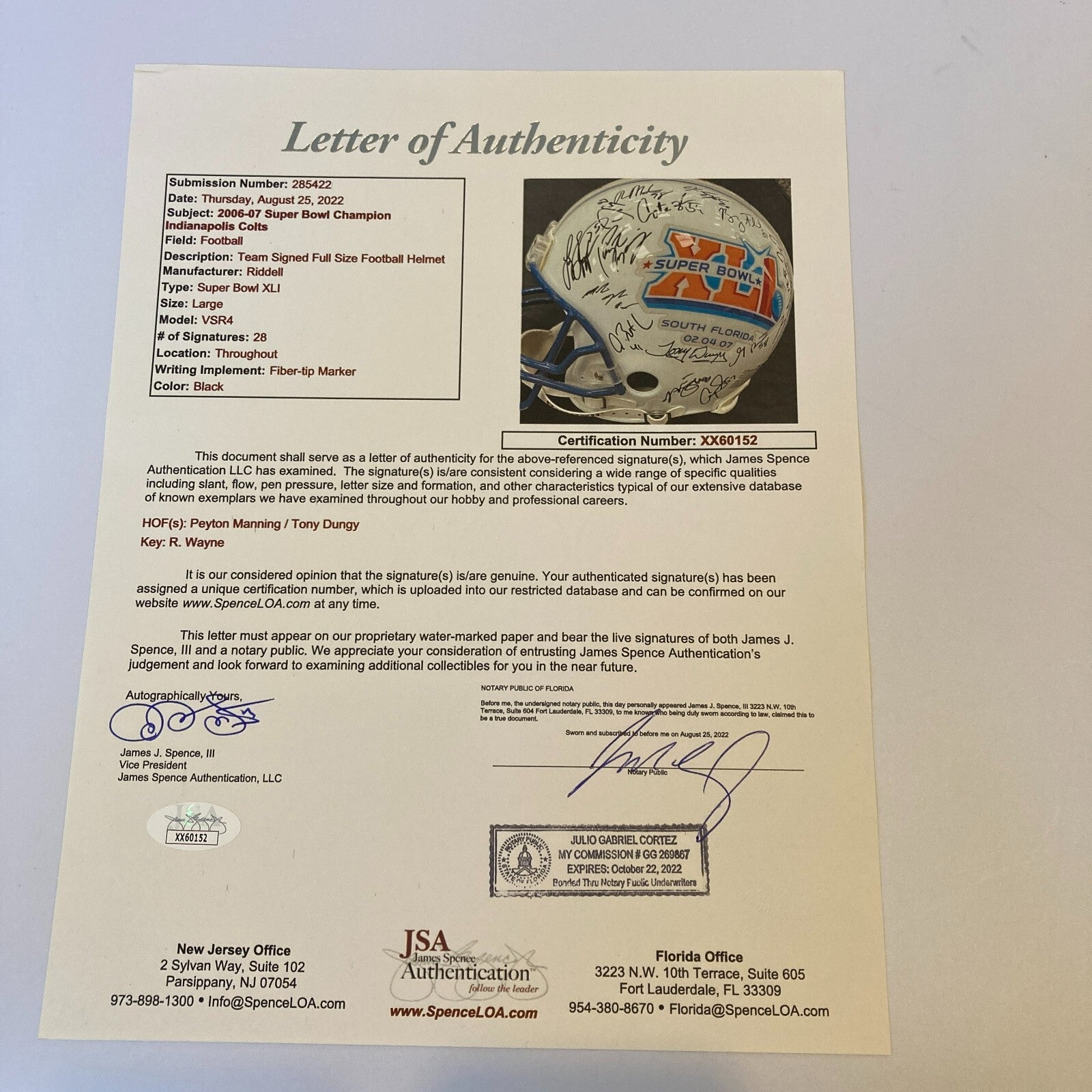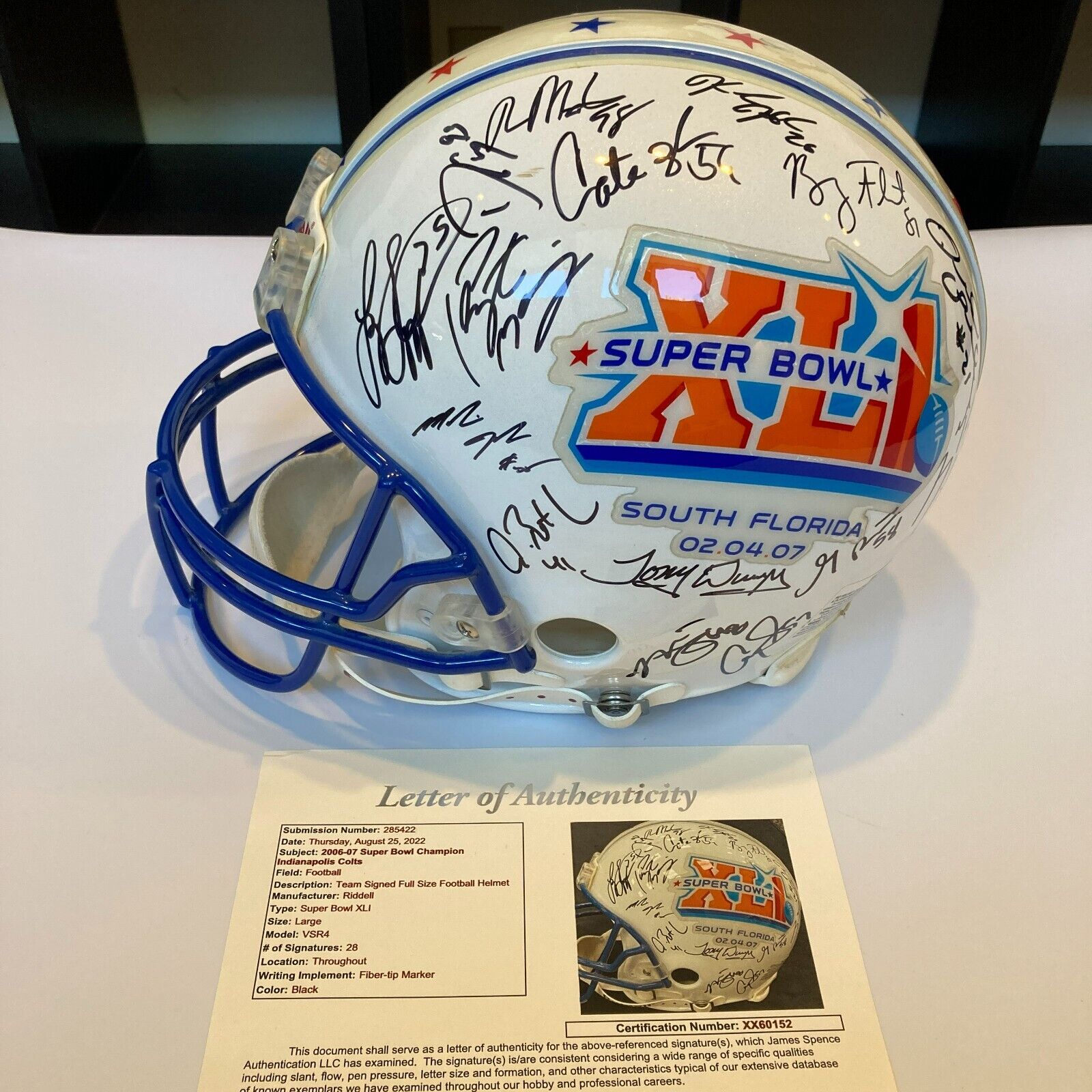 2006 Indianapolis Colts Super Bowl Champs Team Signed Full Size Authentic Super Bowl Helmet. 28 signatures with Peyton Manning and the rest of the team. Full letter JSA COA.