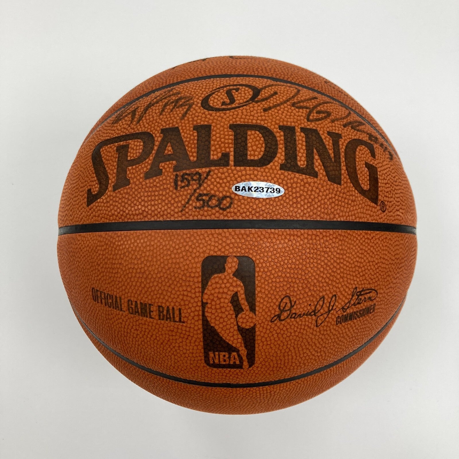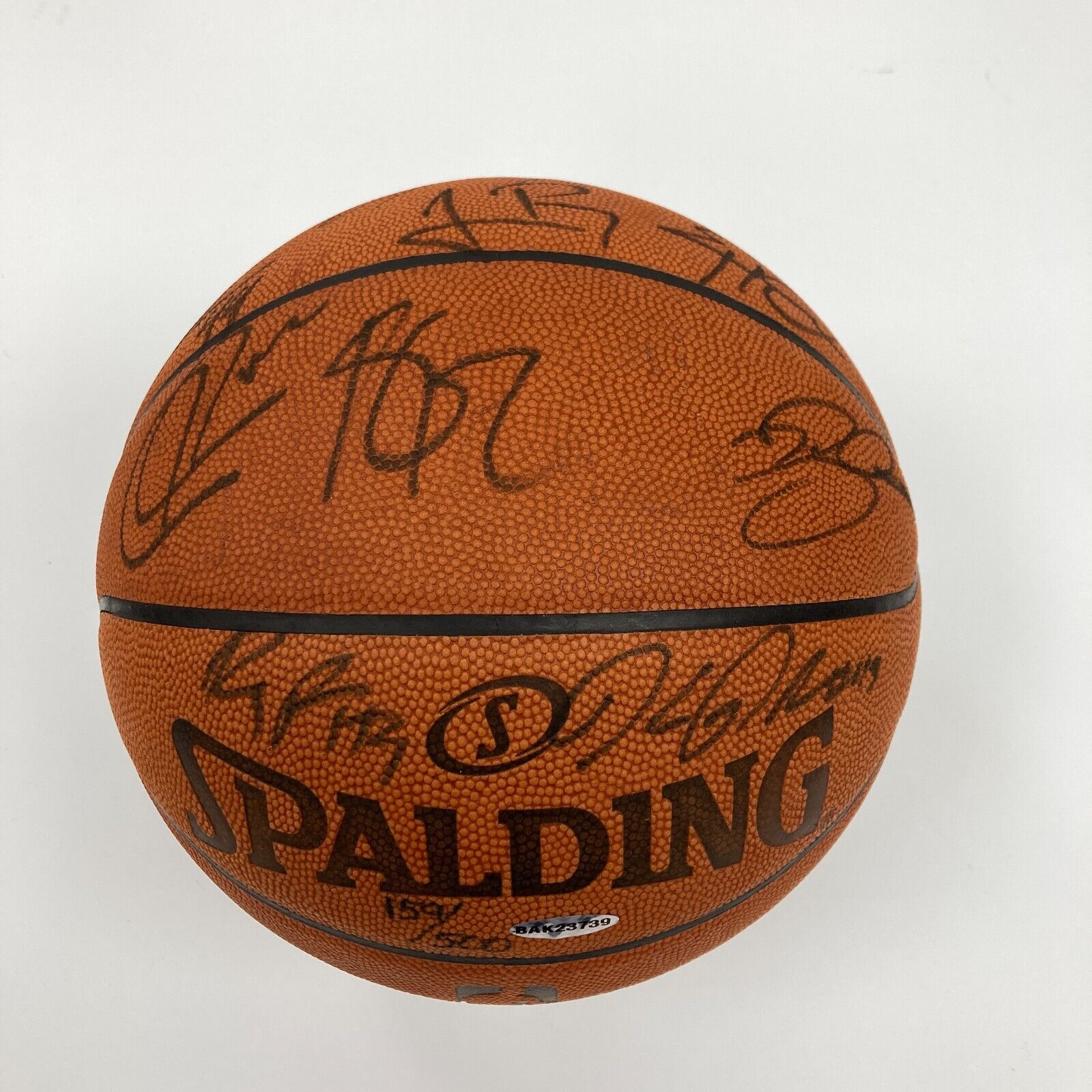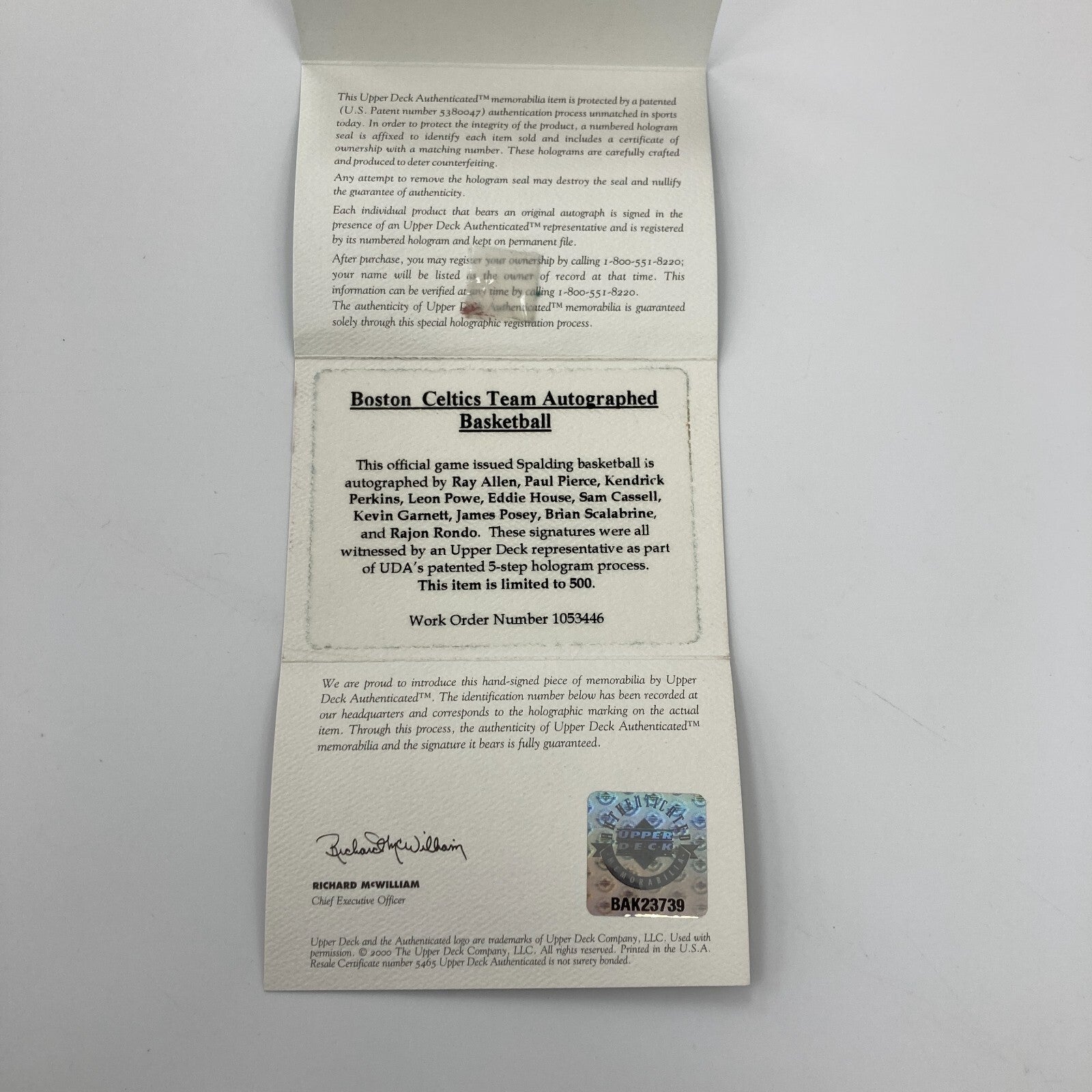 Terrifically star-studded basketball comes from the year after the Celtics won the NBA championship. Issued by UDA, the leather Spalding game ball is signed by Allen, Pierce, Perkins, House, Cassell, Garnett, Rondo and others in black ink. Numbered at 150/500. COA from UDA