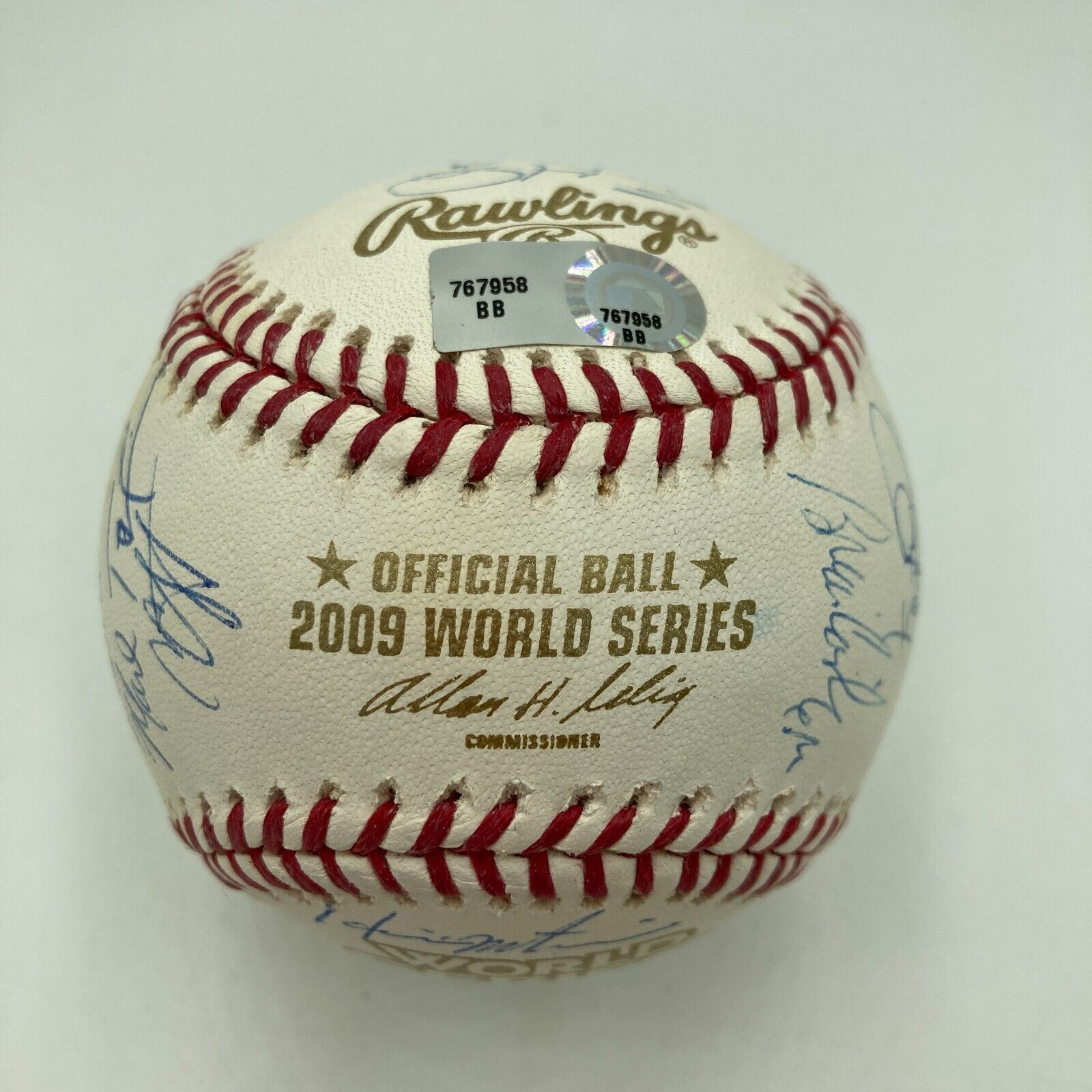 Offered is a 2009 World Series Allan H. Selig limited edition (35/250) baseball signed by over 25 members of the 2009 World Series champion New York Yankees. Key signatures on the ball include those of Hall of Famers Derek Jeter and Mariano Rivera, with additional signatures from Joe Girardi, Alex Rodriguez, Eric Hinske, Phil Hughes, and Mark Teixeira. The ball comes with a COA from Steiner and an MLB Authenticated hologram for the signatures.