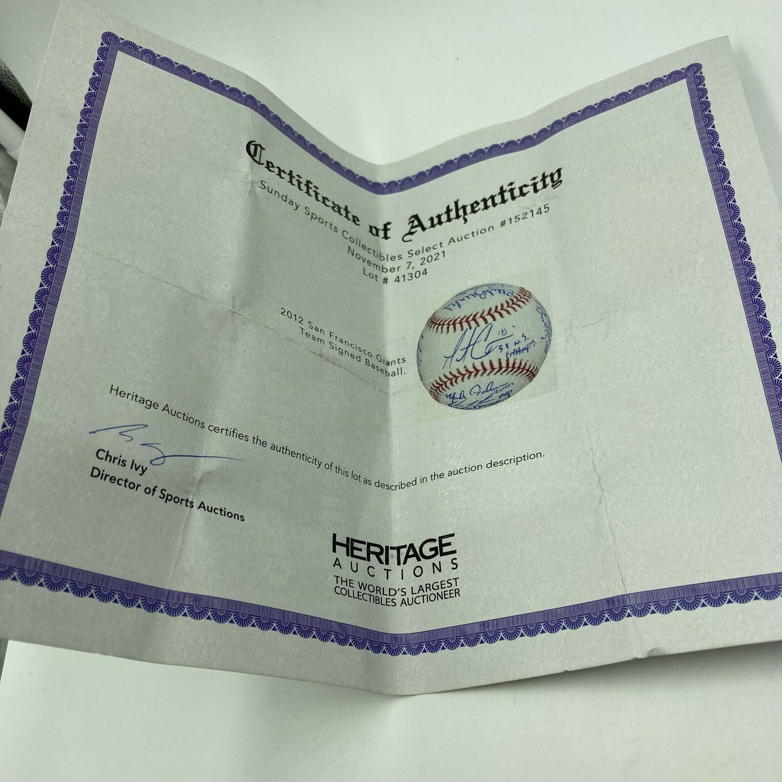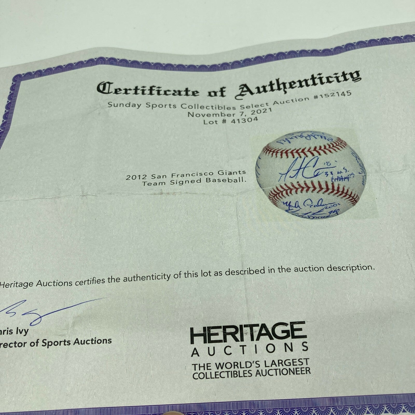 Offered is a baseball signed by members of the 2012 San Francisco Giants. Blue ballpoint signatures on the Rawlings OML/Manfred orb include Matt Cain, Buster Posey, Javier Lopez, Hunter Pence, Brandon Crawford and more. The signatures display well. The item comes from Willie McCovey's personal collection. LOA from Heritage Auctions. Full LOA from PSA DNA as well as JSA.