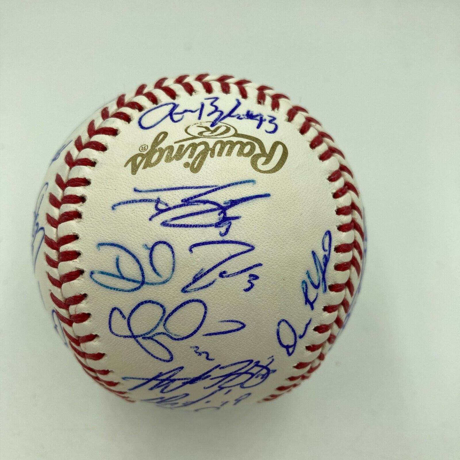 Boston Red Sox team-signed Official 2013 World Series Allan H. Selig baseball with 35 signatures in blue pen including manager John Farrell on the sweet spot, Xander Bogaerts, Brock Holt, David Ortiz, Shane Victorino and Dustin Pedroia, among many others. Full letter JSA COA.