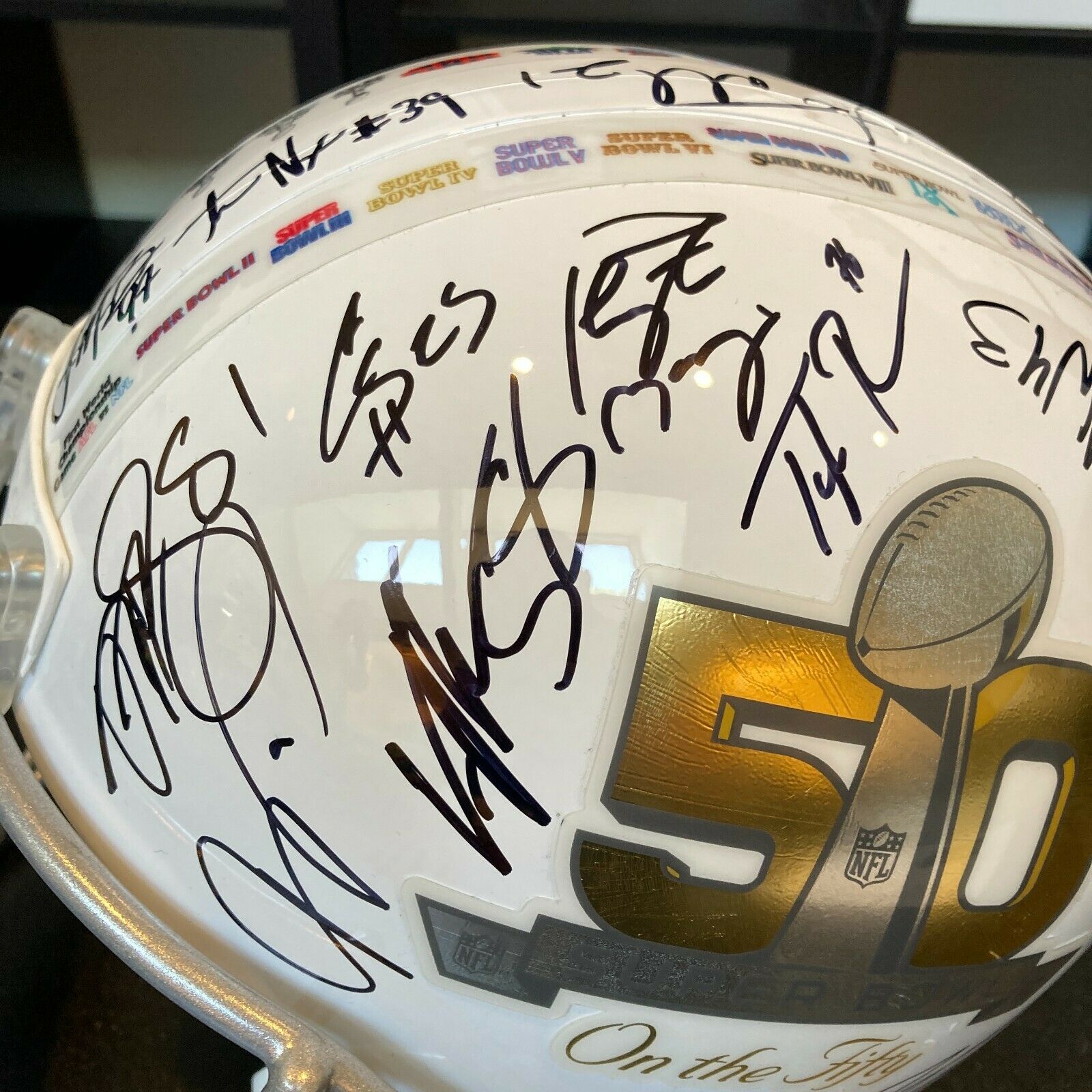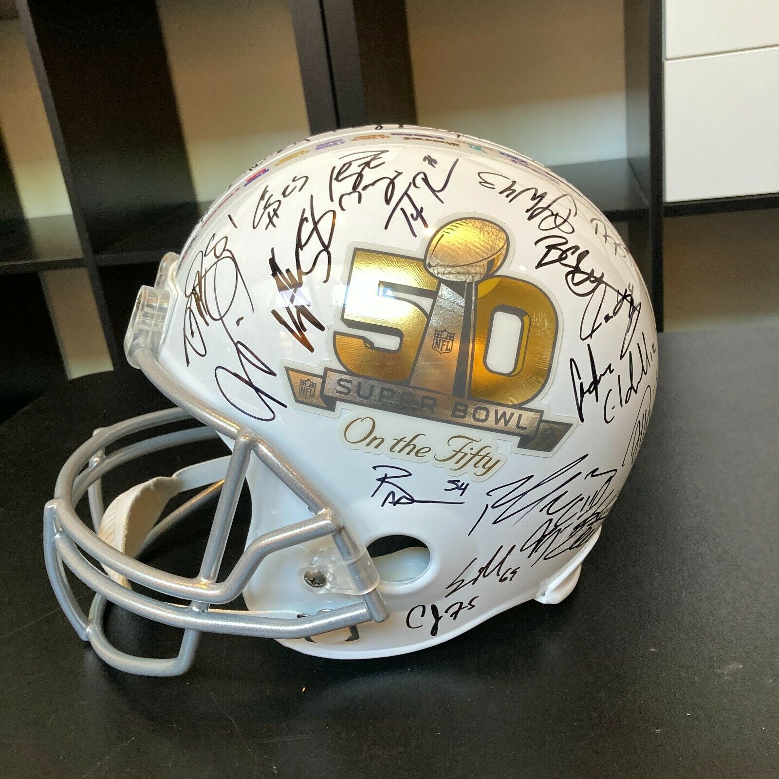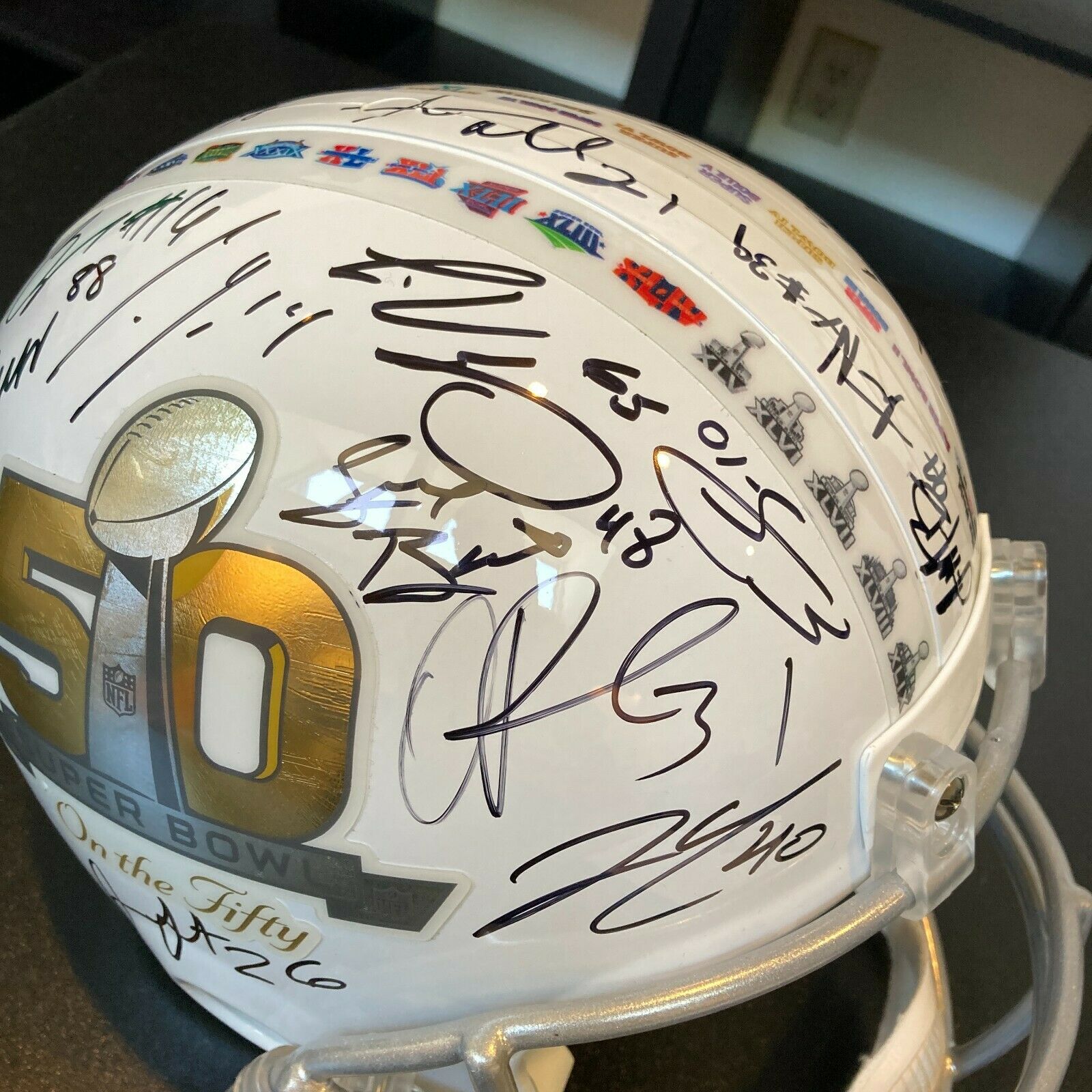 Beautiful 2015 Denver Broncos Super Bowl 50 Champions team autographed football helmet. Riddell authentic limited edition commemorative Super Bowl 50 helmet signed by (33) members of the Broncos including Peyton Manning, C.J. Anderson, A.Talib, D.Ware, D.Thomas, E.Sanders, V.Miller and many others.