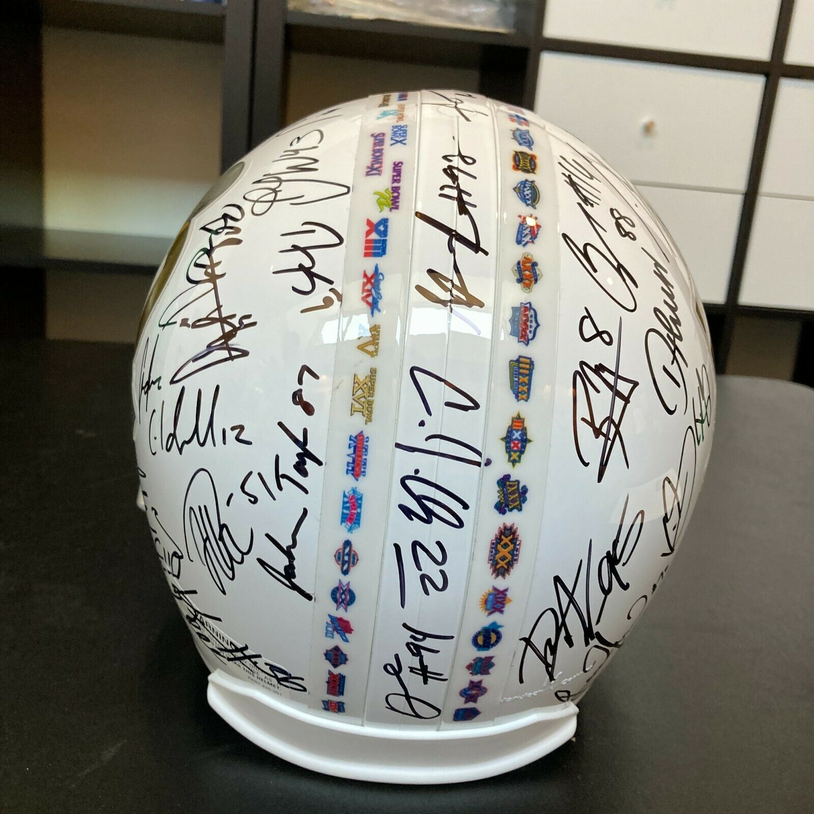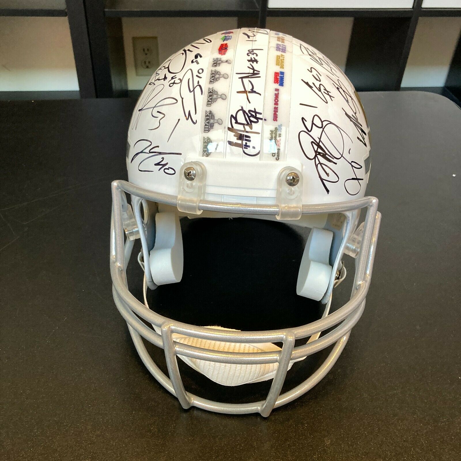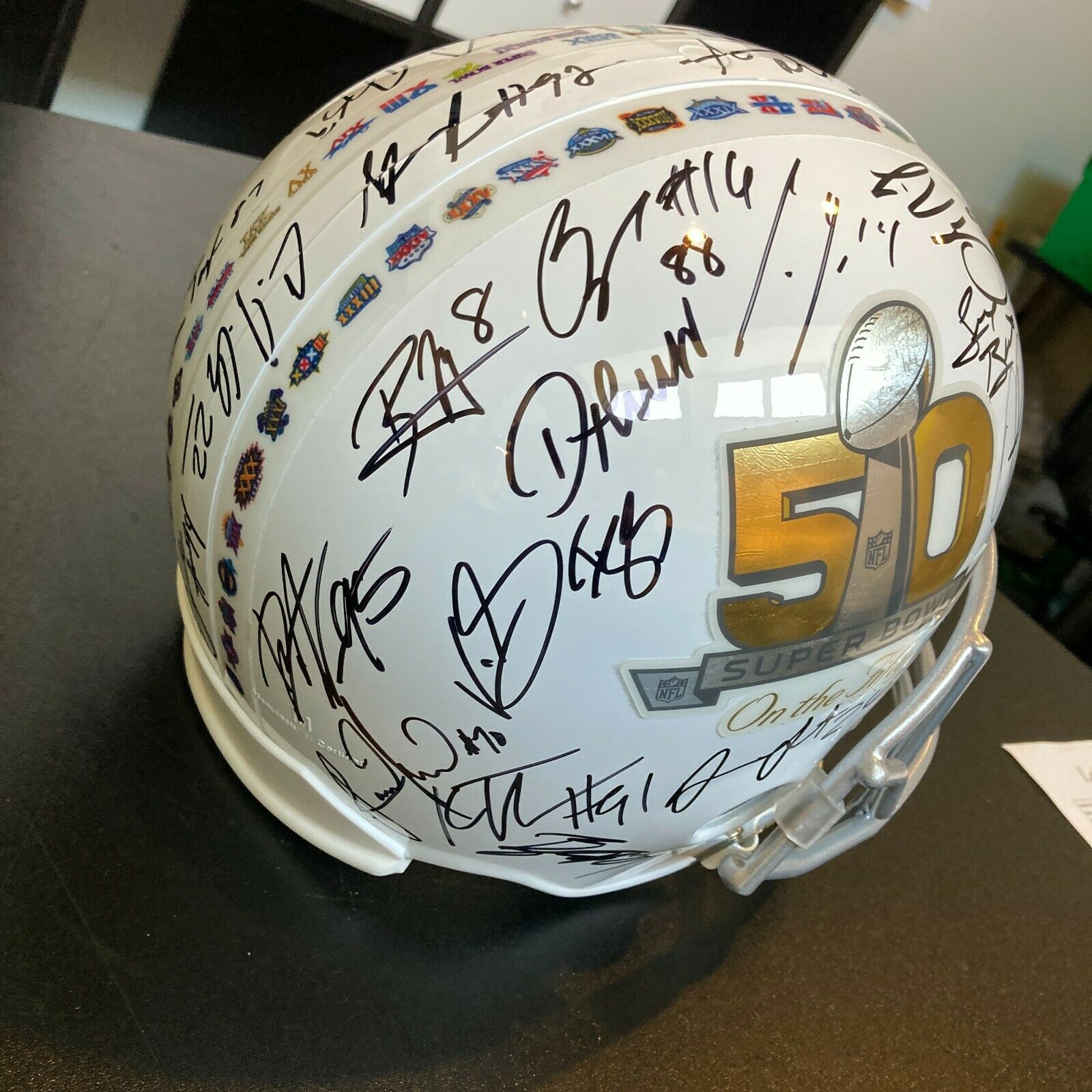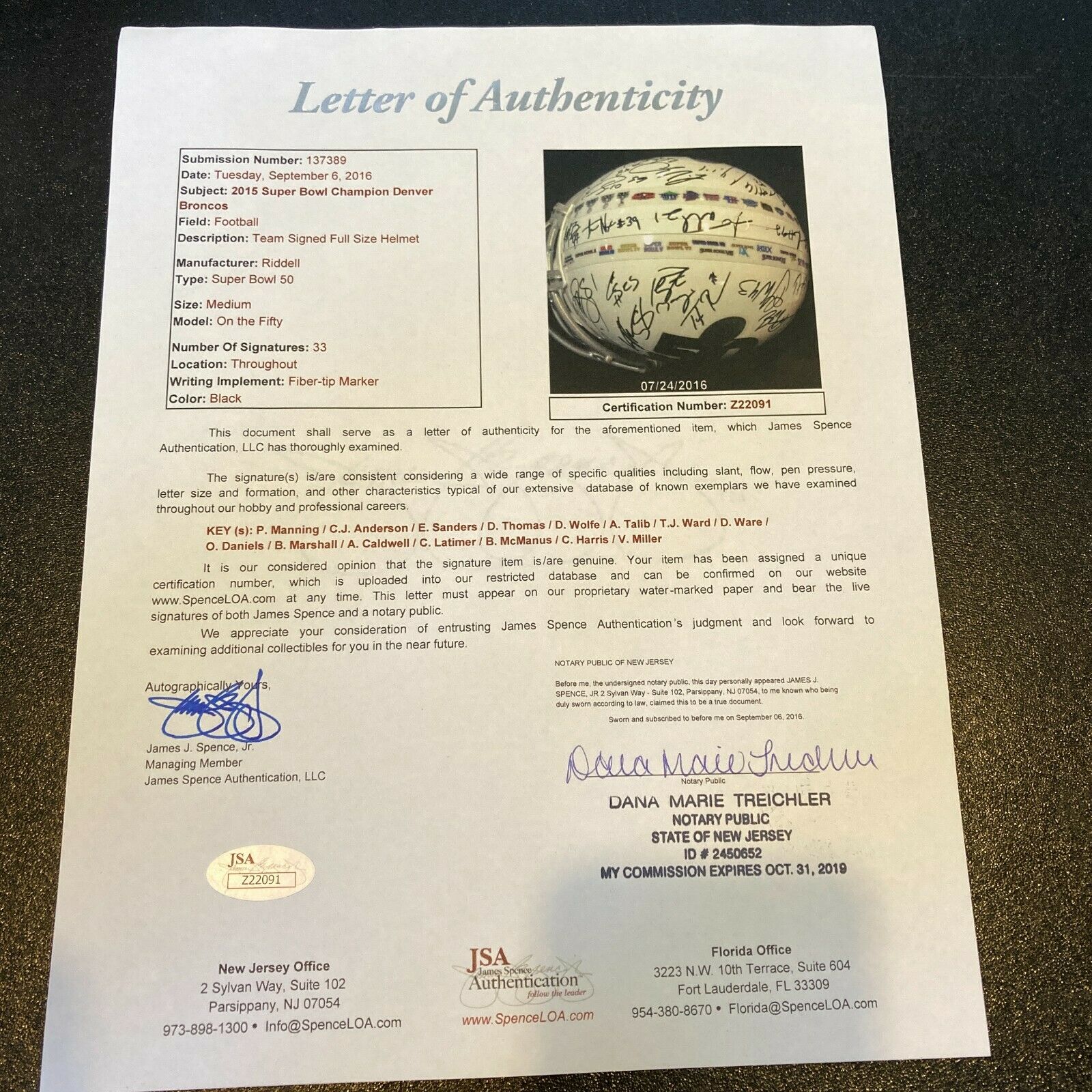 Beautiful 2015 Denver Broncos Super Bowl 50 Champions team autographed football helmet. Riddell authentic limited edition commemorative Super Bowl 50 helmet signed by (33) members of the Broncos including Peyton Manning, C.J. Anderson, A.Talib, D.Ware, D.Thomas, E.Sanders, V.Miller and many others.