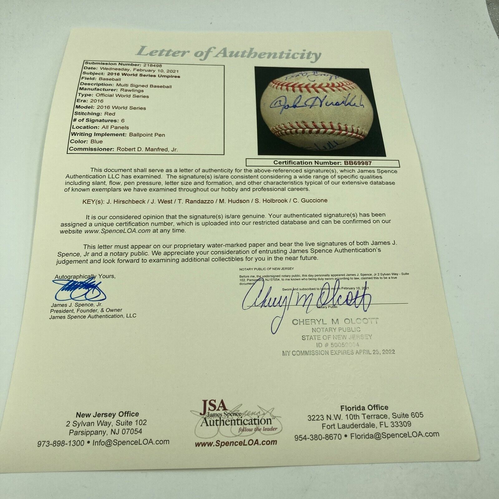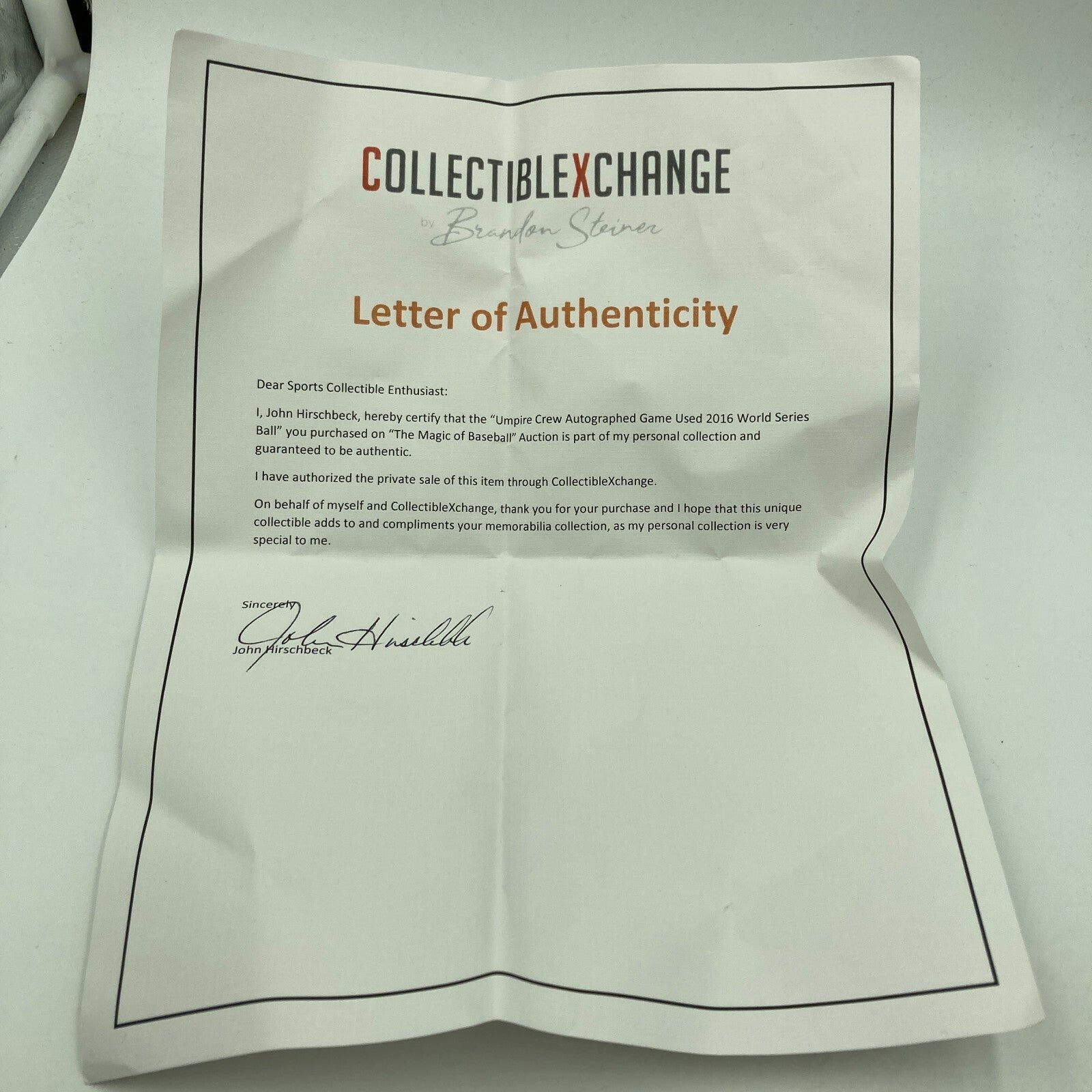 2016 World Series Game 3 Game Used Baseball Signed By Umpire Crew (6 signatures). The ball is authenticated for the game use by MLB Authentic with their tamper proof hologram. Also comes with COA from JSA and an LOP from officiating Umpire John Hirschbeck.