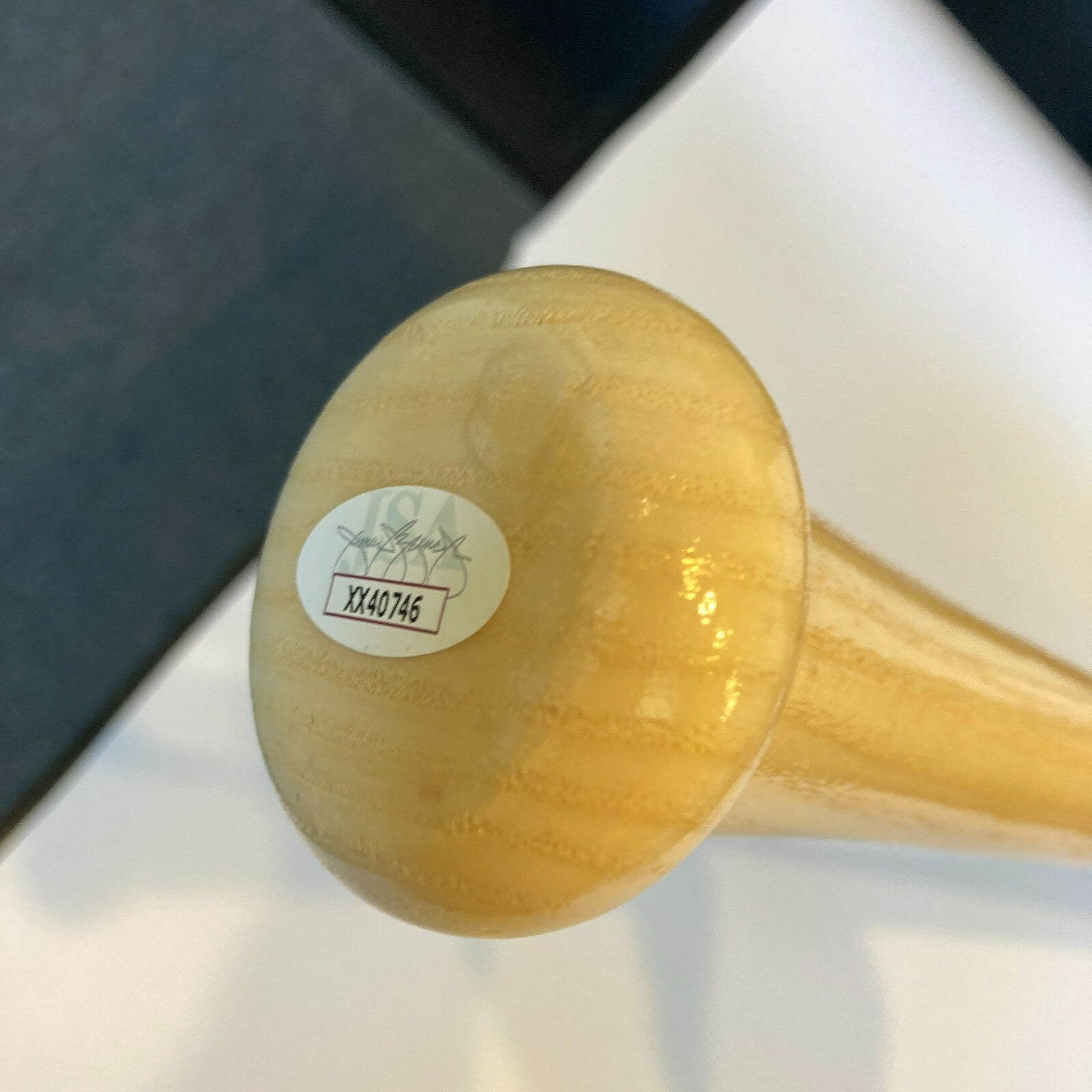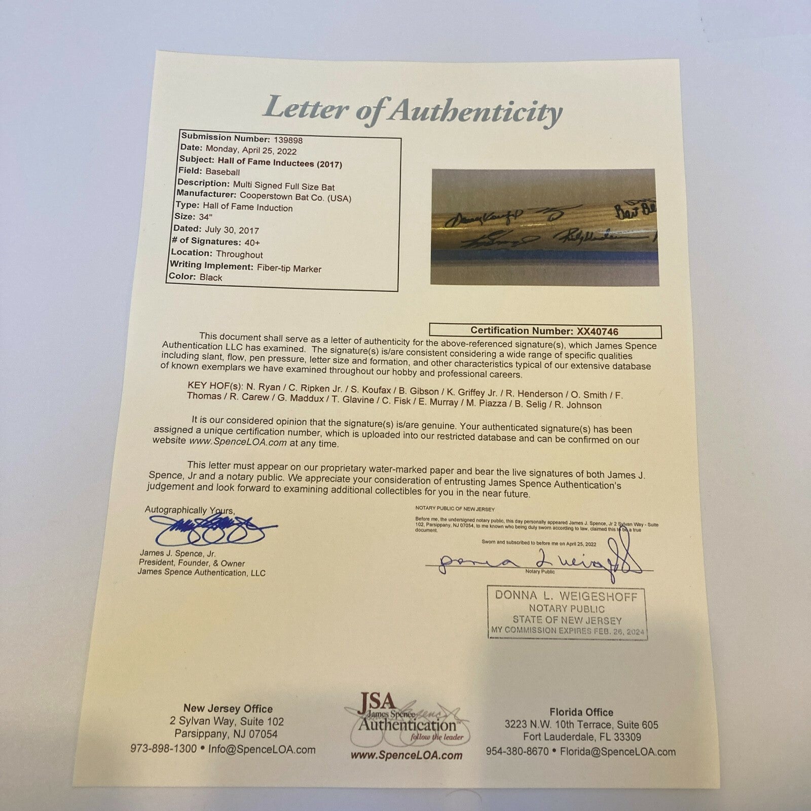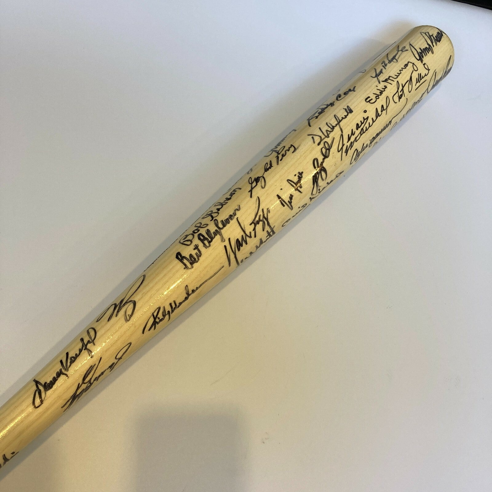 Terrific bat, these are not easy to find. Mint bat, this is almost bursting with superb black sharpie ink signatures. The content is amazing, with note to: Alomar, Bagwell, Bench, Biggio, Blyleven, Brett, Carew, Cox, Fisk, Ken Griffey Jr, R. Johnson, Sandy Koufax, Larkin, Maddux, Murray, Piazza, Ripken, Ryan, Schuerholz, Smoltz, Winfield, Yount and many others. Please note this is a truly remarkable bat as so many of these recent HOF Inductees are almost impossible to find on HOF bats and will never signed at an economical price level, creating a permanent scarcity. Gorgeous bat, with a sky full of star power, this is simply awesome