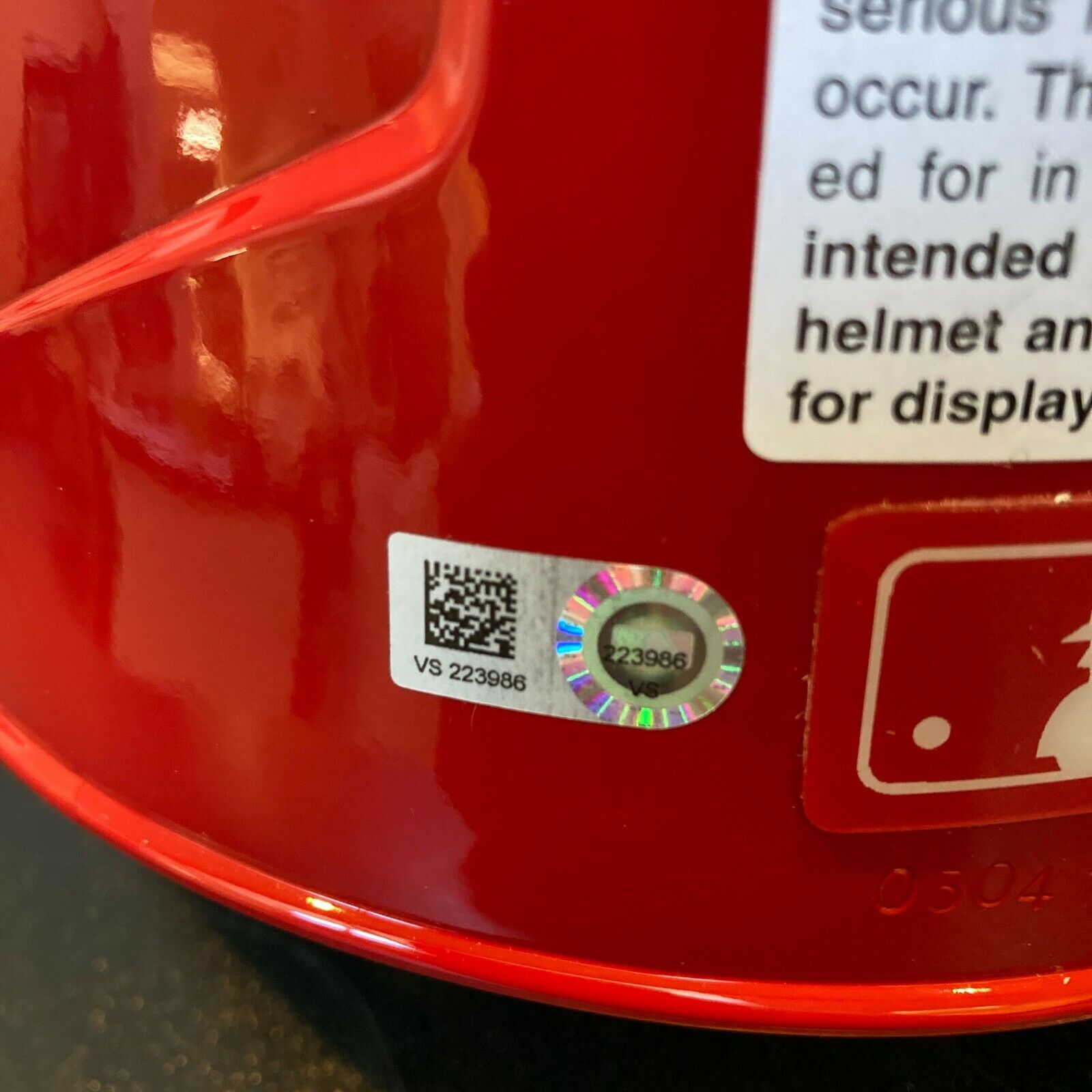 Offered is a red Washington Nationals authentic batting helmet signed by members of the 2019 squad that captured the World Series. Silver Sharpie signees include Patrick Corbin, Dave Martinez, Ryan Zimmerman, Anthony Rendon, Trea Turner, Stephen Strasburg, Max Scherzer, Juan Soto, Anibal Sanchez, Michael A. Taylor, Kurt Suzuki, Asdrubal Cabrera, Howie Kendrick, Adam Eaton, Daniel Hudson and Javy Guerra. It is numbered 4/19. The signatures display well. MLB Authentication hologram, VS223986. Fanatics holo A713074.