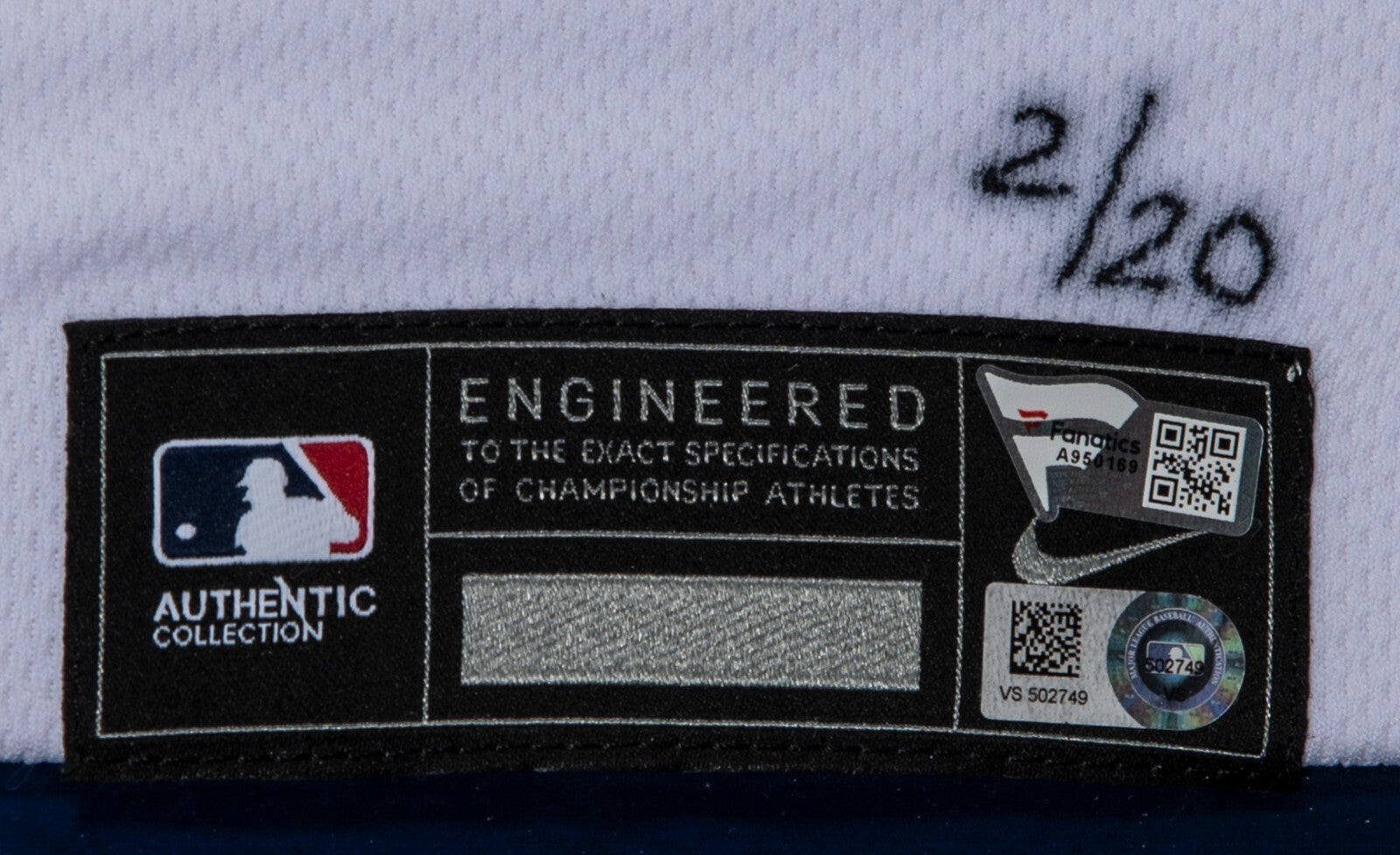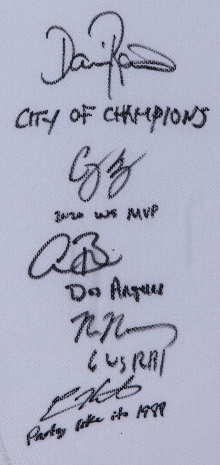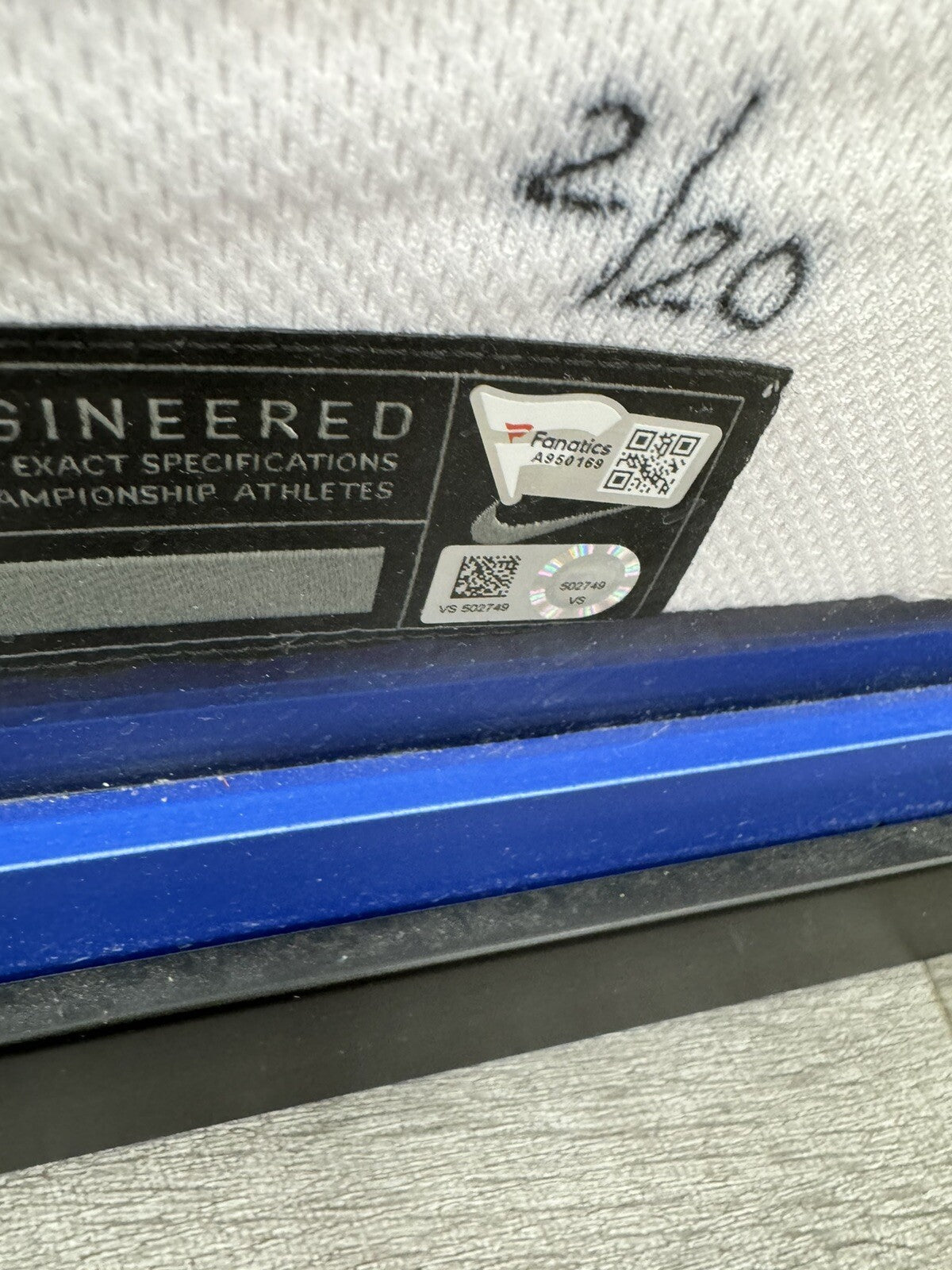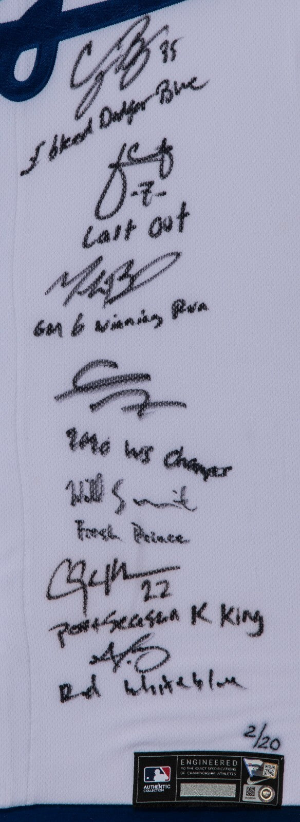 Presented is a 44-by-36-inch framed Los Angeles Dodgers team signed jersey and photograph display commemorating the team's 2020 World Series championship that contains the signatures of 12 members from that winning team. Each signature has been penned in black marker across the front of the jersey. Signatures include: Will Smith, Enrique Hernandez, Gavin Luz, Corey Seager, Cody Bellinger, Mookie Betts, Dave Roberts, Dustin May, Max Muncy, Julio Urias, Austin Barnes, and Clayton Kershaw. Each signee as added their own inscription below their respective signatures. The jersey comes in a lightly circulated black frame with an MLB Authenticated Hologram (VS502749) and a hologram from Fanatics (A950169) for signatures. The limited-edition piece is serial-numbered "02/20."