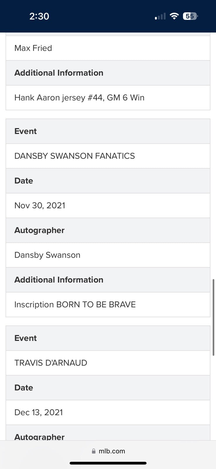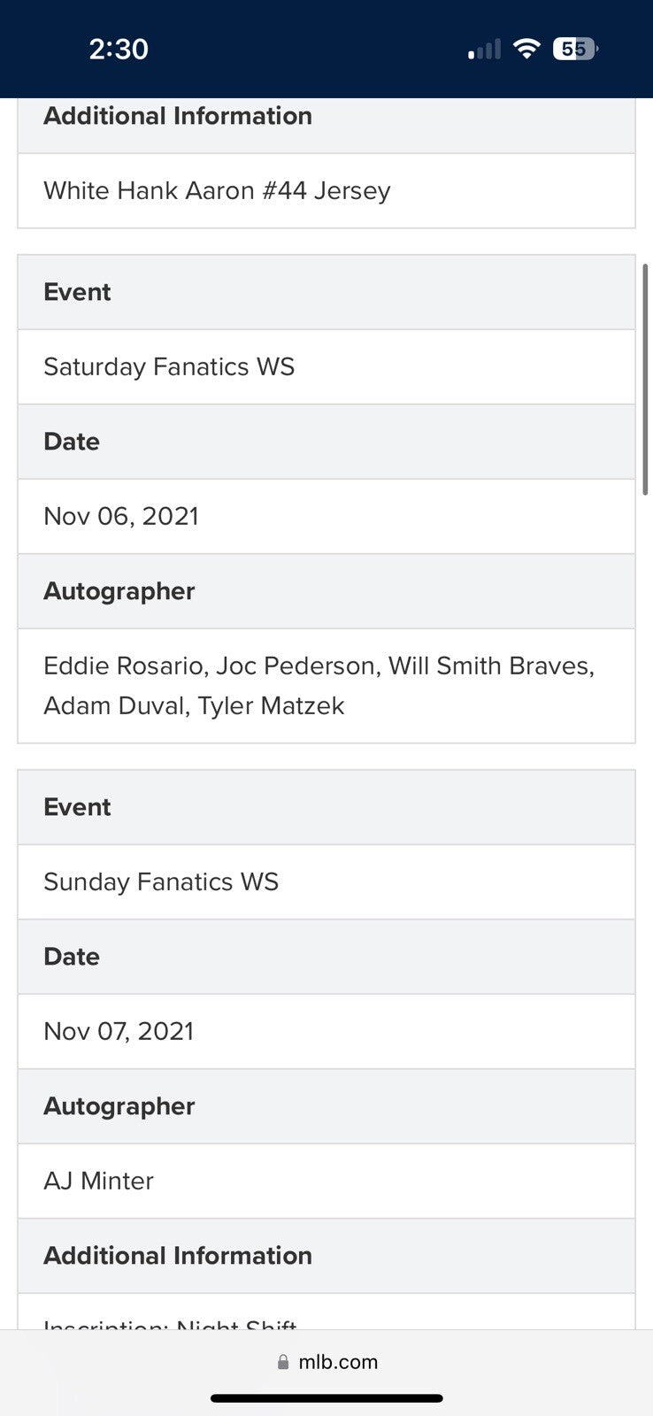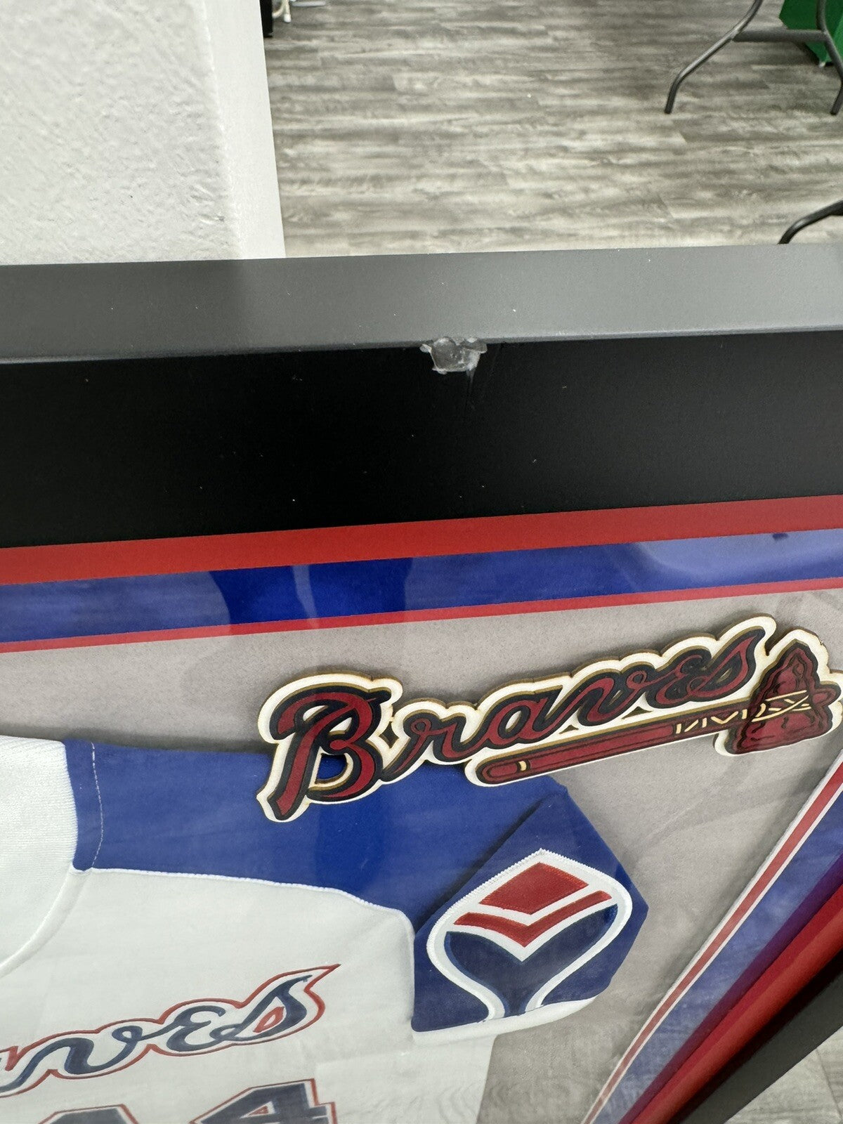 This 36x44 framed Authentic Mitchell & Ness Hank Aaron 1974 model jersey is signed by 13 members of the World Champion 2021 Atlanta Braves. Signatures include: Freddie Freeman, Dansby Swanson, Eddie Rosario, Will Smith, William Contreras, Adam Duvall, Jorge Soler, Tyler Matzek, AJ Minter, Travis D'Arnaud, Austin Riley, Max Fried and Joc Pederson. Each player signed in black Sharpie and added a unique inscription. The jersey is hand-numbered 12/21 and includes both MLB and Fanatics holograms affixed.
