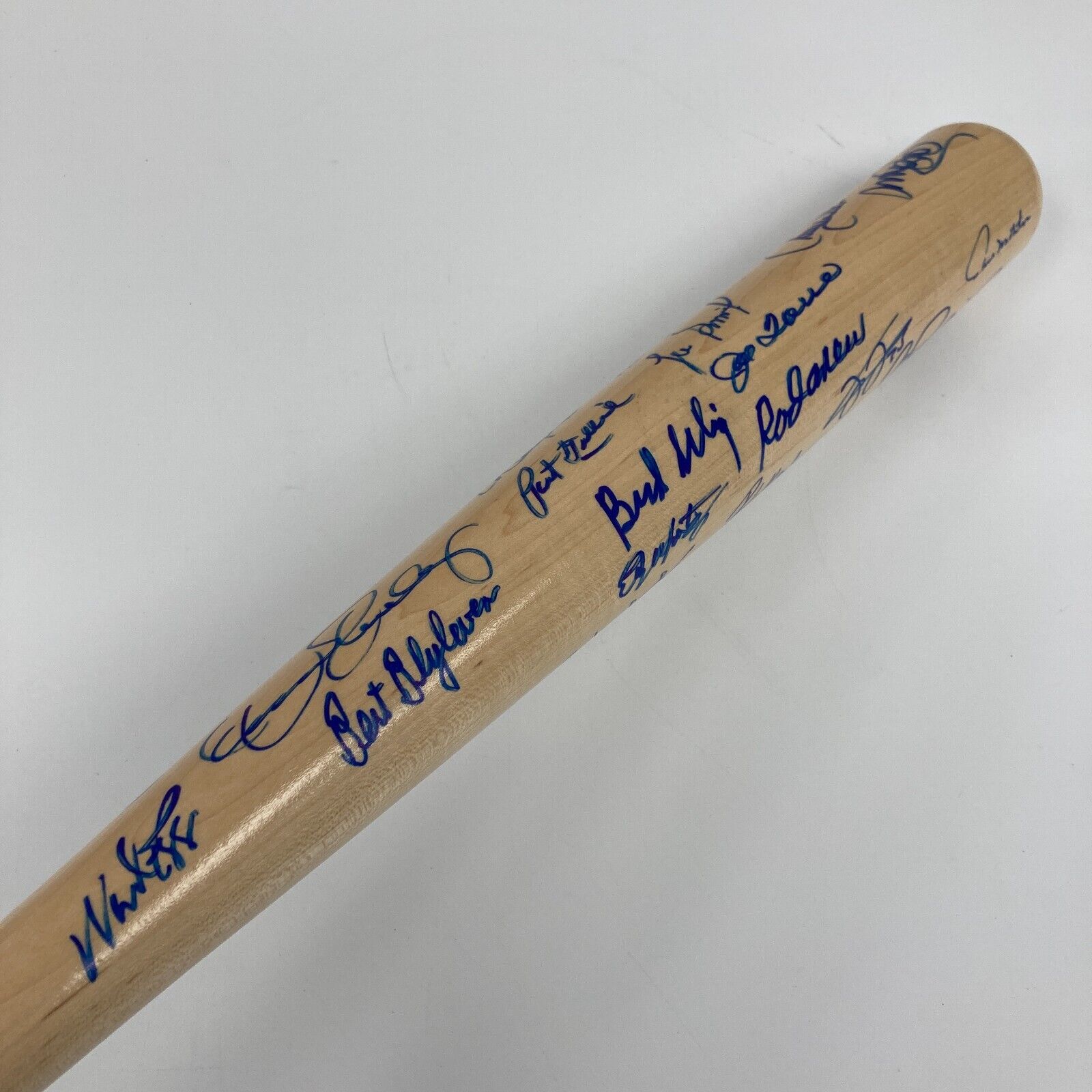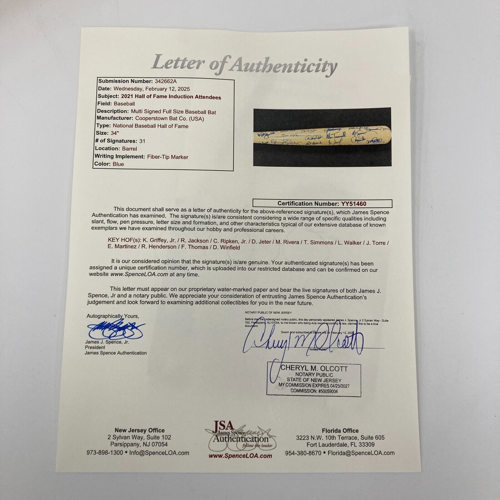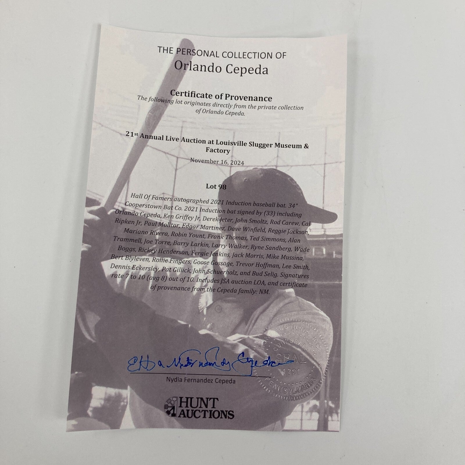Hall Of Famers autographed 2021 Induction baseball bat. 34" Cooperstown Bat Co. 2021 Induction bat signed by (33) including Orlando Cepeda, Ken Griffey Jr, Derek Jeter, John Smoltz, Rod Carew, Cal Ripken Jr, Paul Molitor, Edgar Martinez, Dave Winfield, Reggie Jackson, Mariano Rivera, Robin Yount, Frank Thomas, Ted Simmons, Alan Trammell, Joe Torre, Barry Larkin, Larry Walker, Ryne Sandberg, Wade Boggs, Rickey Henderson, Fergie Jenkins, Jack Morris, Mike Mussina, Bert Blyleven, Rollie Fingers, Goose Gossage, Trevor Hoffman, Lee Smith, Dennis Eckersley, Pat Gillick, John Schuerholz, and Bud Selig. Includes certificate of provenance from the Cepeda family