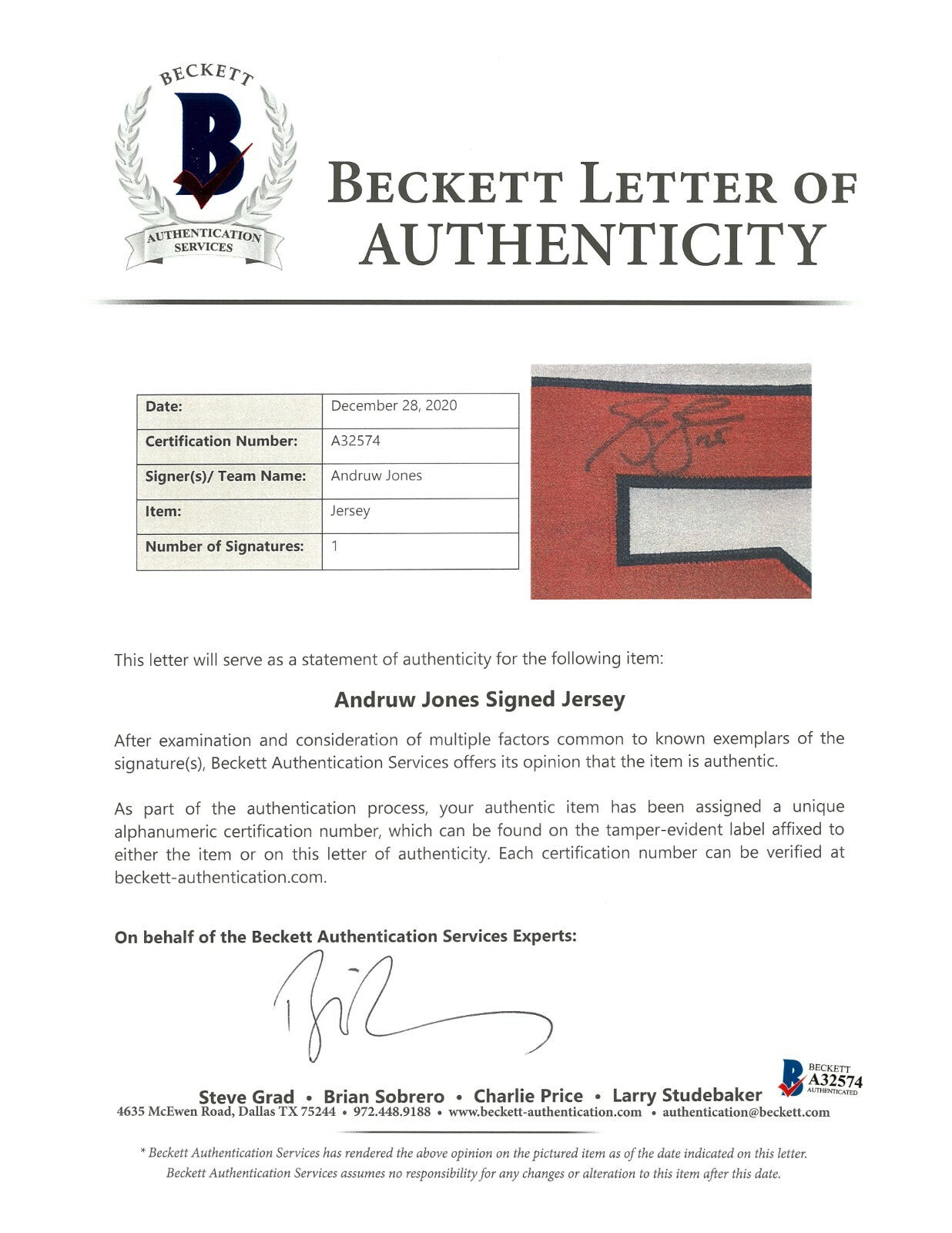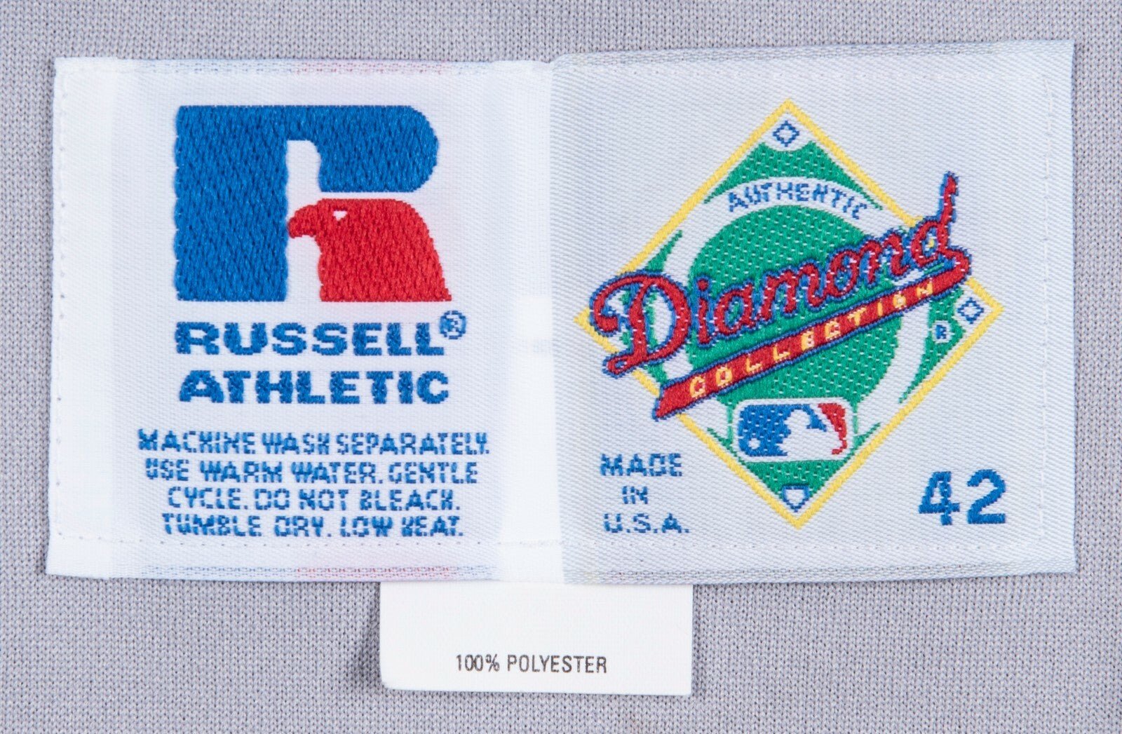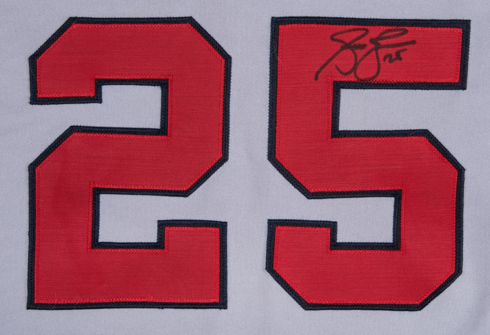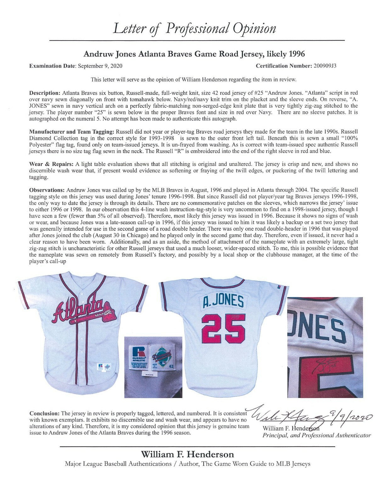 This offered Braves road jersey is a gray button-down, with “Atlanta” and a tomahawk logo patch sewn on the chest in red and navy tackle twill. “A. JONES” is sewn across the back shoulders of the jersey in navy tackle twill over a matching gray nameplate. Jones’ number “25” is sewn on the back of the jersey in red and navy tackle twill. A Russell Athletic logo is sewn on the right sleeve. Navy-red-navy piping accents the chest, collar, and sleeves. A Russell size “42” tag with an attached “100% Polyester” flag is sewn on the front left tail. Jones has signed the “5” digit on the back of the jersey in black marker. The jersey comes with a LOA from noted baseball game used jersey expert William Henderson and a LOA from Beckett Authentication Services for Jones’ signature.