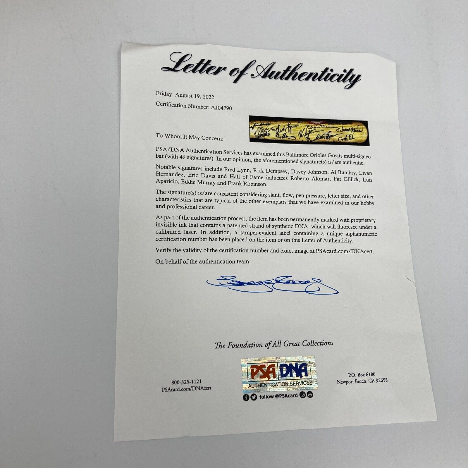 Noteworthy names including Roberto Alomar, Luis Aparicio, Eddie Murray, Frank Robinson, Pat Gillick, Fred Lynn, Rick Dempsey, Davey Johnson, Al Bumbry, Livan Hernandez and Eric Davis. Length is thirty-four inches (34"). Full LOA from PSA/DNA.