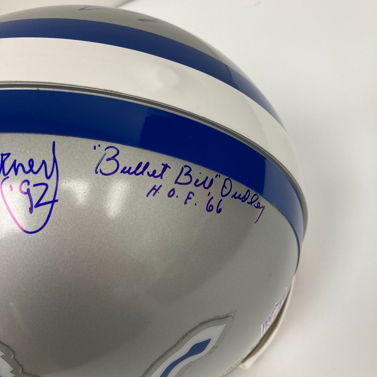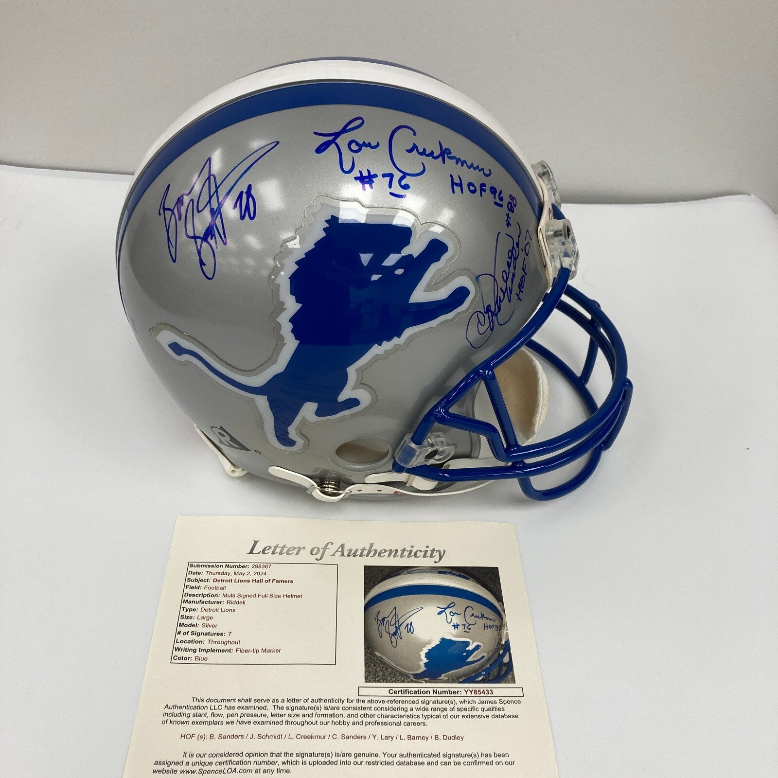 Top of the line VSR-4 full size helmet has been signed by (7) incl. Barry Sanders, Lou Creekmur, Joe Schmidt, Charlie Sanders, Yale Lary, Lem Barney, and Bill Dudley. All but Sanders have added an HOF inscription.