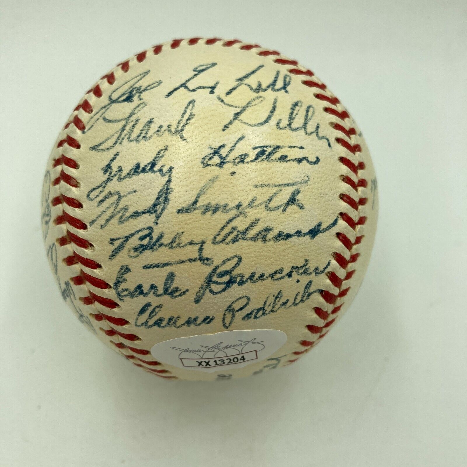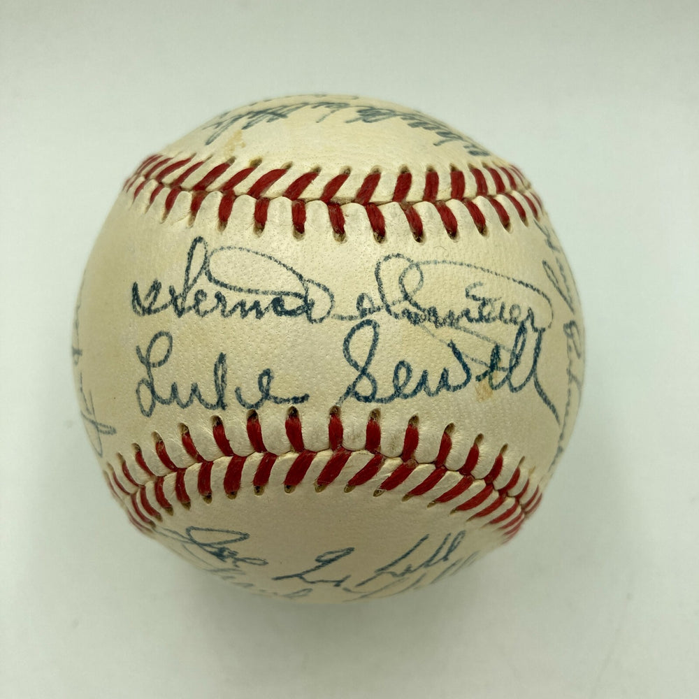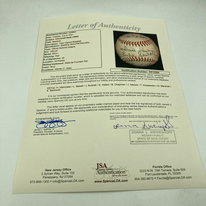 1952 Cincinnati Reds: Official National League (Giles) baseball. All signatures are in blue ink. A total of 27 signatures appear on the baseball including: Cal Abrams, Bobby Adams, Joe Adcock, Ewell Blackwell, Bob Borkowski, Bubba Church, Hank Edwards, Grady Hatton, Frank Hiller, Dixie Howell, Ted Kluszewski, Willard Marshall, Roy McMillan, Joe Nuxhall, Eddie Pellagrini, Harry Perkowski, Bud Podbielan, Ken Raffensberger, Joe Rossi, Andy Seminick, Frank Smith, Herm Wehmeier, Wally Westlake, Luke Sewell, Earle Brucker, Ben Chapman, and Phil Page.
