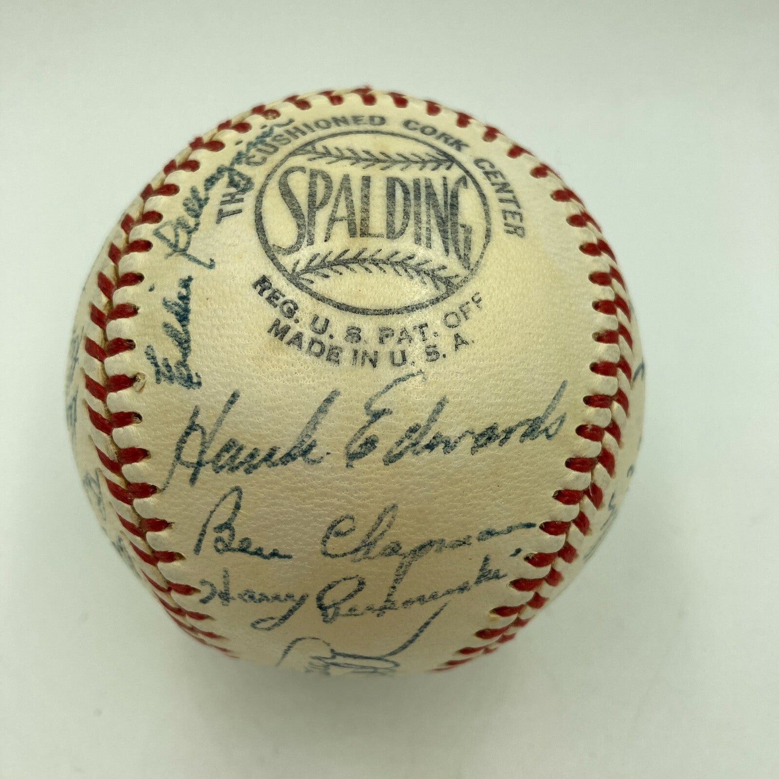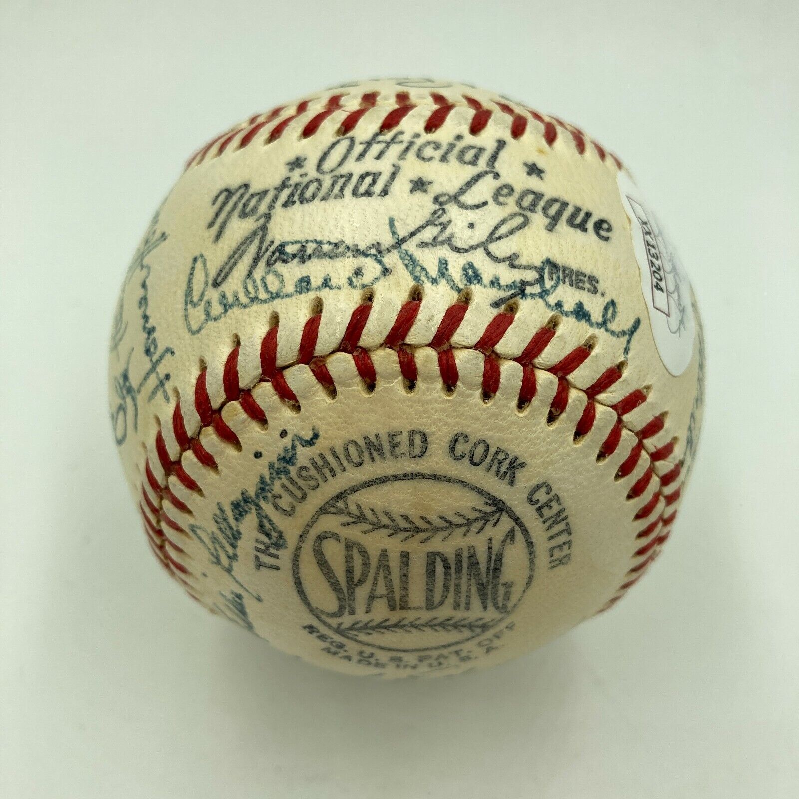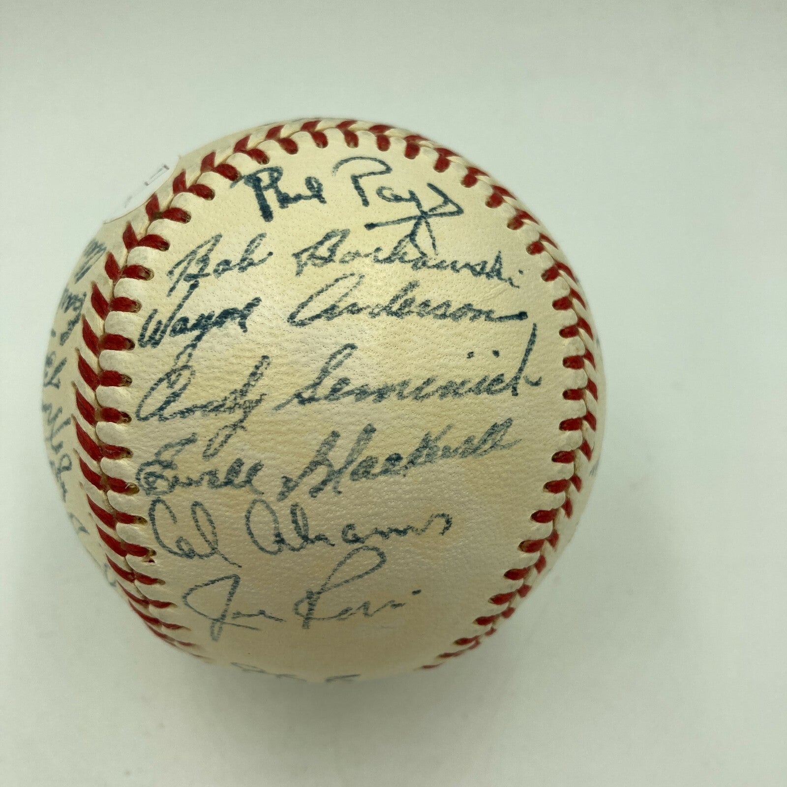 1952 Cincinnati Reds: Official National League (Giles) baseball. All signatures are in blue ink. A total of 27 signatures appear on the baseball including: Cal Abrams, Bobby Adams, Joe Adcock, Ewell Blackwell, Bob Borkowski, Bubba Church, Hank Edwards, Grady Hatton, Frank Hiller, Dixie Howell, Ted Kluszewski, Willard Marshall, Roy McMillan, Joe Nuxhall, Eddie Pellagrini, Harry Perkowski, Bud Podbielan, Ken Raffensberger, Joe Rossi, Andy Seminick, Frank Smith, Herm Wehmeier, Wally Westlake, Luke Sewell, Earle Brucker, Ben Chapman, and Phil Page.