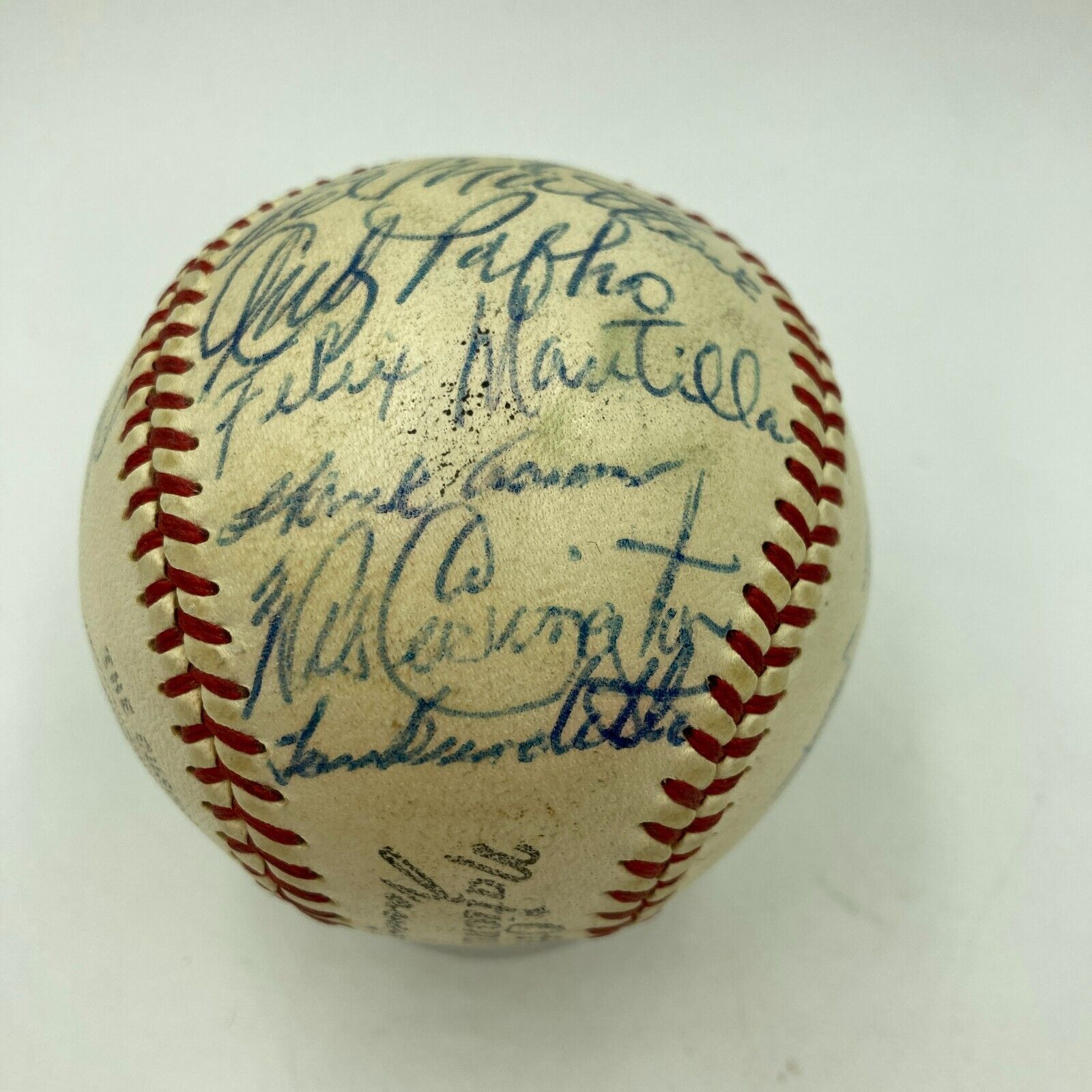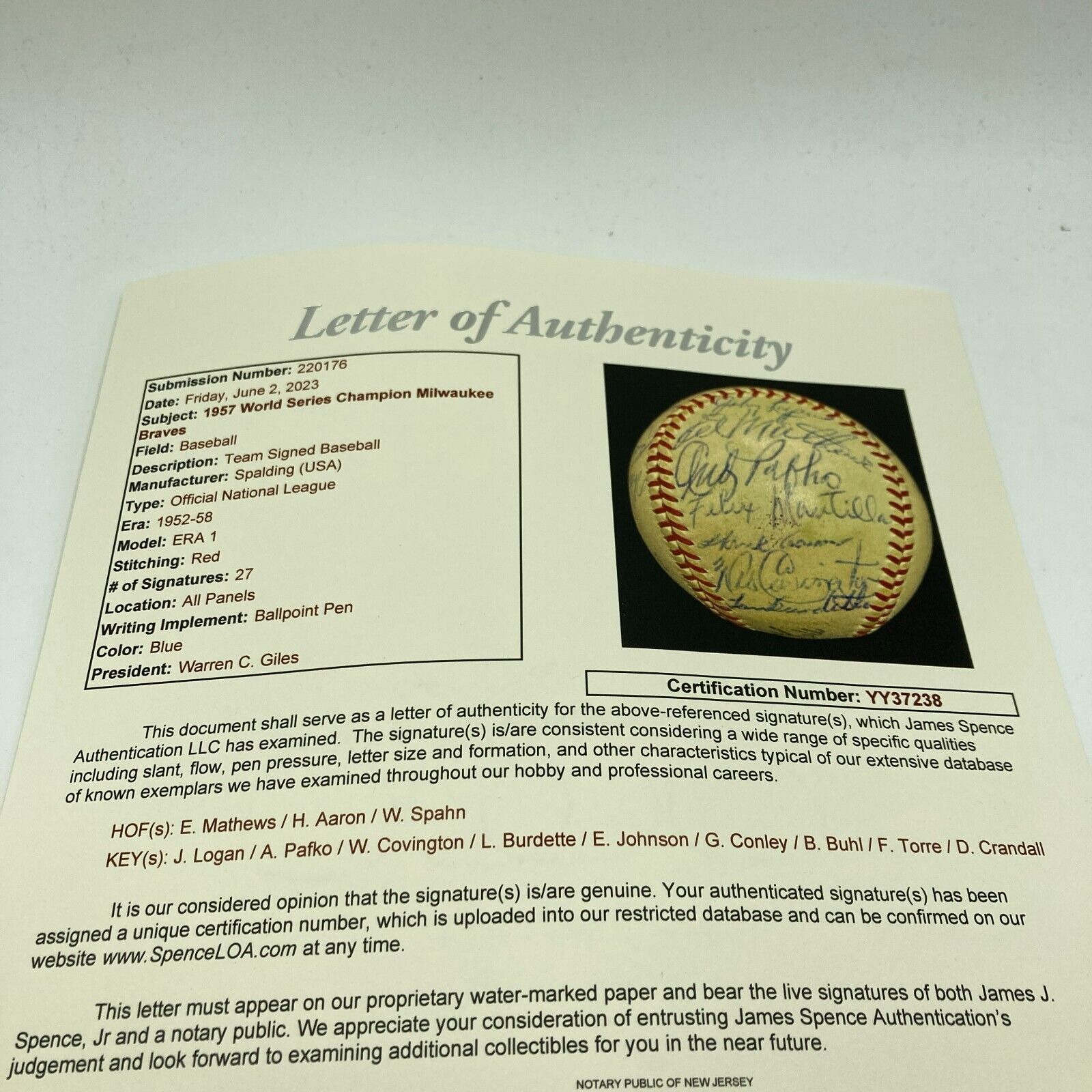 Beautiful 1957 Milwaukee Braves World Series Champs Team Signed Official National League Baseball. 27 bold blue ink signatures with Hank Aaron, Eddie Mathews, Warren Spahn and the rest of the team.