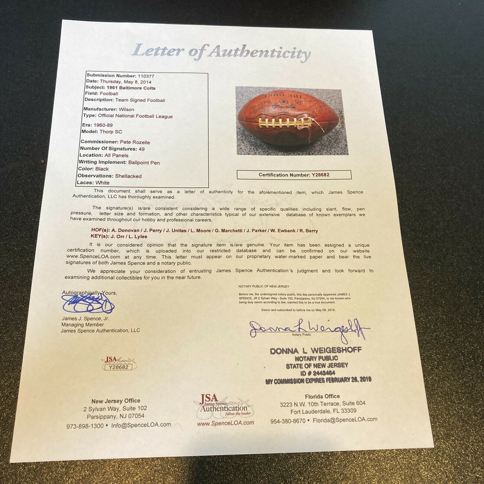 Key Signatures Art Donovan, Joe Perry, Johnny Unitas, Lenny Moore, Gary Marchetti, Jim Parker, Weeb Eubanks, Raymond Berry and Jimmy Orr. Full letter JSA COA.