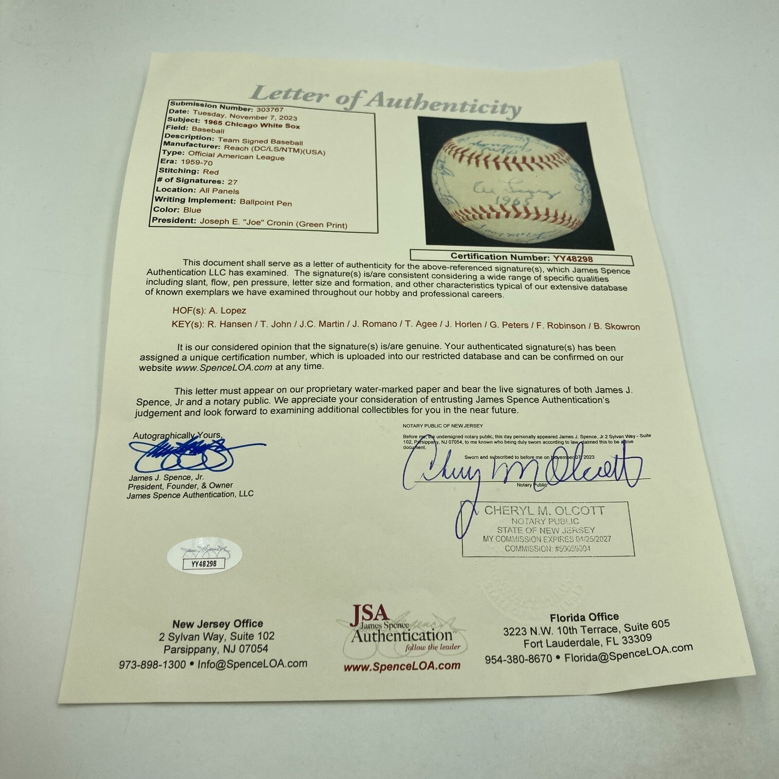 Offered is an Official American League Joseph Cronin baseball signed by 27 members of the 1965 Chicago White Sox. Key signatures on the ball include those of Hall of Famer Al Lopez, Ron Hansen, Tommy John, Johnny Romano, Tommie Agee, Joe Horlen, Gary Peters, Floyd Robinson, and Bill Skowron. The ball comes with an LOA fro, JSA for the signatures.