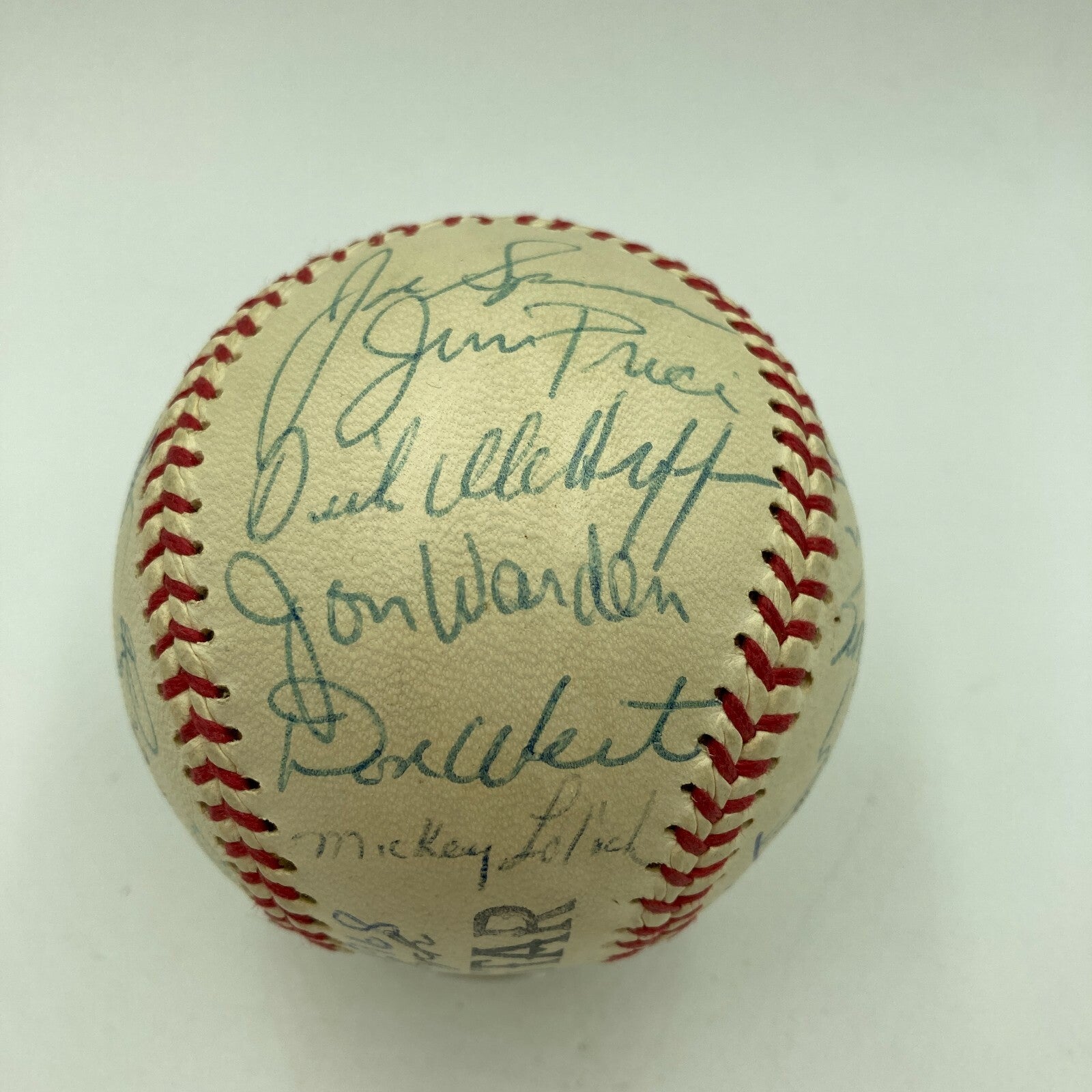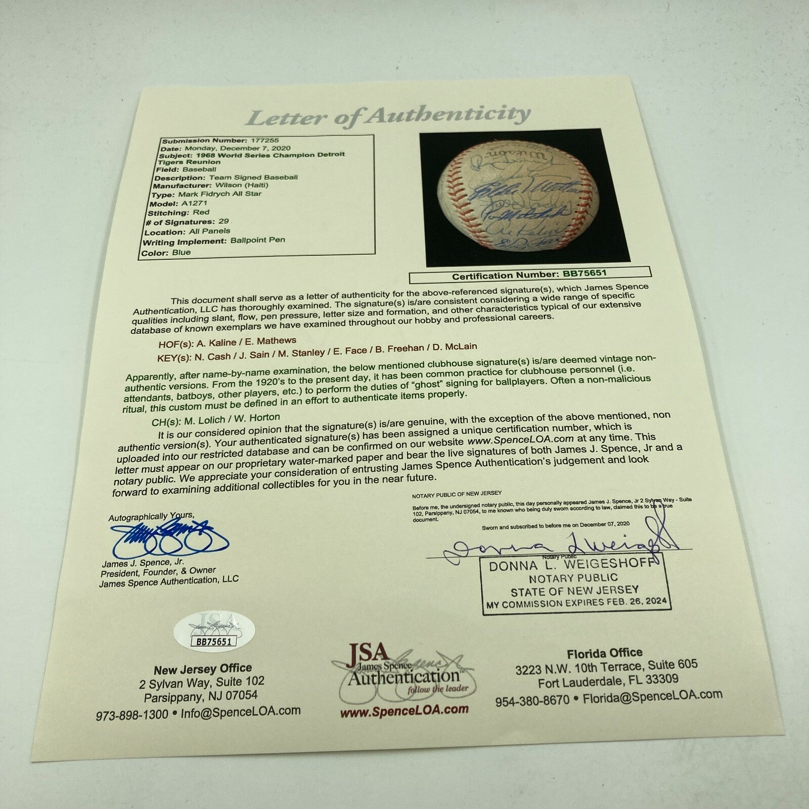 This baseball is signed by 29 members of the 1968 World Champion Detroit Tigers team, with Wally Moses and Jim Northrup on the sweet spot. Other signatures include: Al Kaline, Eddie Mathews, Norm Cash, John Sain, Mickey Stanley, Elroy Face, Bill Freehan, Denny Mclain and more.There are some CH signatures. Full LOA from JSA.