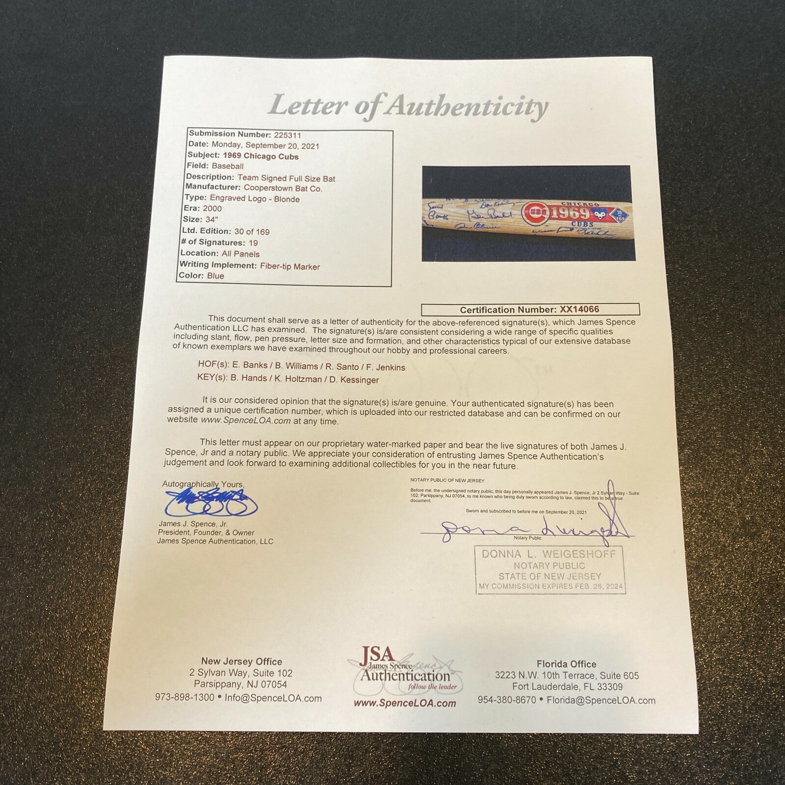 Offered is a 34" Cooperstown Bat. Co. special edition 1969 Chicago Cubs commemorative bat which has been signed by 19 team members including Ernie Banks, Rich Nye, Glenn Beckert, Gene Oliver, Billy Williams, Ron Santo, Ken Holtzman, Jim Hickman, Al Spangler, Willie Smith, Nate Oliver, Bill Hands, Fergie Jenkins, Paul Popovich, Jimmy Qualls, Randy Hundley, Ken Rudolph, Phil Regan and Don Kessinger. Full letter JSA COA.