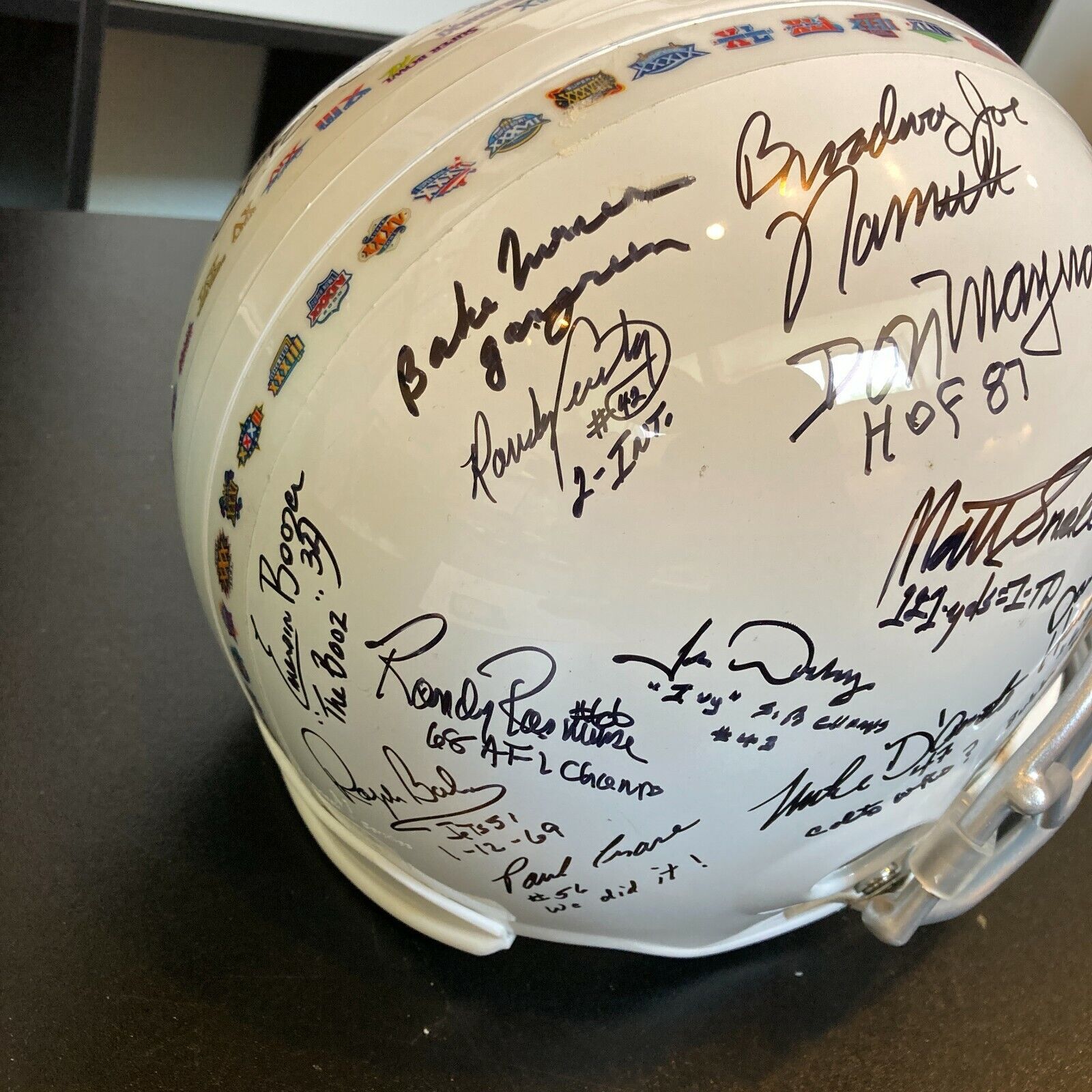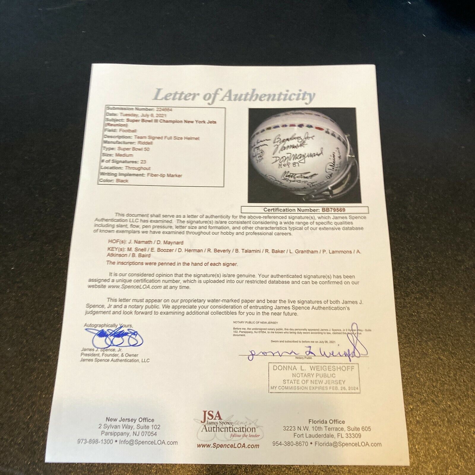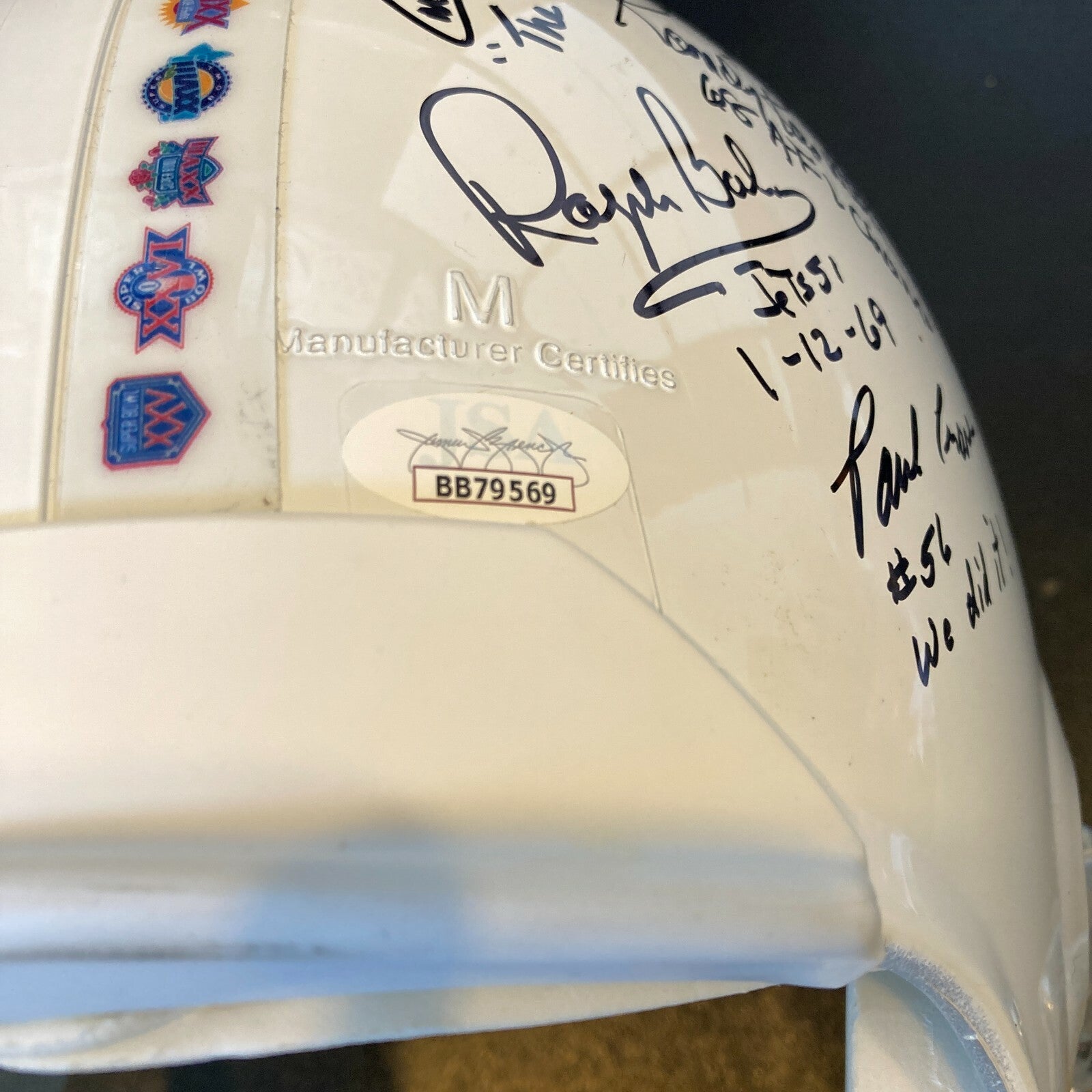 Beautiful 1969 New York Jets Super Bowl Champs Team Signed Full Size Super Bowl Helmet . Each player inscribed a cool inscription by their signature. 23 Signatures with Joe Namath and the rest of the team.