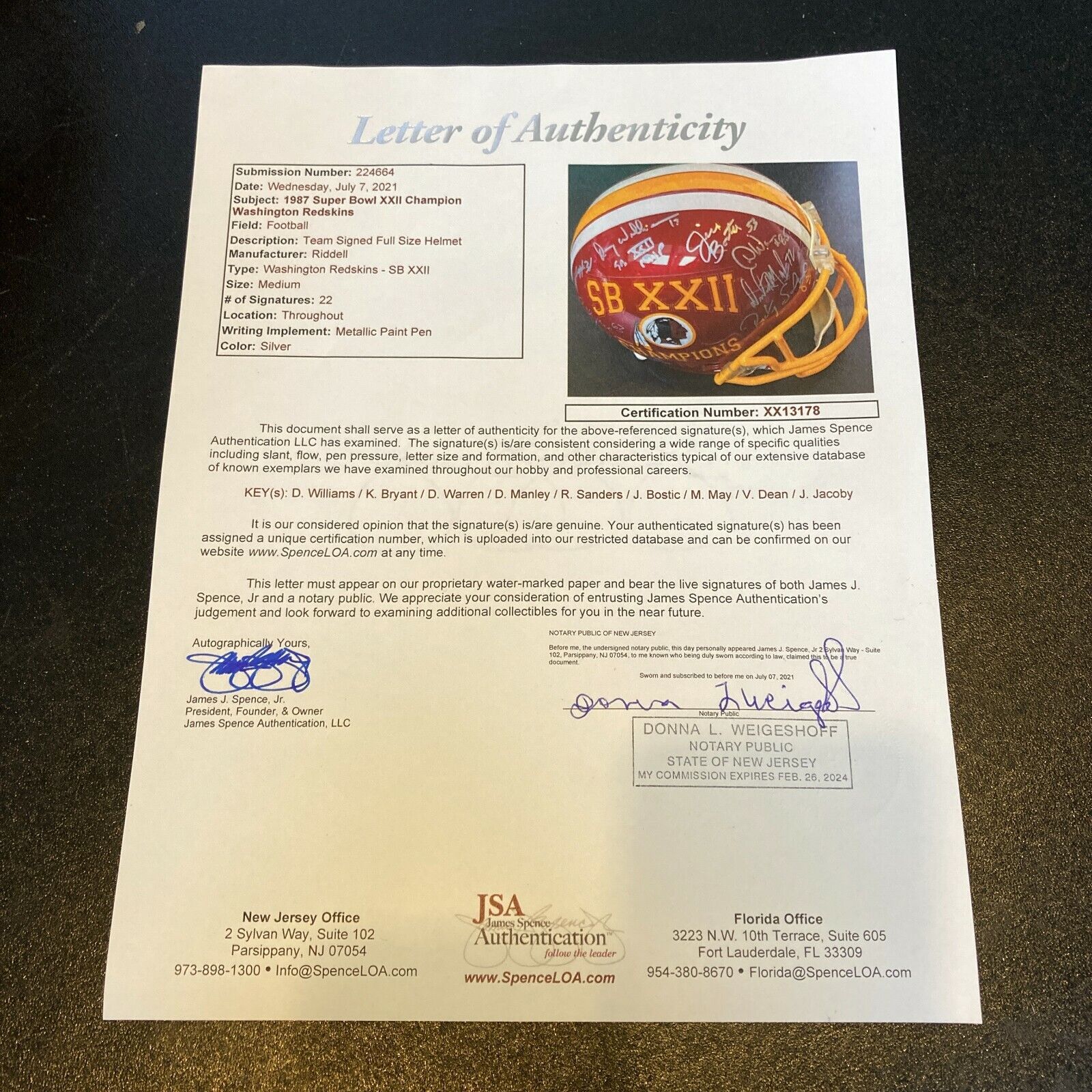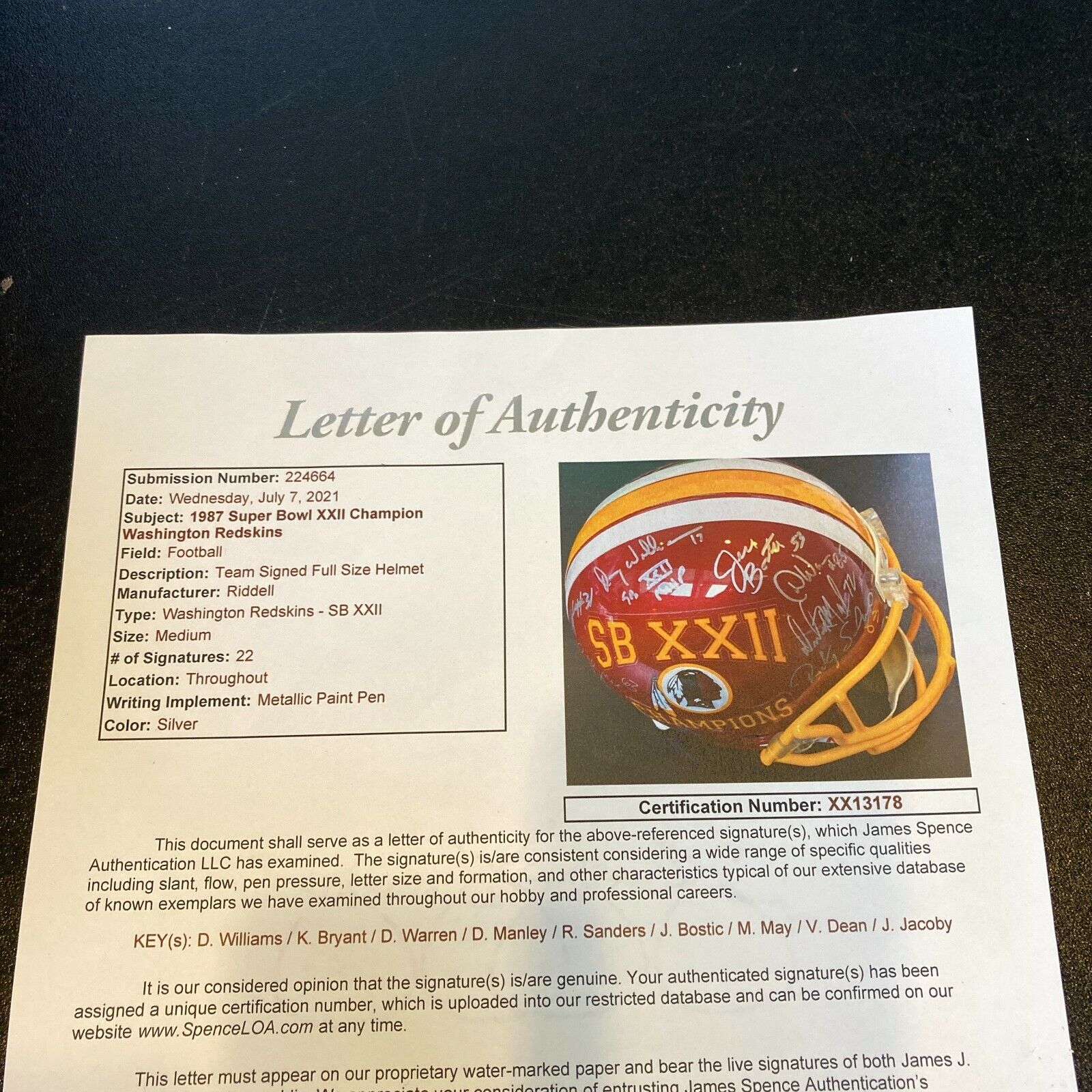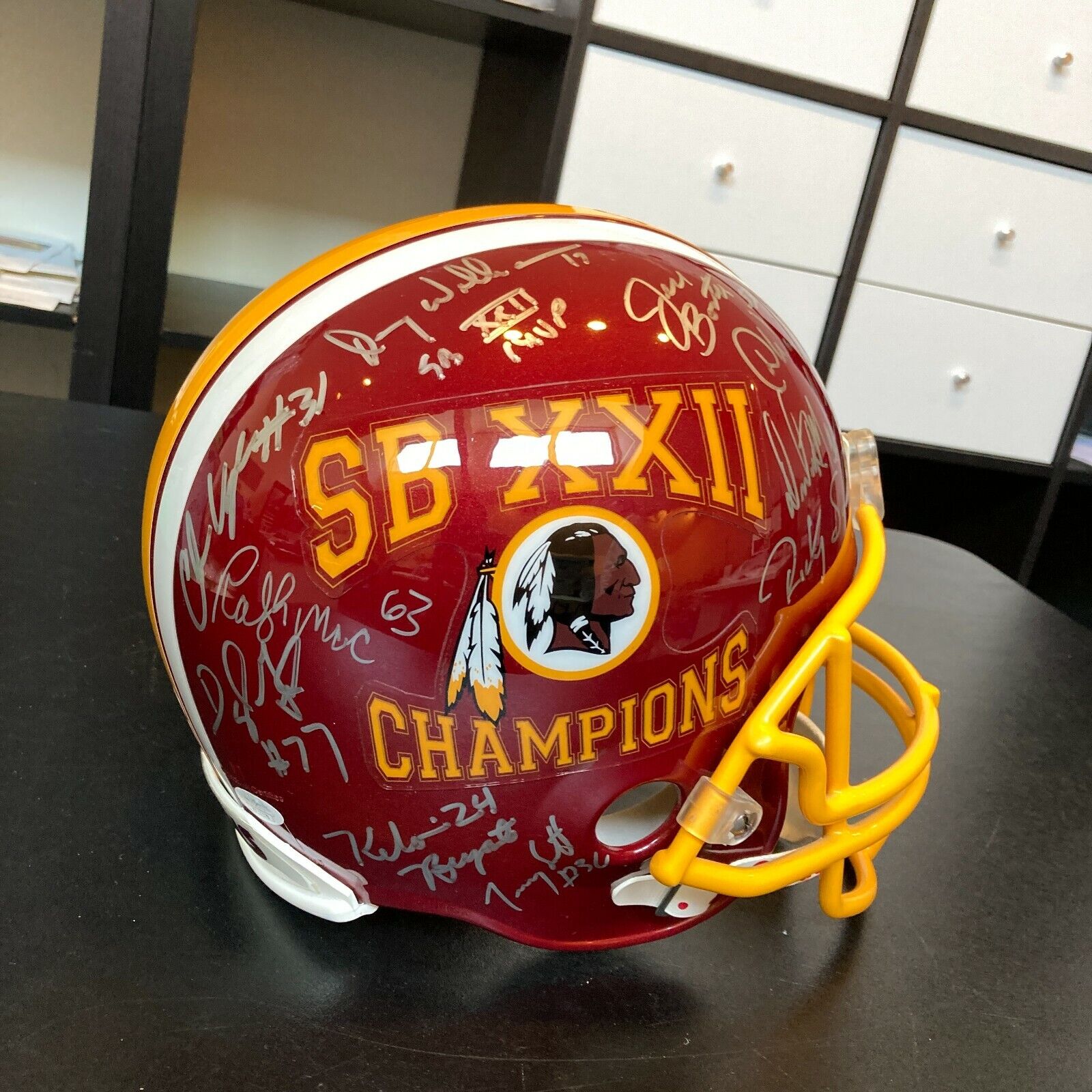 1987 Washington Redskins team signed helmet - Super Bowl XXII Champions. Full size helmet by Riddell has the Redskins team logo on one side and an "SB XXII Champions" decal on the opposite. Signed by (22) incl. Doug Williams, Dexter Manley, Joe Jacoby, Raleigh McKenzie, Jeff Bostic, and the rest of the team.