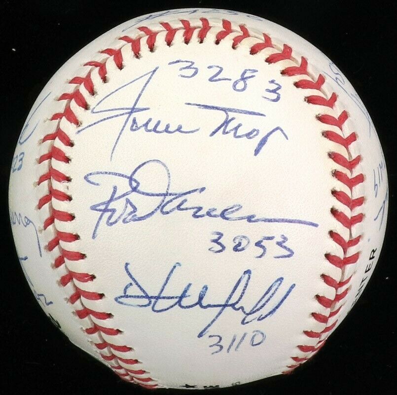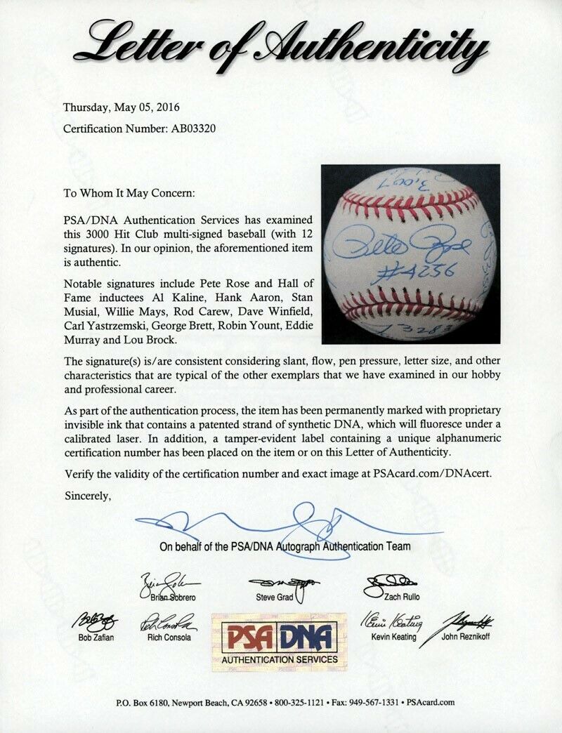 This baseball has been signed by 12 members of the 3,000-Hit Club including Pete Rose, Carl Yastrzemski, Al Kaline, Hank Aaron, Stan Musial, Rod Carew, Dave Winfield, George Brett, Robin Yount, Willie Mays, Lou Brock and Eddie Murray. Strong signatures on this Official National League baseball which includes total hit inscriptions from everyone but Eddie Murray. Accompanied by an LOA from PSA/DNA.