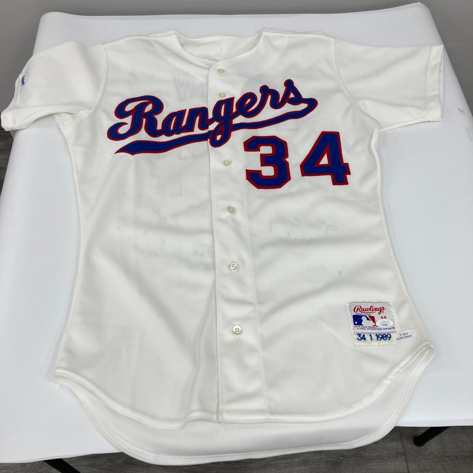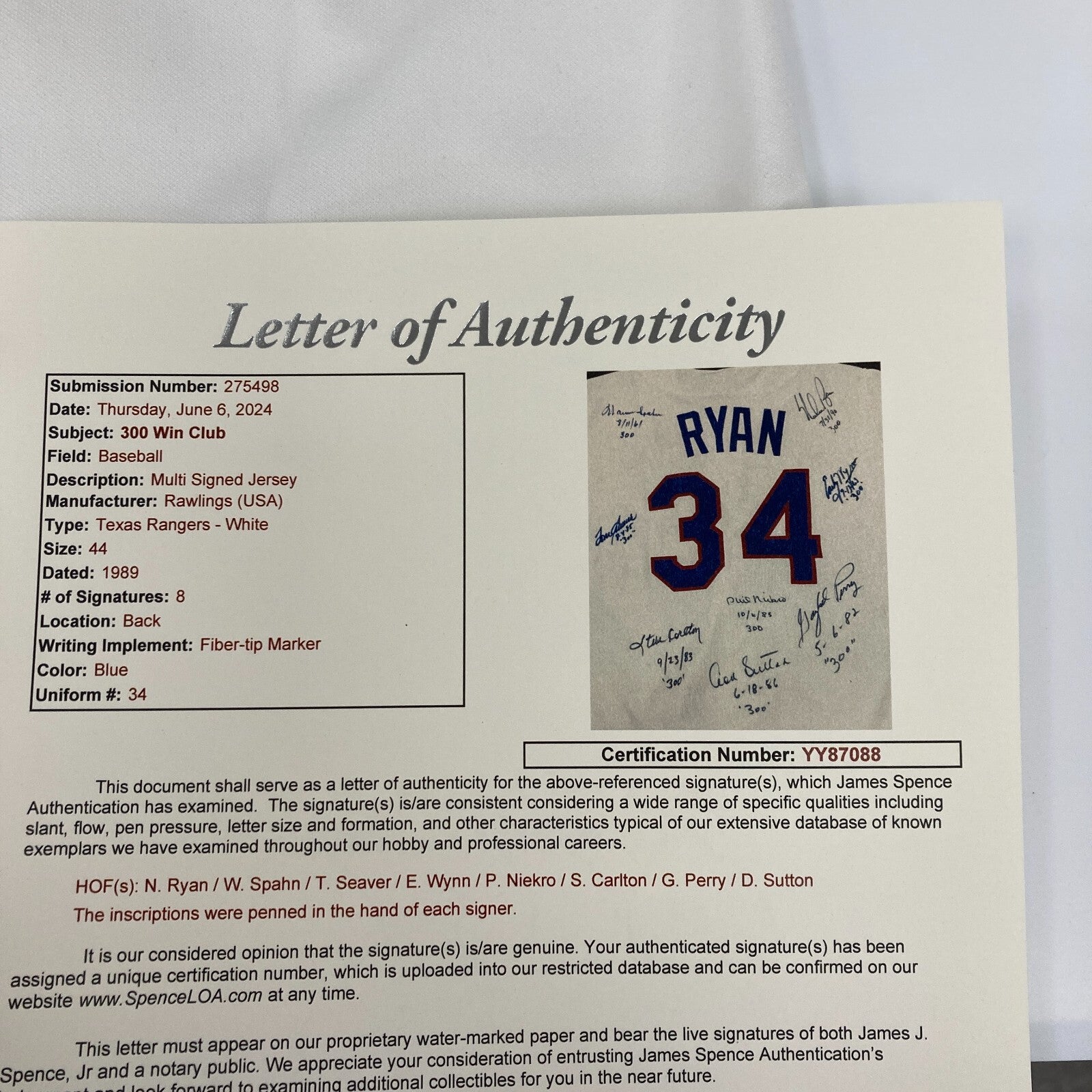 Nolan Ryan Texas Rangers 1989 Game Model home jersey signed in blue marker on the reverse by eight members of the 300 Win Club. Each player has added the date he became a member of this exclusive fraternity with his signature. The signatures on this jersey are Warren Spahn, Tom Seaver, Steve Carlton, Phil Niekro, Don Sutton, Gaylord Perry, Nolan Ryan, and Early Wynn. Rawlings (size 44) jersey.
