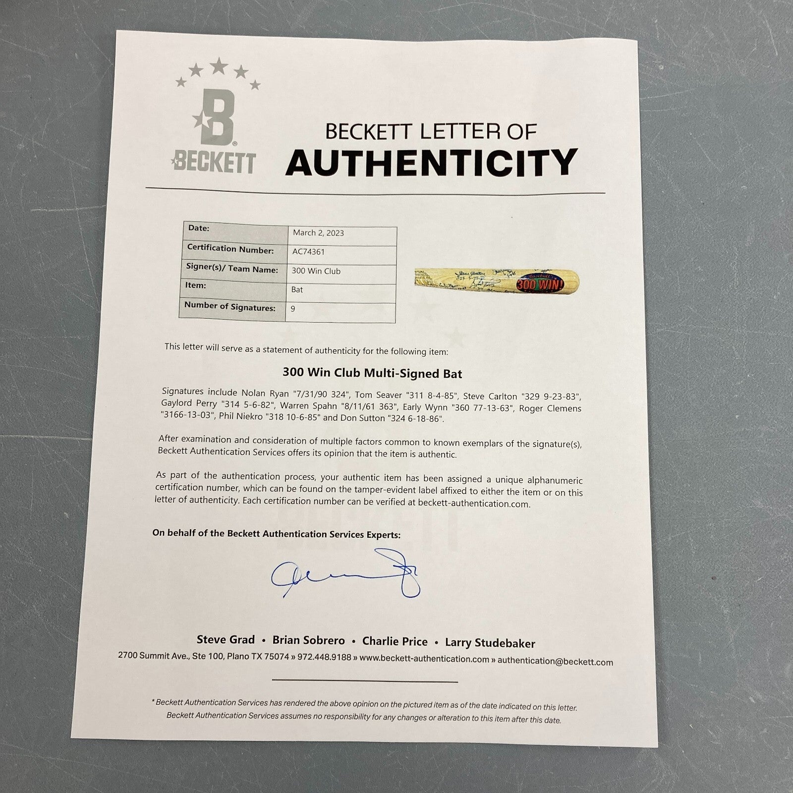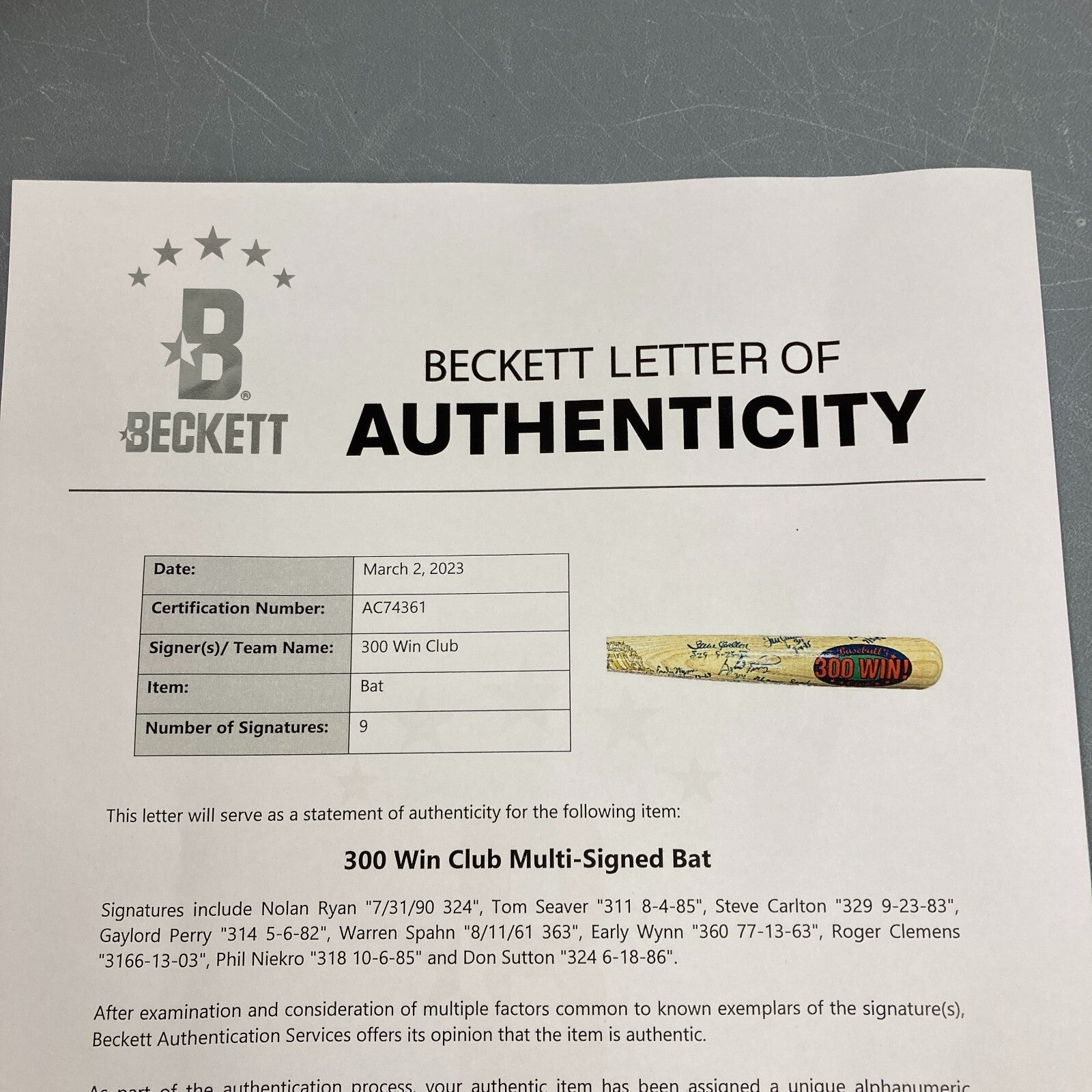 This Cooperstown 300 Win Club Commemorative Baseball Bat has been personally signed by Steve Carlton, Tom Seaver, Nolan Ryan, Early Wynn, Gaylord Perry, Warren Spahn, Roger Clemens, Phil Niekro, and Don Sutton. Each player has inscribed their number of wins as well as the date in which they hit 300. Overall in fine condition. Comes with Beckett COA.