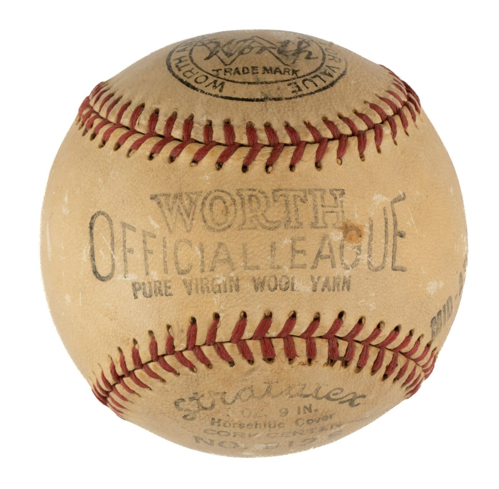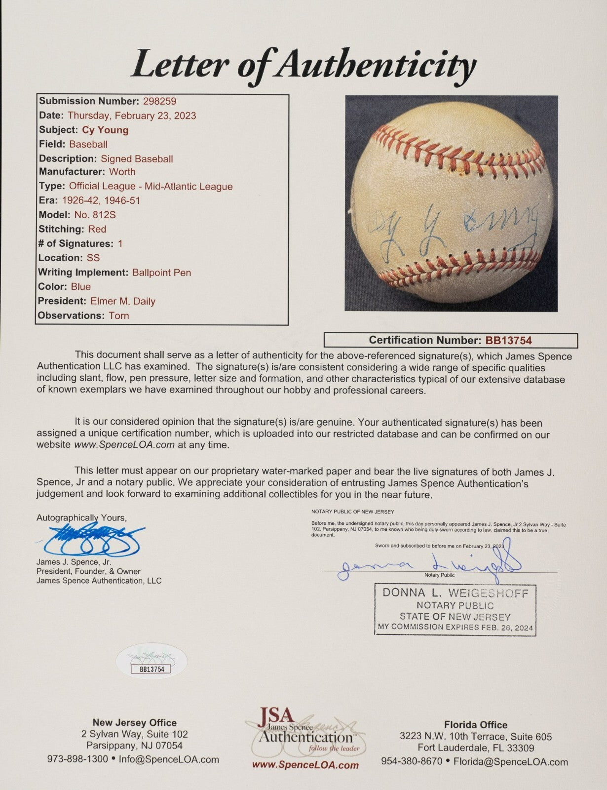 Worth "Official League Mid-Atlantic League" baseball signed by Hall of Fame pitcher Cy Young, baseball's all-time leader in wins with 511. Young's signature has been scripted in bold blue ink on the sweet spot. A Cy Young single-signed ball is a classic and is much rarer than most collectors realize. Because Young died in 1955, long before the preference of collectors for single-signed baseballs was firmly established, there are far fewer examples in the hobby than one would expect. One of the finest in existence. Full LOA from James Spence/JSA.