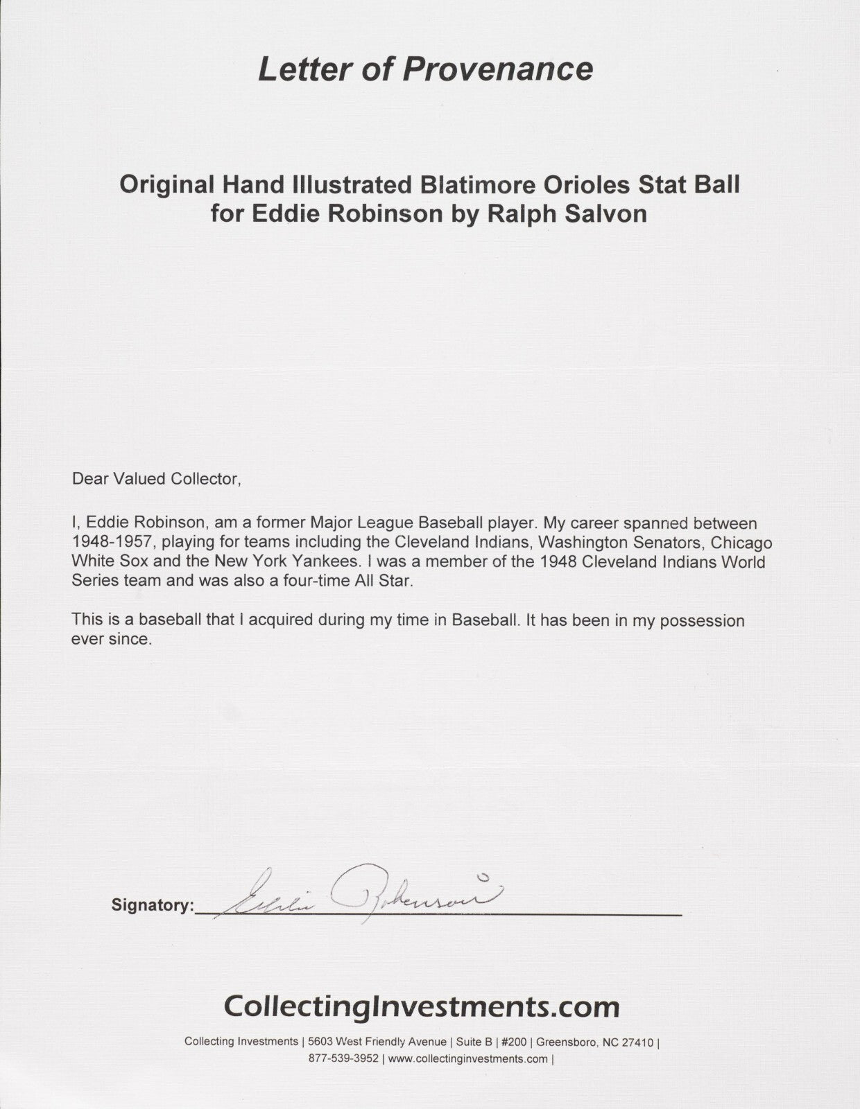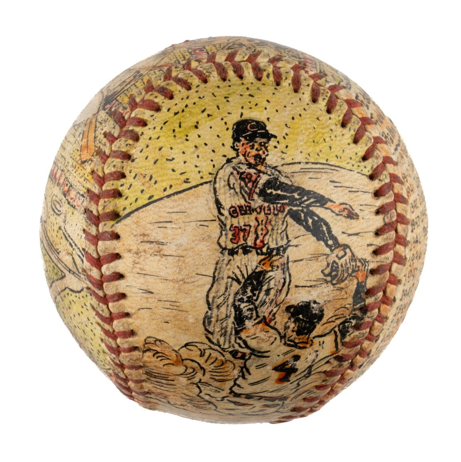 Elaborate folk-art tribute ball hand-painted by George Sosnak commemorating the baseball career of first baseman Eddie Robinson. Illustrations of Robinson, including a scene from his time with the Cleveland Indians, adorn two of the side panels, while much of the remaining surface area features meticulous hand-painted lettering. The other illustration recreates the Orioles logo. The text provides copious biographical information pertaining to Robinson's career, including a year-by-year listing of his batting statistics. Signed ("To Eddie Robinson/Best Wish/From/Ralph Salvon") and dated ("1961") on the sweet spot. In Very Good to Excellent condition. The ball comes with a one-page typed-signed letter of provenance from Eddie Robinson attesting to its authenticity.