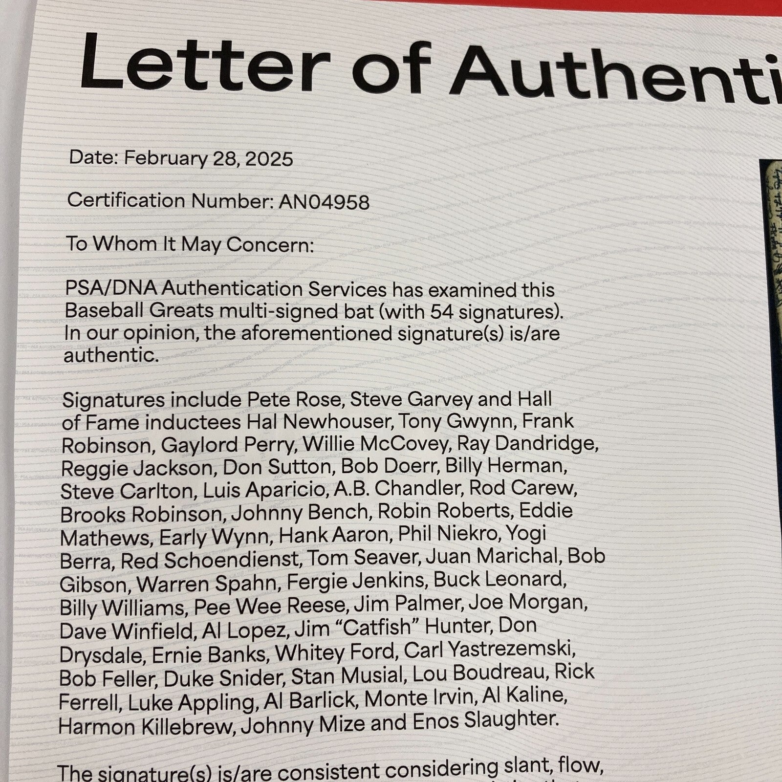 Beautiful Hall Of Fame Multi Signed Baseball Bat 54 Sigs Hank Aaron PSA DNA