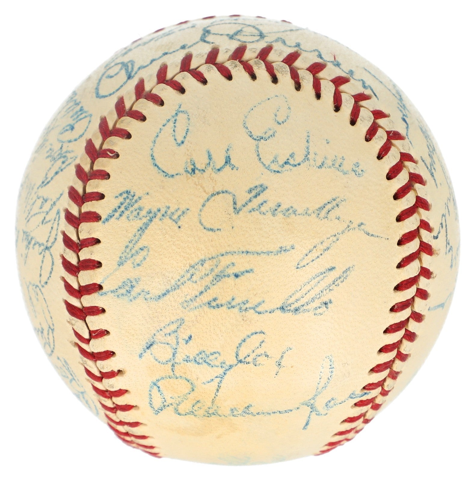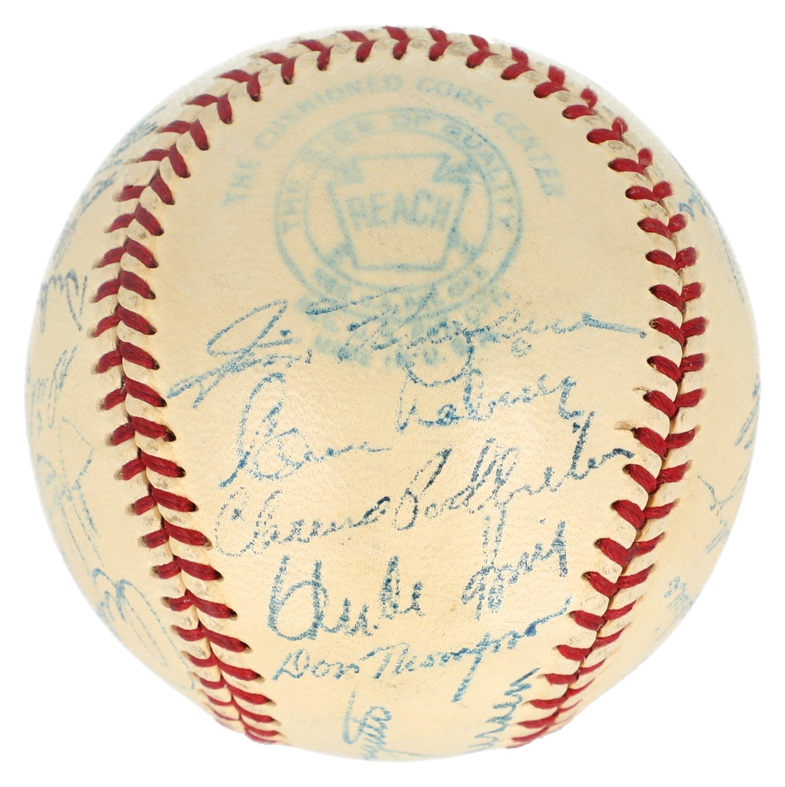 Presented is an Official American League (Harridge) baseball signed by members of the 1951 Brooklyn Dodgers team. Former Dodgers Hall of Famers and stars including Jackie Robinson, Gil Hodges, Pee Wee Reese, Duke Snider, Chuck Dressen, Dick Williams, Johnny Schmitz, Andy Pafko, Rube Walker, Phil Haugstad, Carl Eskrine, Wayne Terwilliger, Carl Furillo, Billy Cox, Preacher Roe, Rocky Bridges, Cal Abrams, Ralph Branca, Don Newcombe, Don Thompson, Clyde King, Don Podbielan, Clem Labine, Cookie Lavagetto, and Jim Russell have penned their blue ink signatures across the entirety of this baseball (26 signatures). The 1951 Dodgers would lead the MLB National League for the majority of the regular season, until the final game of a tie-breaker series with the New York Giants. Giants Bobby Thompson would thwart the Dodgers World Series hopes with a home run shot regarded as the "Shot Heard Around the World." The Dodgers roster would be one of the most star-studded in league history, with seven players being named to the MLB All-Star team in 1951, including Roy Campanella, Gil Hodges, Jackie Robinson, Don Newcombe, Pee Wee Reese, Preacher Roe, and Duke Snider. LOA from Beckett for the signatures accompanies (AE21230).