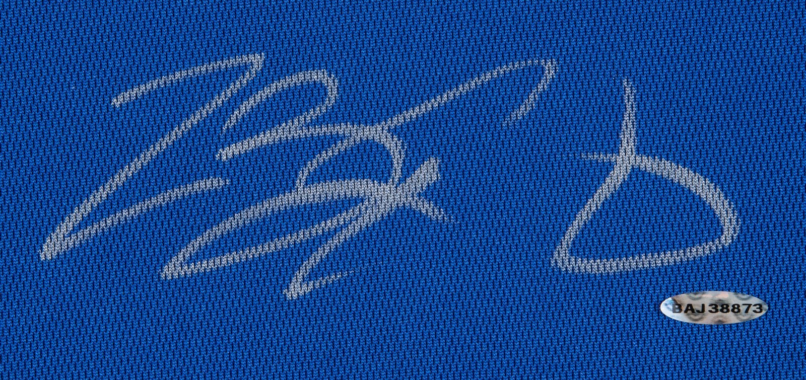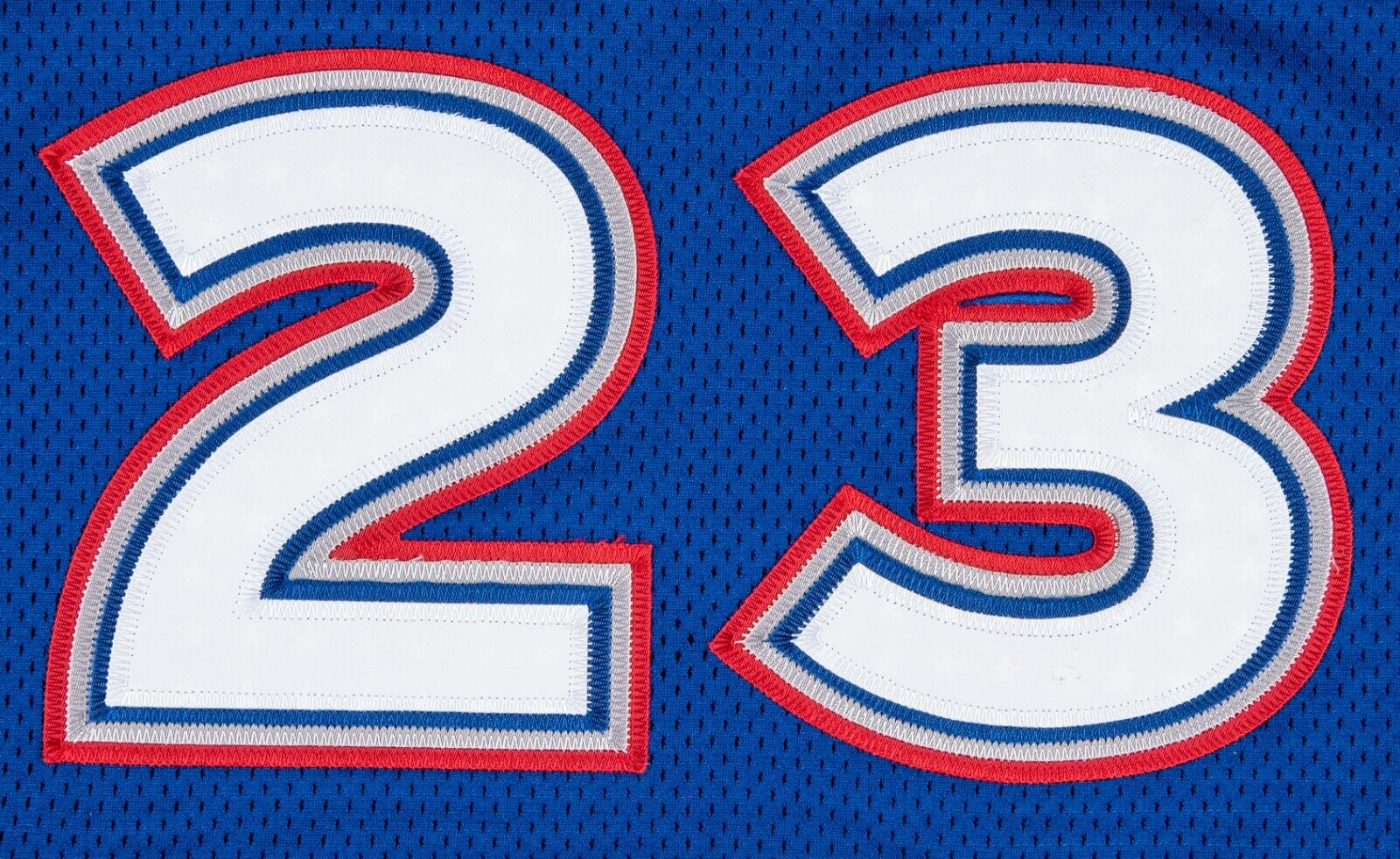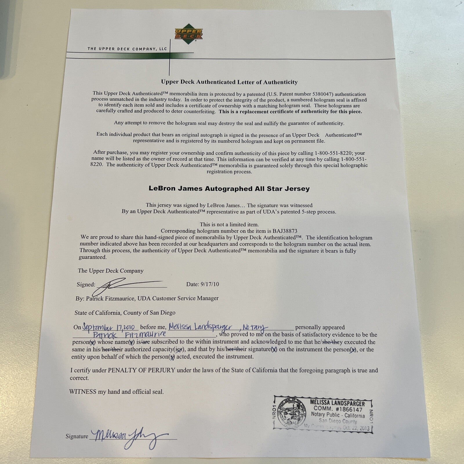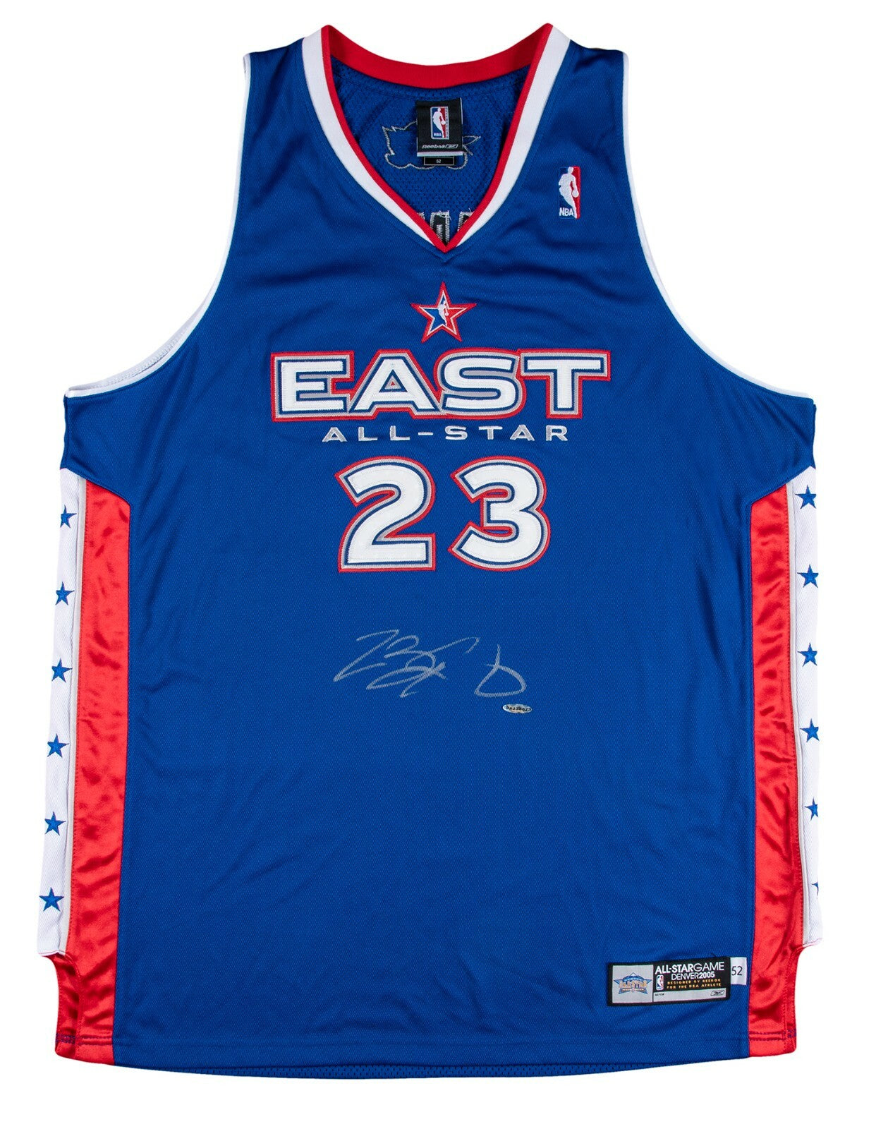 Presented is a 2005 LeBron James signed game model NBA All-Star Game jersey with his signature on the front center. This was LeBron's first All Star Game appearance in Denver during the 2004-05 season. James has signed his name in silver marker on this blue Reebok jersey from the 2005 NBA All-Star Game hosted by the Denver Nuggets. The blue jersey has the legend “EAST ALL-STAR” and “23” in red, white and blue tackle-twill letters and numbers on the front, below a five-point red, white and blue embroidered patch featuring the NBA logo. The left front shoulder has the full red, white and blue embroidered NBA logo. The back of the jersey has a red, white, navy and gold Cleveland Cavaliers logo patch at the top, the white letters “JAMES” below, and the red, white and blue tackle-twill number “23”. The right and left sides of the jersey have two red stripes, two silver stripes, and a white panel with six blue stars. The 54th NBA All-Star Game was played on February 20, 2005 at the Pepsi Center in Denver, with the East beating the West, 125-115. James had 13 points, 8 rebounds and 6 assists en route to the win, while Allen Iverson of the Philadelphia 76ers named the Most Valuable Player. Iverson scored 15 points, handed out 10 assists, and had 5 steals. This item comes with a LOA from Upper Deck Authenticated (BAJ38873).