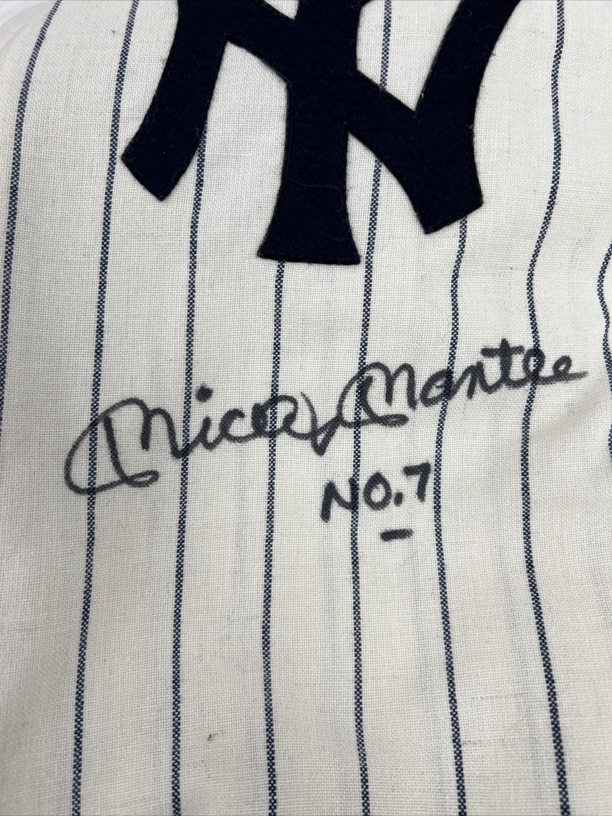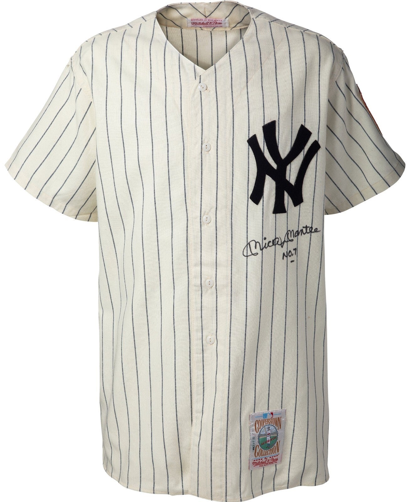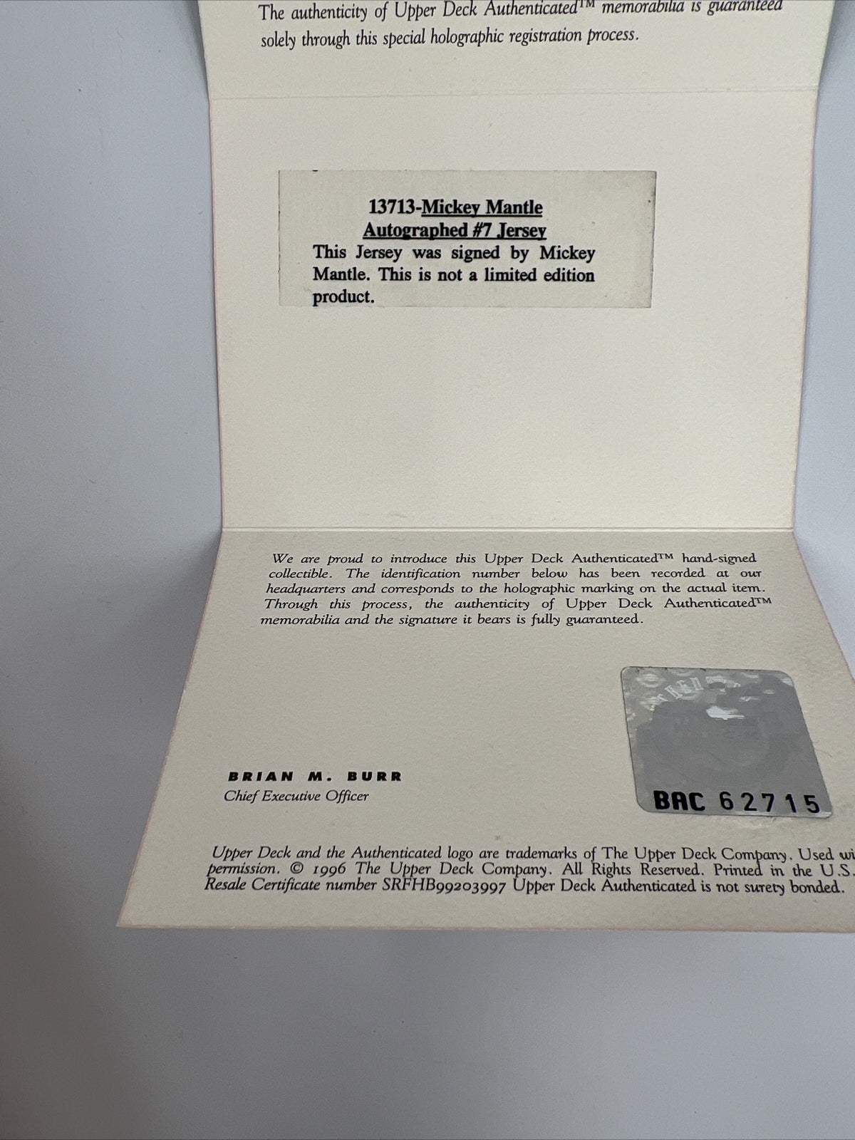 Mickey Mantle Signed New York Yankees Jersey with "No. 7" Inscription--Upper Deck Authenticated. Mitchell & Ness' flawless reproduction of the Mick's rookie home flannel, complete with the American League Golden Anniversary patch on the sleeve, is made even more desirable by the addition of an unimprovable black sharpie signature under the logo "NY," complete with desirable "No. 7" notation. Seasoned autograph collectors are aware that Mantle avoided signing jerseys and bats whenever he could, leaving behind a relatively tiny supply compared to the quantity of baseballs and photographs bearing his signature. You'll be hard pressed to find a superior example to the jersey we present here--this is the highly desirable Upper Deck breed. Complete with original UDA storage box. COA from Upper Deck Authenticated. Comes with full letter JSA COA graded MINT 9.