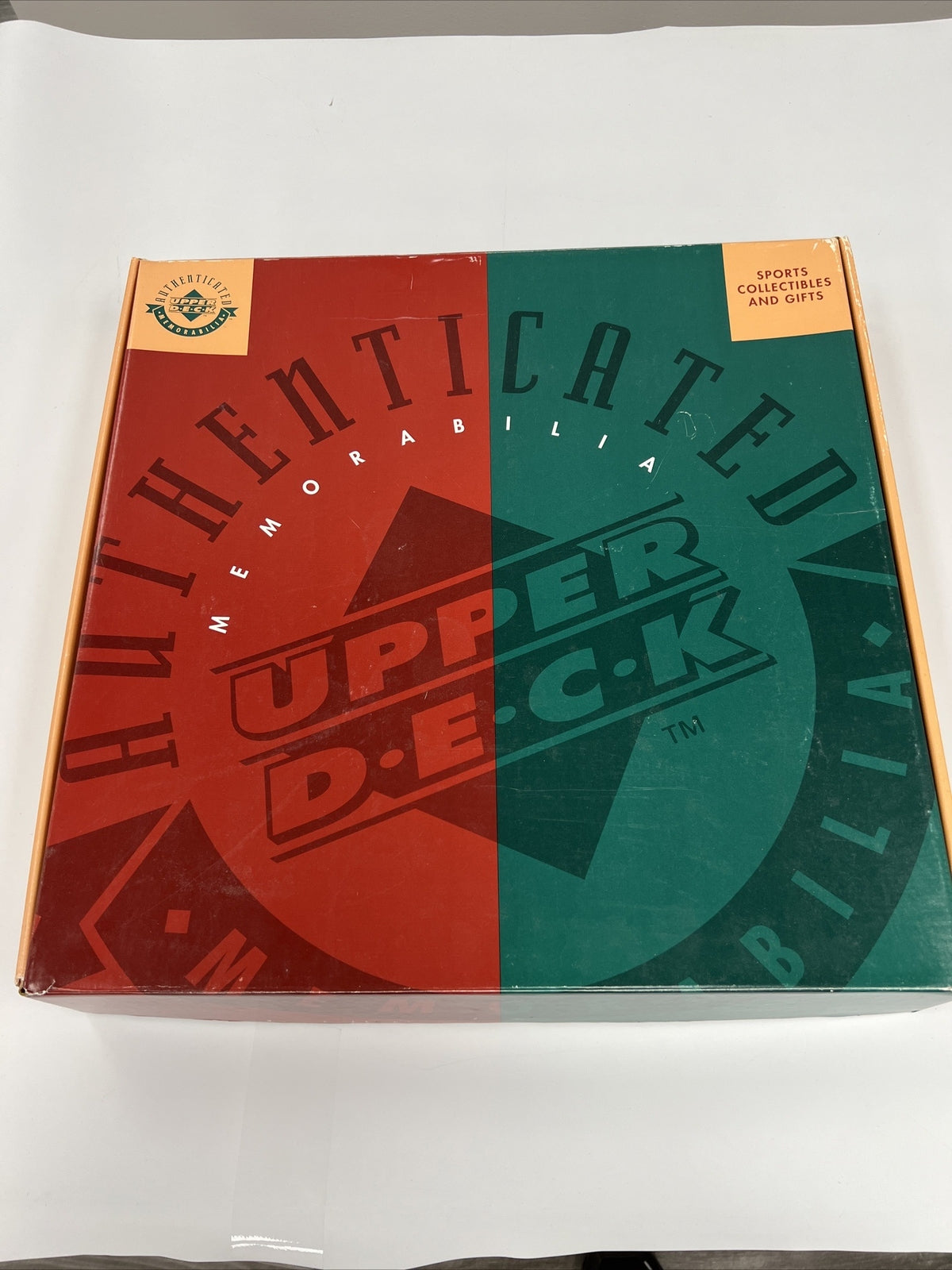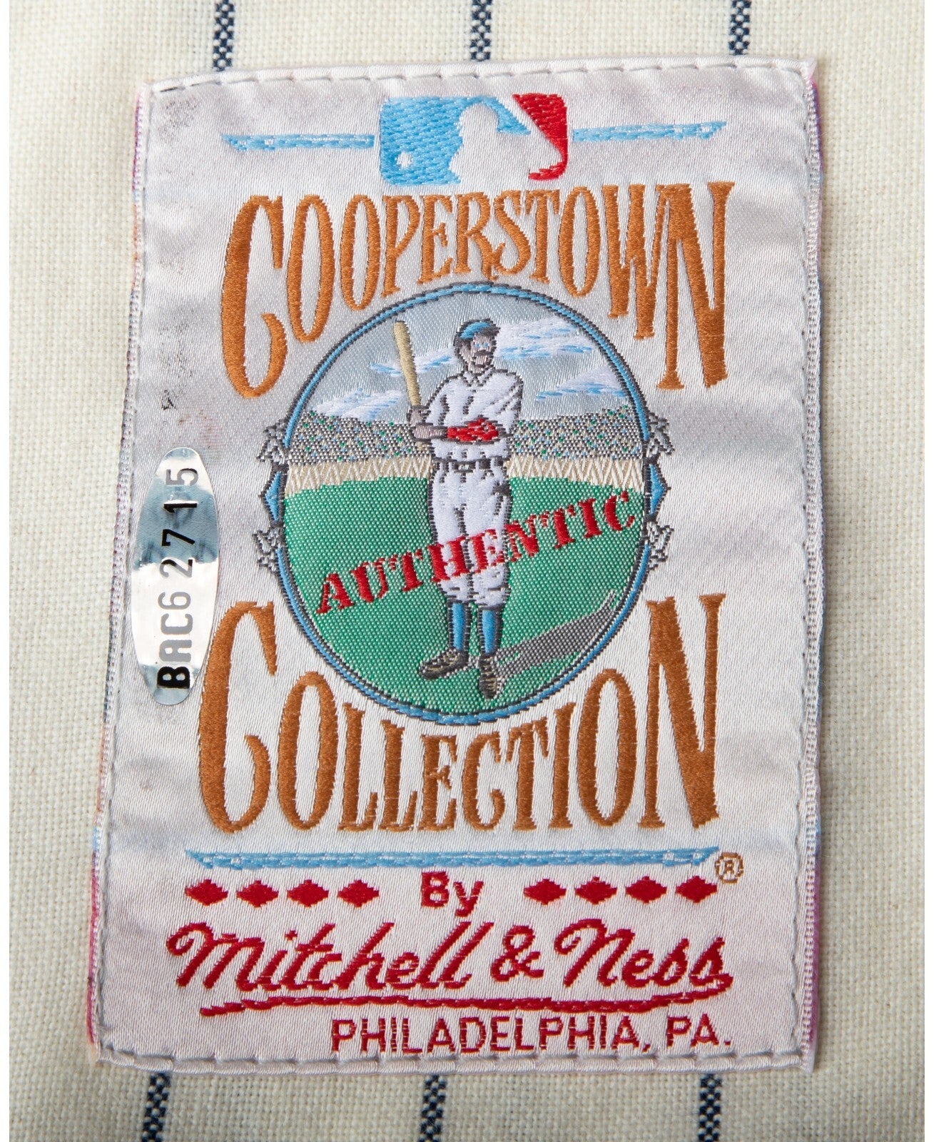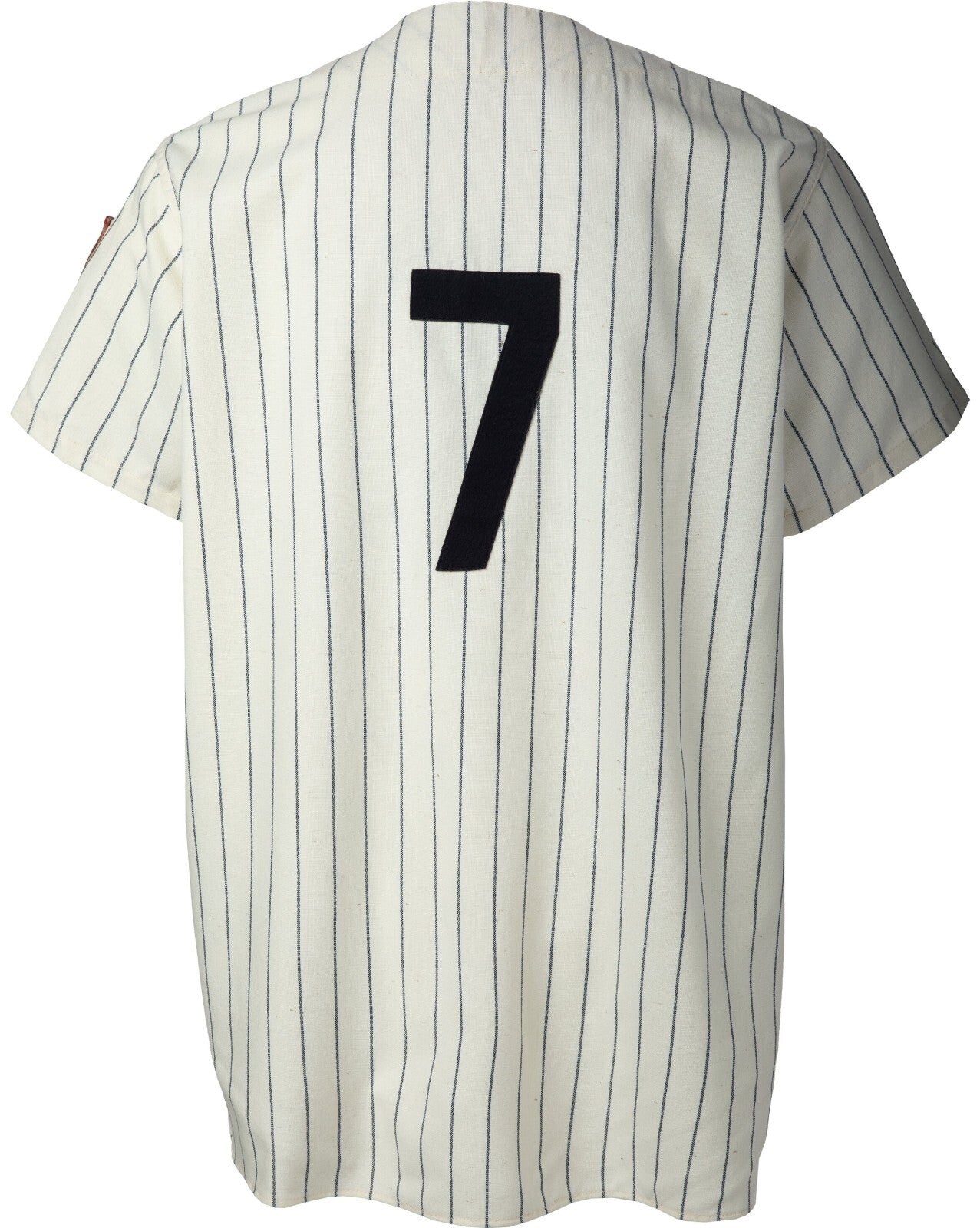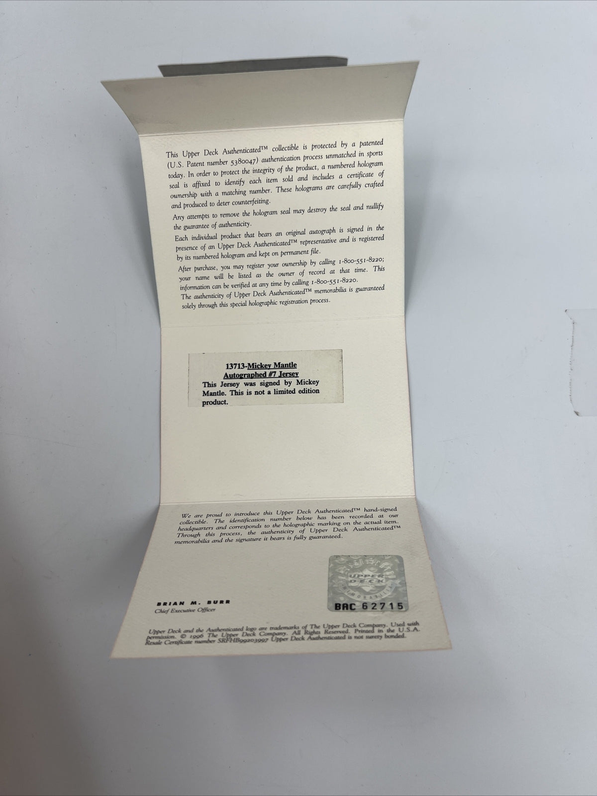 Mickey Mantle Signed New York Yankees Jersey with "No. 7" Inscription--Upper Deck Authenticated. Mitchell & Ness' flawless reproduction of the Mick's rookie home flannel, complete with the American League Golden Anniversary patch on the sleeve, is made even more desirable by the addition of an unimprovable black sharpie signature under the logo "NY," complete with desirable "No. 7" notation. Seasoned autograph collectors are aware that Mantle avoided signing jerseys and bats whenever he could, leaving behind a relatively tiny supply compared to the quantity of baseballs and photographs bearing his signature. You'll be hard pressed to find a superior example to the jersey we present here--this is the highly desirable Upper Deck breed. Complete with original UDA storage box. COA from Upper Deck Authenticated. Comes with full letter JSA COA graded MINT 9.