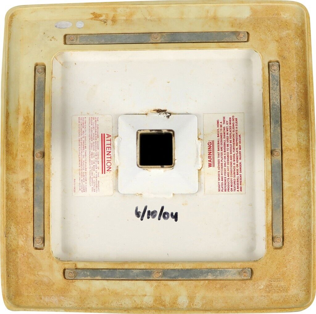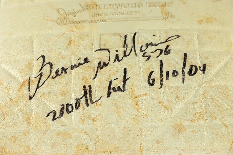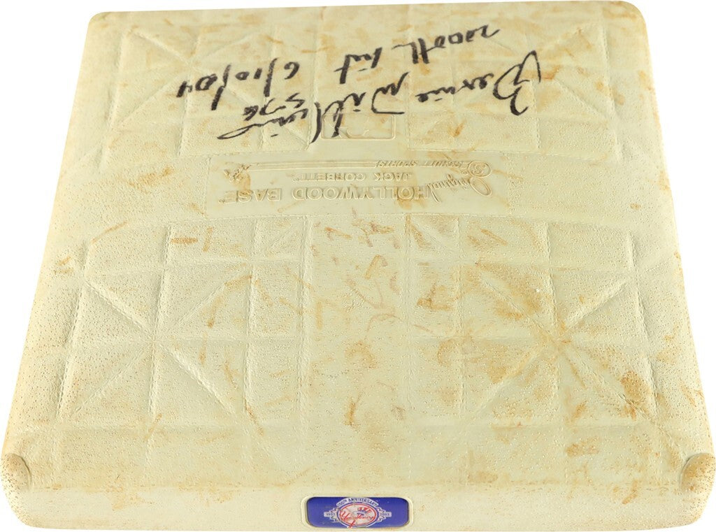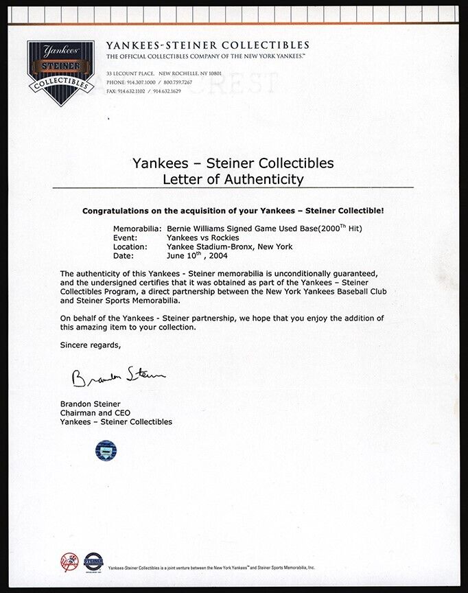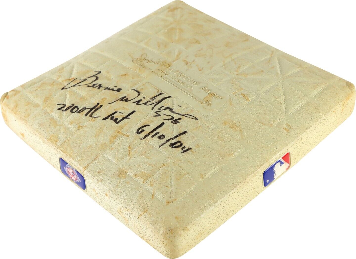 On June 10, 2004, in a game against the Colorado Rockies at Yankee Stadium, Yankees centerfielder Bernie Williams recorded the 2,000th hit of his career. At the time, it ranked him seventh on the Yankees' all-time hit list. Williams' 2,000th hit, a single into right field, occurred in the bottom of the fourth inning against Rockies starter Jason Jennings and was his third hit of the game in the Yankees' easy 10-4 win. Offered is a base used in that historic game that has also been signed by Williams. The base features the Yankees' "100th Anniversary" logo on two of the sides, and the MLB logo on the other two. Williams has inscribed the base in black marker (grading 9/10) "Bernie Williams 200th hit 6/10/04." The base was originally obtained directly from Steiner Sports, who has provided an LOA for the base and COA for the Williams signature. The base displays moderate use, including numerous soil marks. Williams eventually retired with 2,336 lifetime hits, all of which came in a Yankee uniform. Currently he ranks fifth on the Yankees' all-time hit list, behind only Derek Jeter, Lou Gehrig, Babe Ruth, and Mickey Mantle.