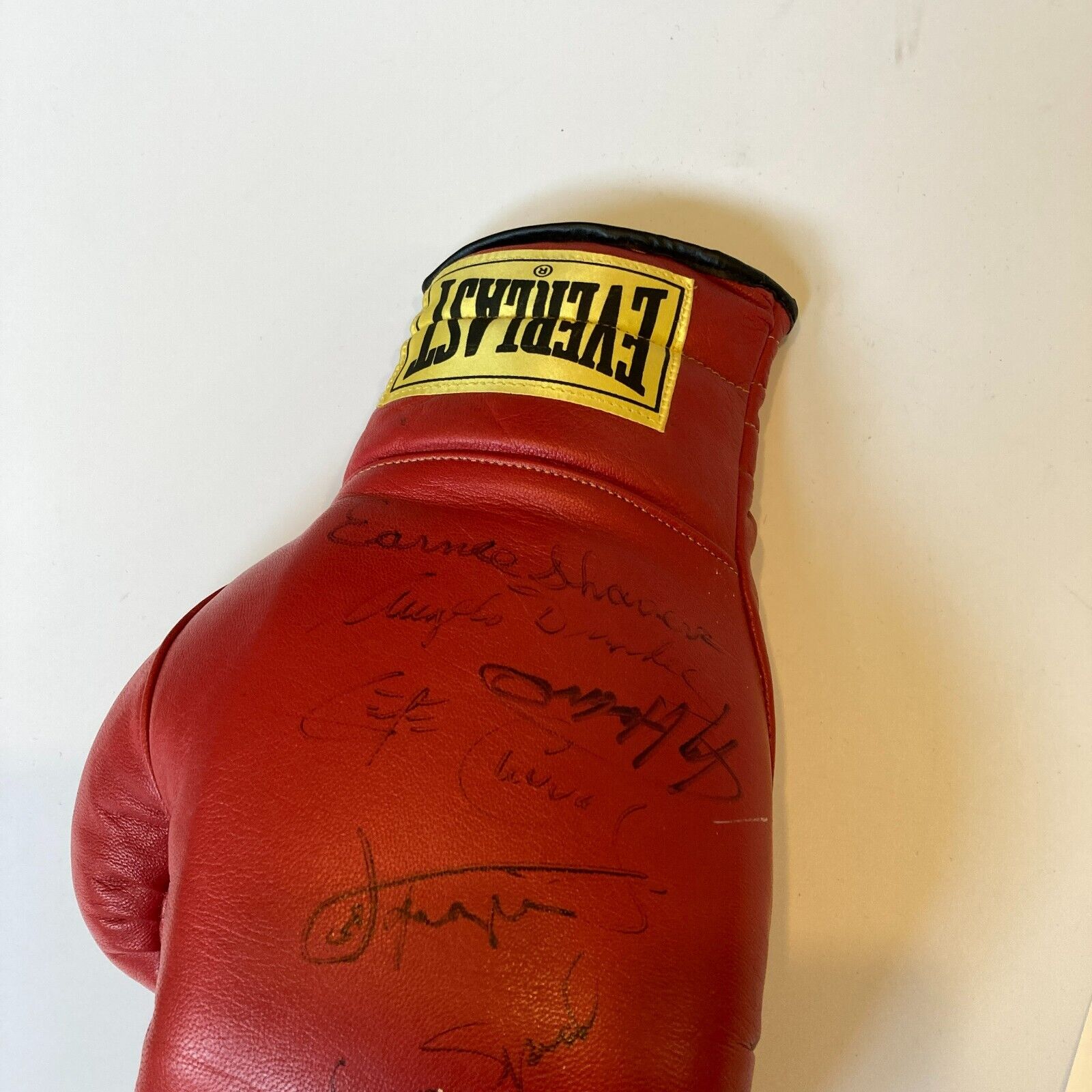 Boxing Legends Signed Glove. 10 sigs with Joe Frazier, Earnie Shavers, Larry Holmes, Ken Norton, Spinks, Dundee and others.
