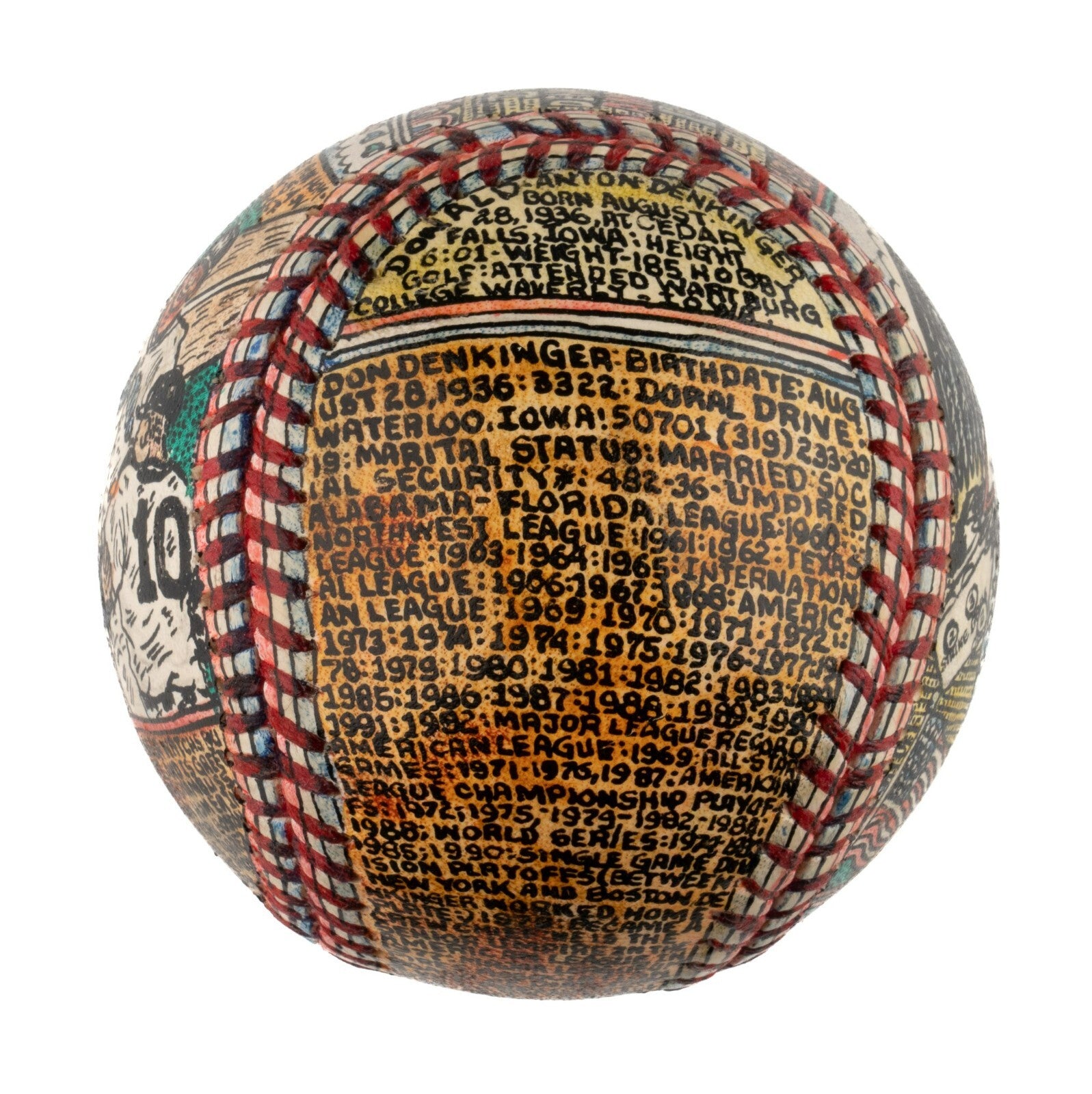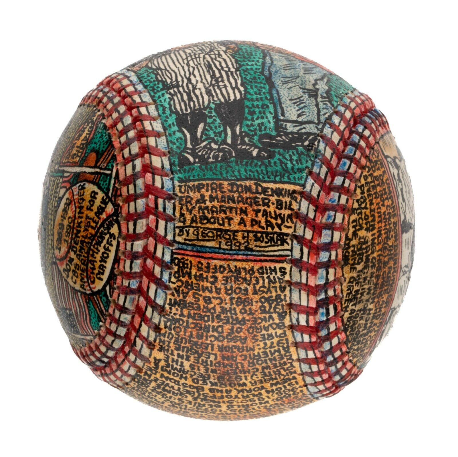Although Sosnak was a prolific artist, by some accounts creating over 800 illustrated baseballs, the popularity of his works has continued to grow with each passing decade. Sosnak is nearly as well known in the folk-art community as he is in the field of baseball collectibles, so it is no surprise that examples of his work can be found in both the Baseball Hall of Fame in Cooperstown, New York, and the American Folk Art Museum in New York City. One of Sosnak's balls (detailing JFK’s Opening Day pitch at a 1962 Senators game) can even be found in the John F. Kennedy Presidential Library. The three unadorned signature panels have light wear. The painted panels remain in Near Mint condition. The unadorned panels are in Very Good condition.